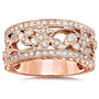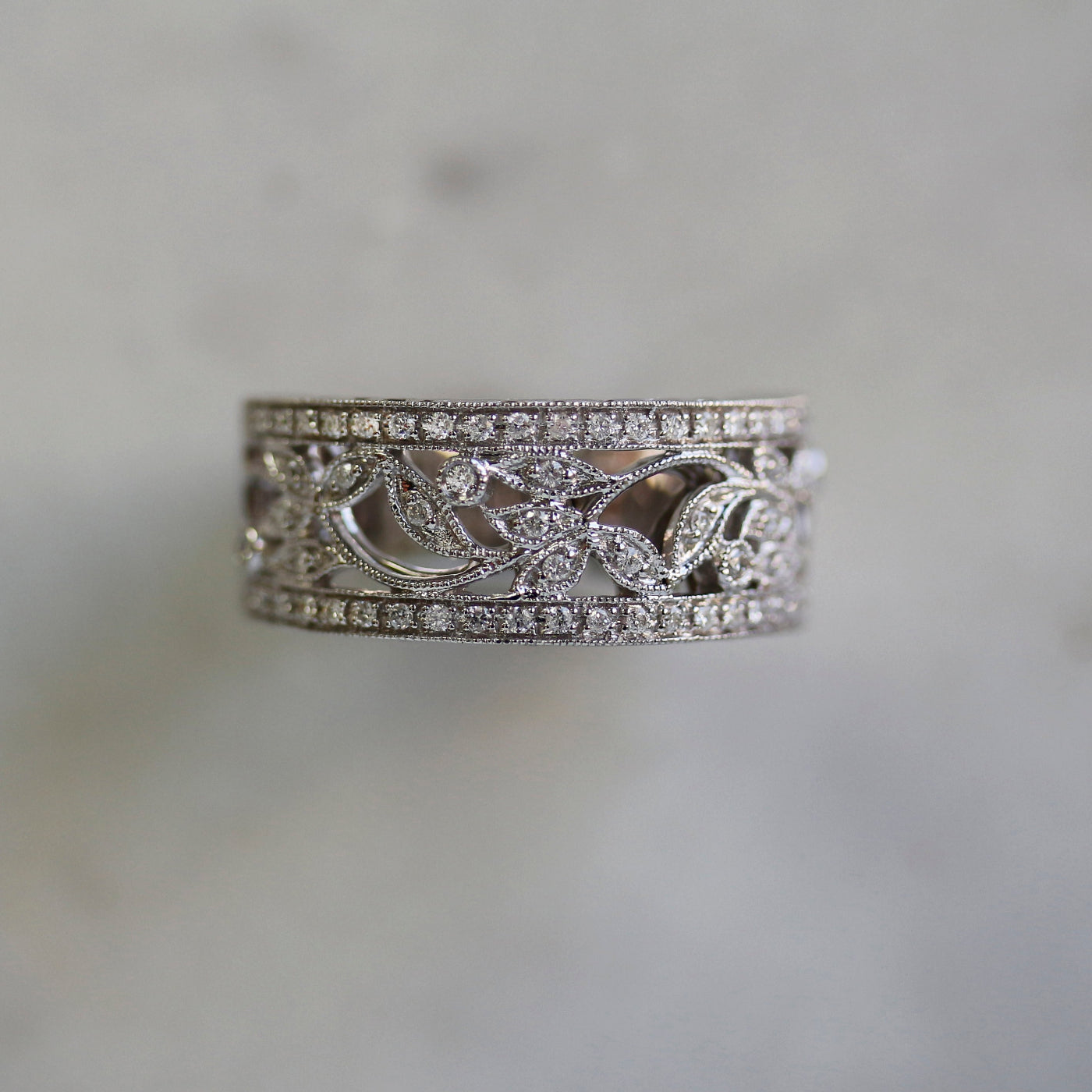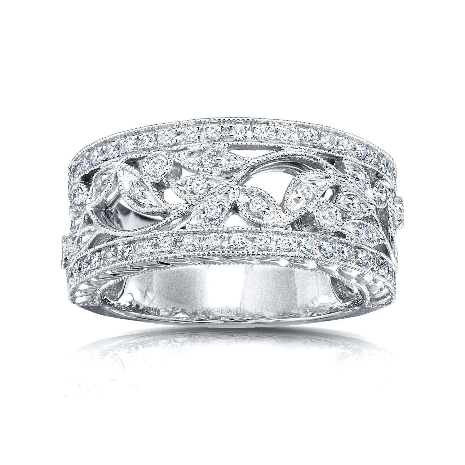 This Victorian Art Nouveau style anniversary ring is created on a wide band for a refined and festive treasure. This popular diamond ring from Kobelli promotes floral elements with the filigree makings. The vintage design promises a lifetime of love and beauty.