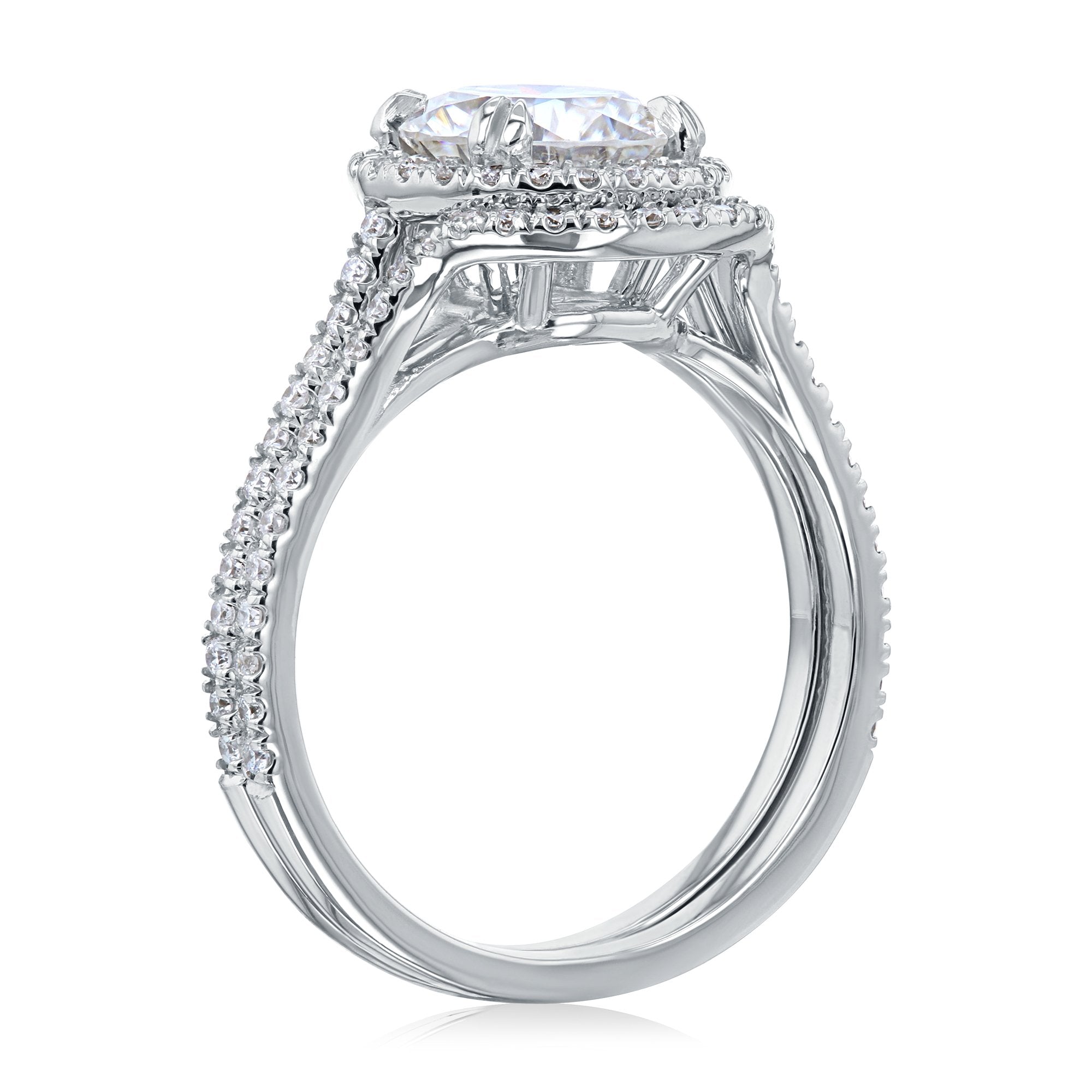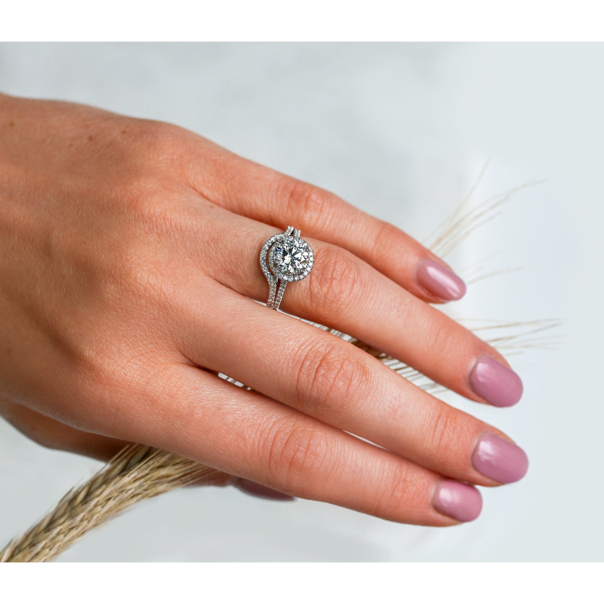 - Design Features: Contoured Wedding Band, Halo, Cathedral Setting, Basket Prongs