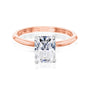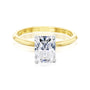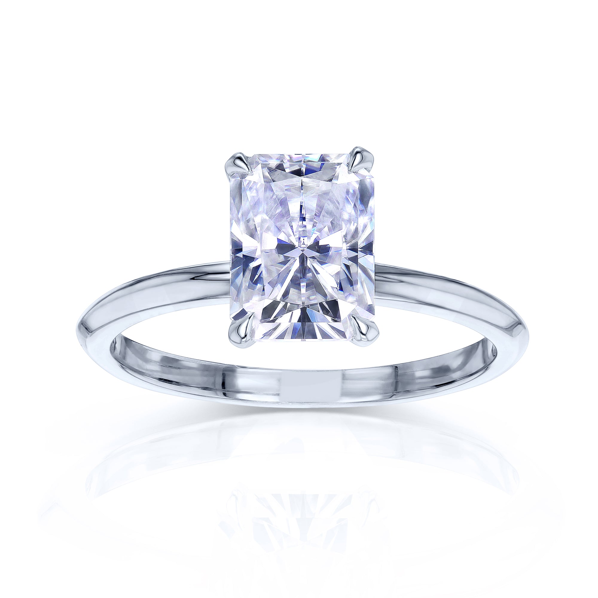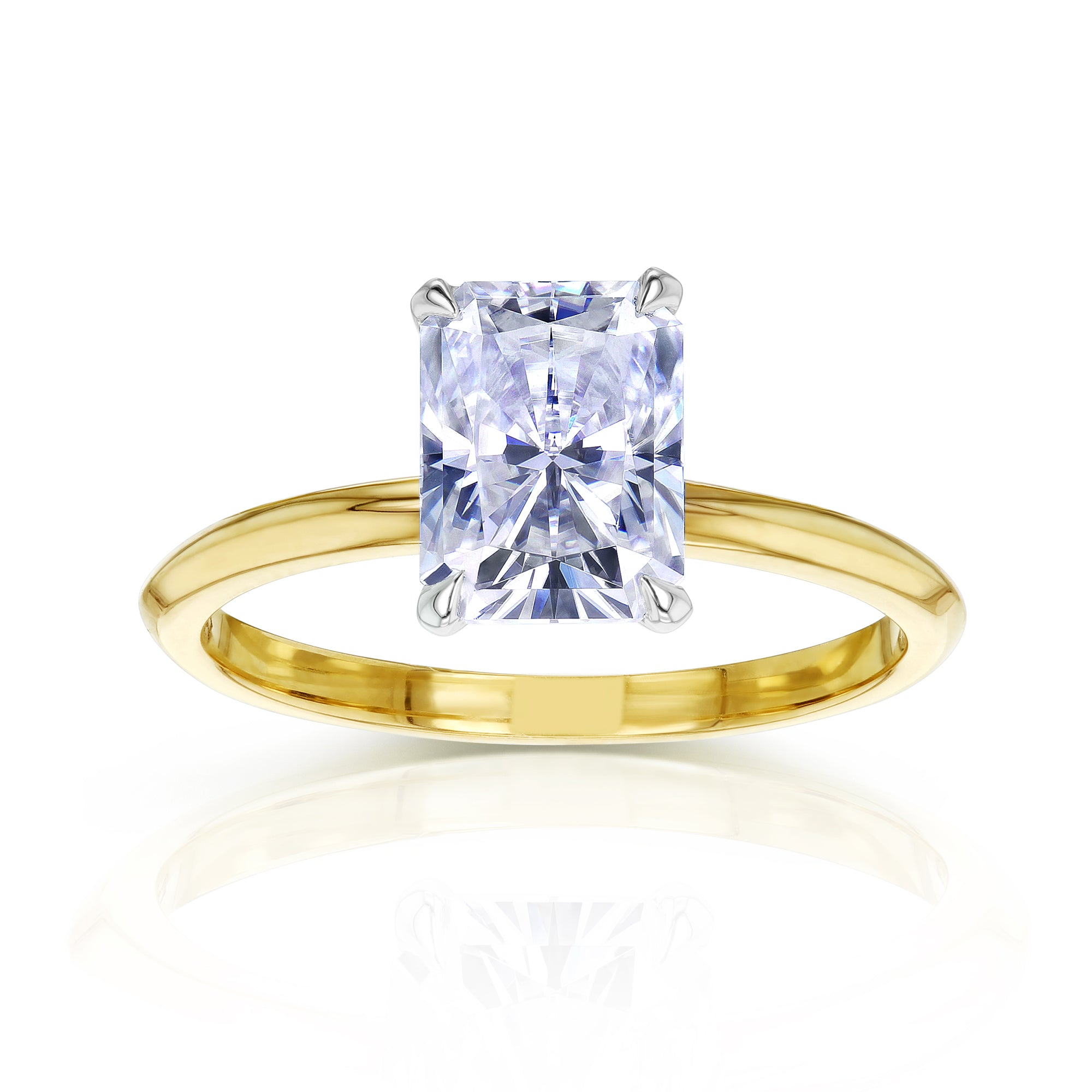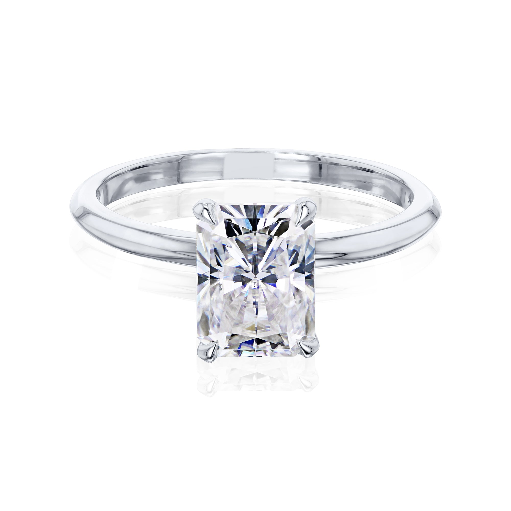 Bold, independent, simple. Let your ring define your personality. Our 1.75-Carat Solitaire Ring holds a radiant-cut center moissanite stone that showcases the hybrid shape of an emerald stone and the brilliance of a round stone. It stands in a 4-prong peg head on a knife-edge 14K solid gold shank. No side stones, just the uttermost sparkle of the center stone makes this ring a true classic.