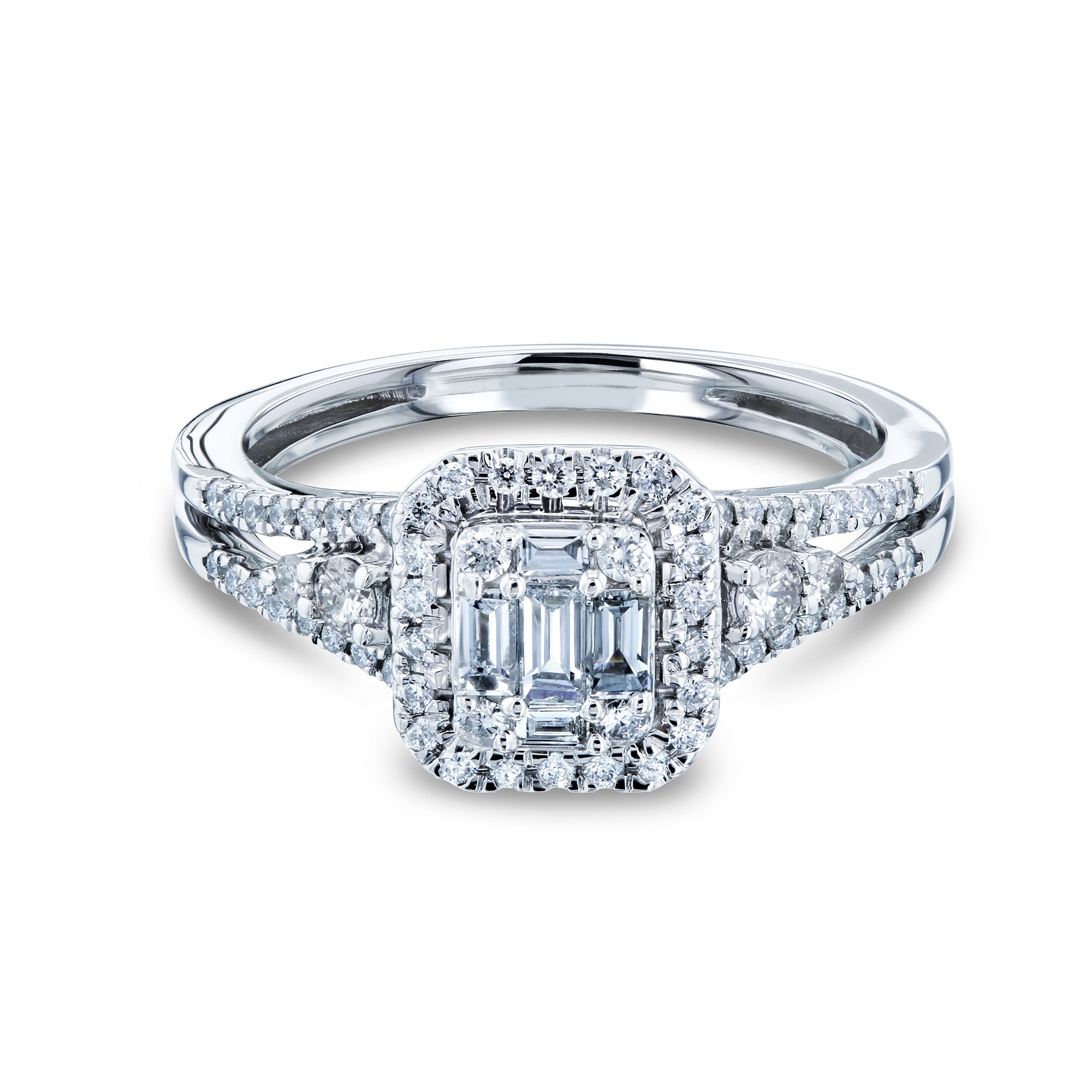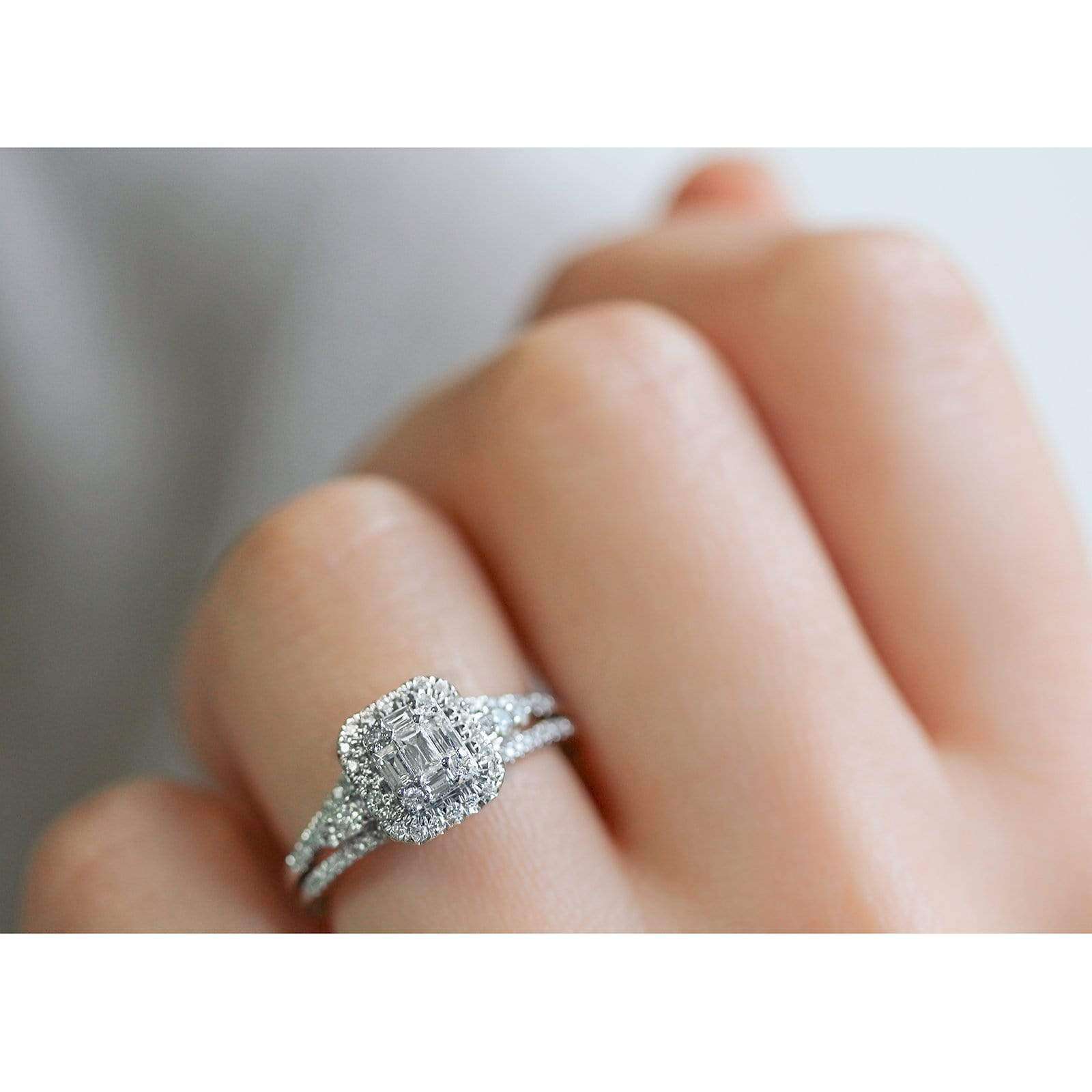 The rectangular halo encompasses a cluster of baguette and round diamonds. The benefit of having cluster centers is not only to enlarge the look of the center stone but also to emphasize bold textures. Diamond clusters maximize shimmering sparkles from the mix of unique shapes and cuts creating a dynamic surface that collects and reflects light at all angles.