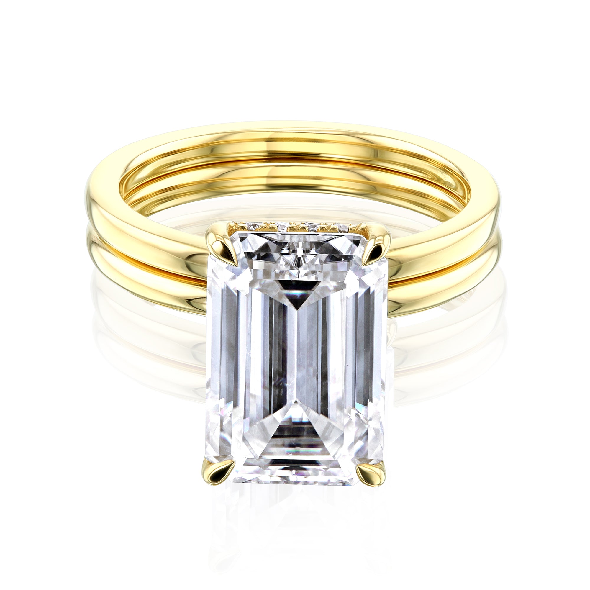 The Elliot 12x8 Two-Piece Bridal Set features an engagement ring with a 12x8 mm (5.5 carats diamond equivalent weight) emerald moissanite center stone with a hidden halo of lab-grown diamonds in a slim basket setting. Both shanks of the engagement ring and matching band are a comfort-fit solid gold band crafted in 14-karat gold in a high polish finish.