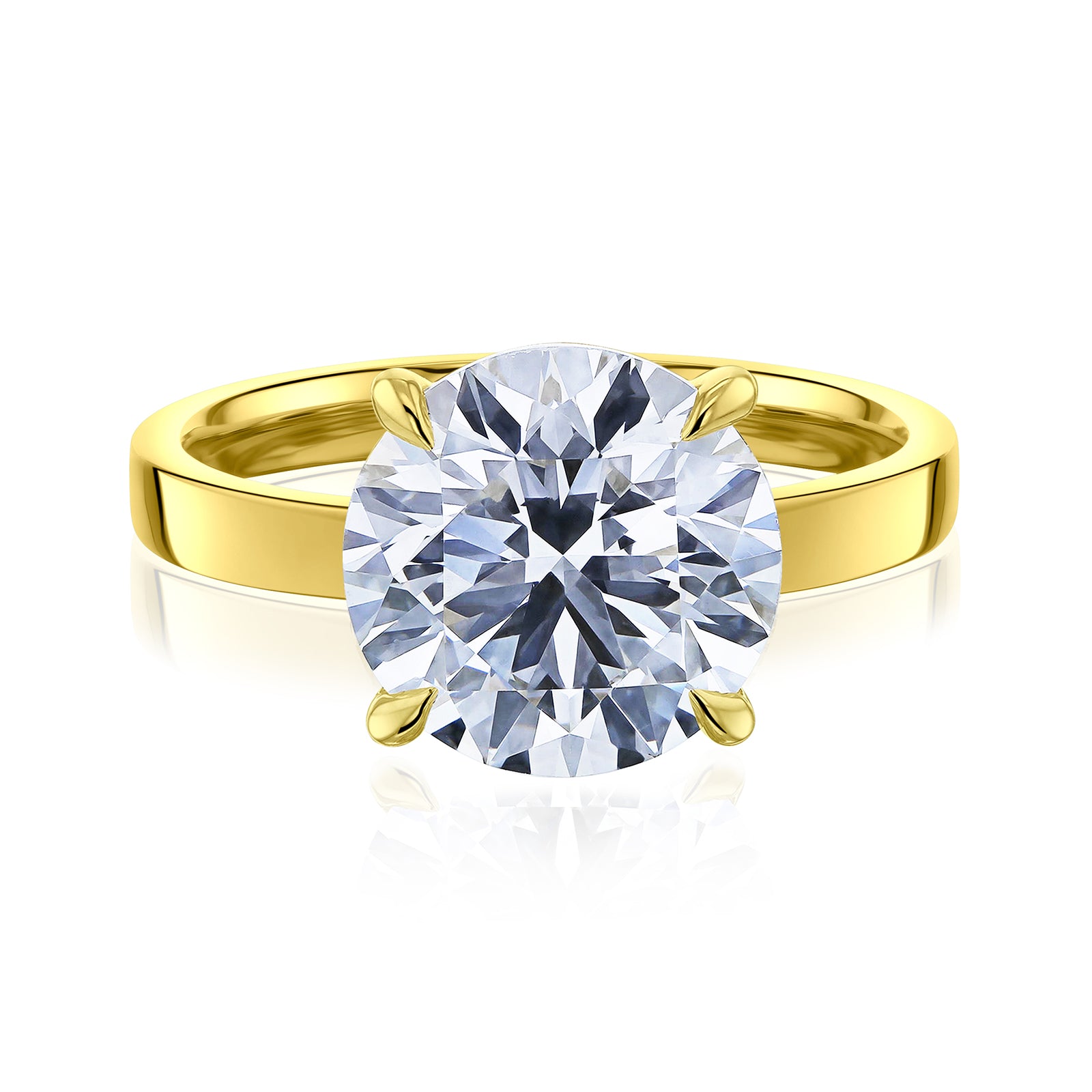 A four-carat round-cut diamond tops this solid gold band. The ring is made with solid 14k gold in a high polish.