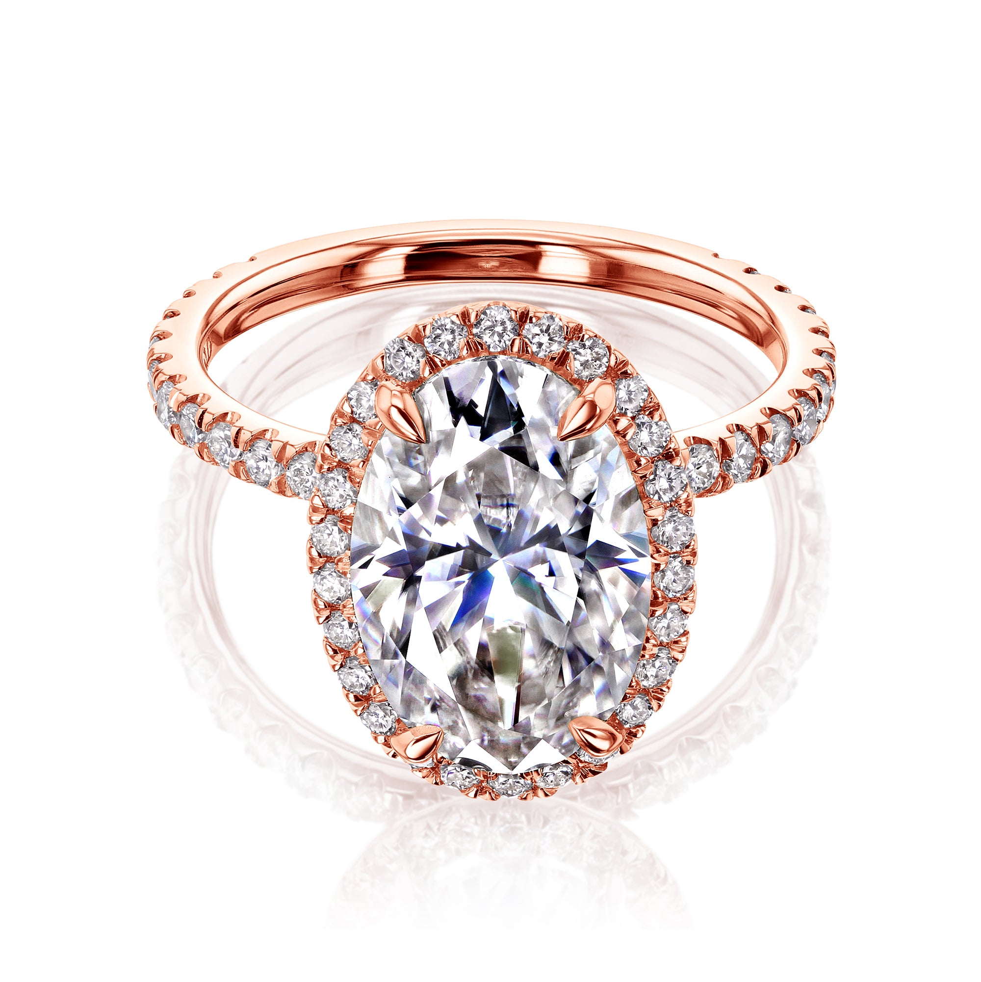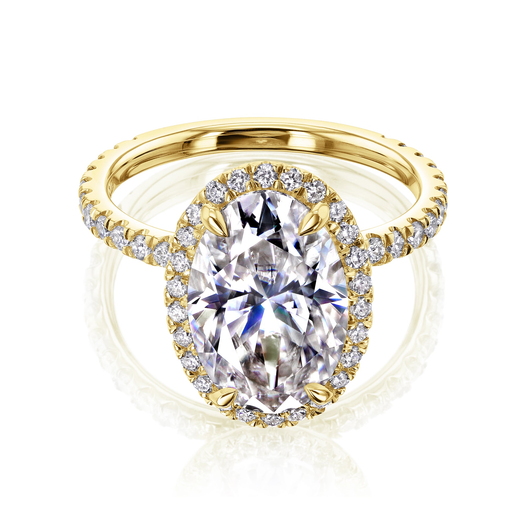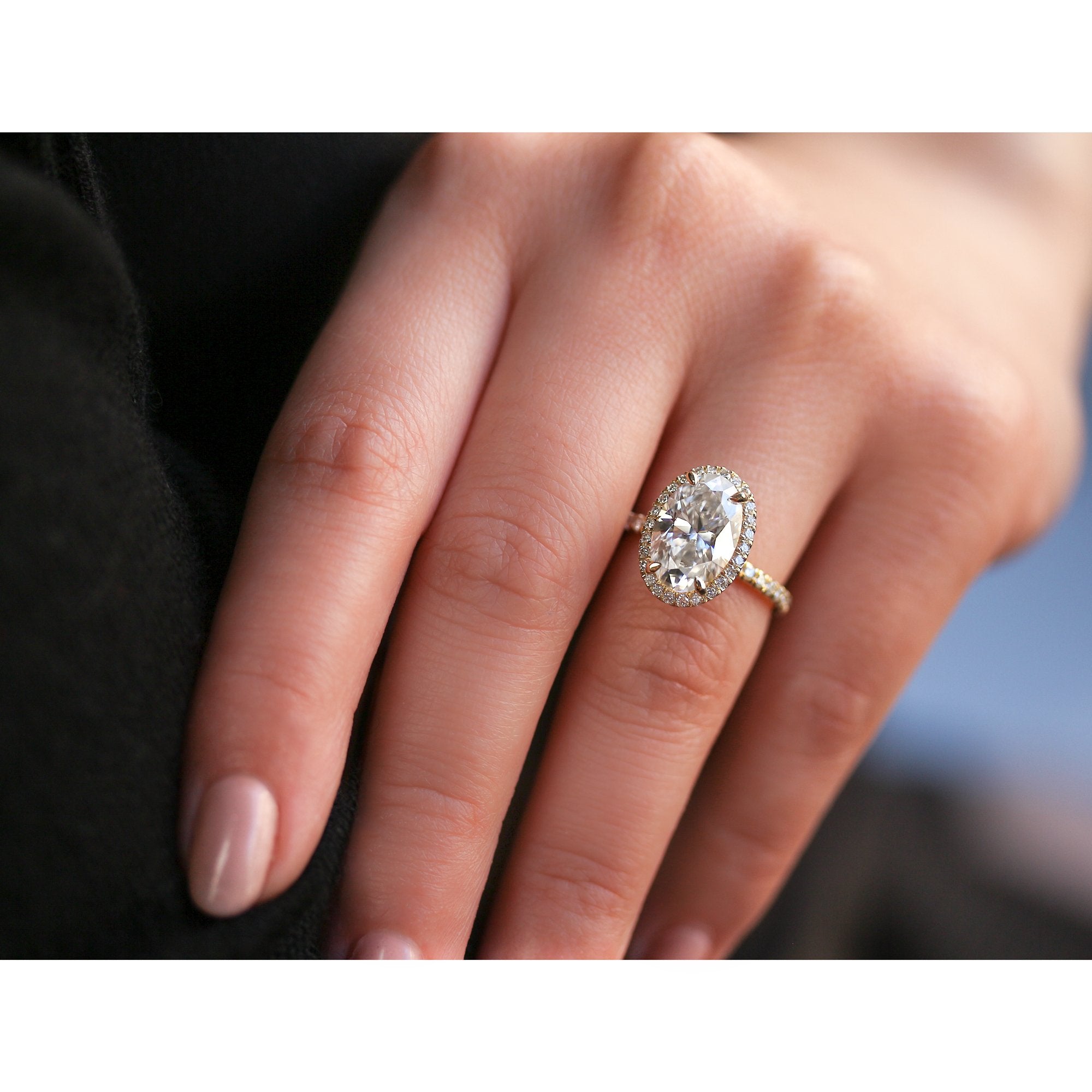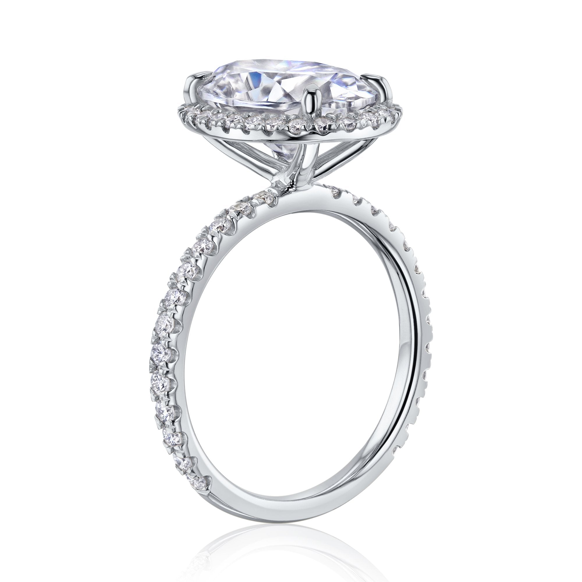 The Olivia 12x8 engagement ring features a 12x8 mm (4 carats diamond equivalent weight) oval moissanite center stone surrounded by a halo of lab-grown diamonds in a slim basket setting. The shank is illuminated with 52 pavé lab-grown diamonds in a semi-eternity fashion.