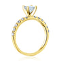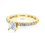 This engagement ring is specifically designed to offer guaranteed sparkle with its inverted pyramid center stone held by four V-shaped prongs in a comfort fit 14K solid gold flame french pave band.