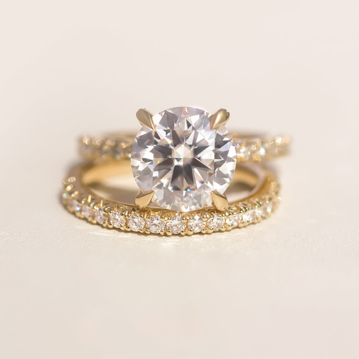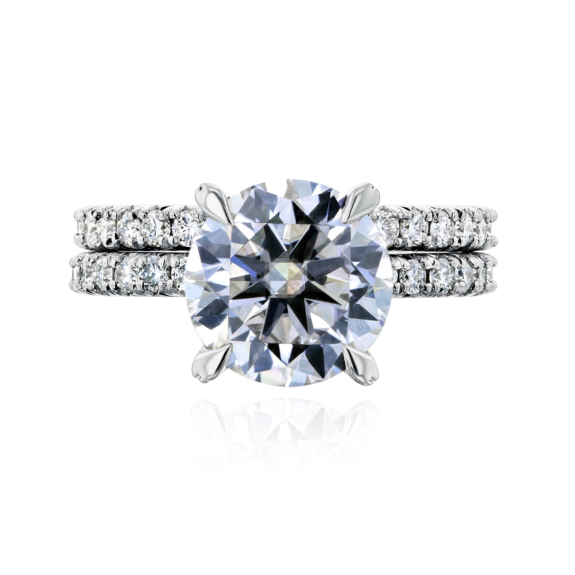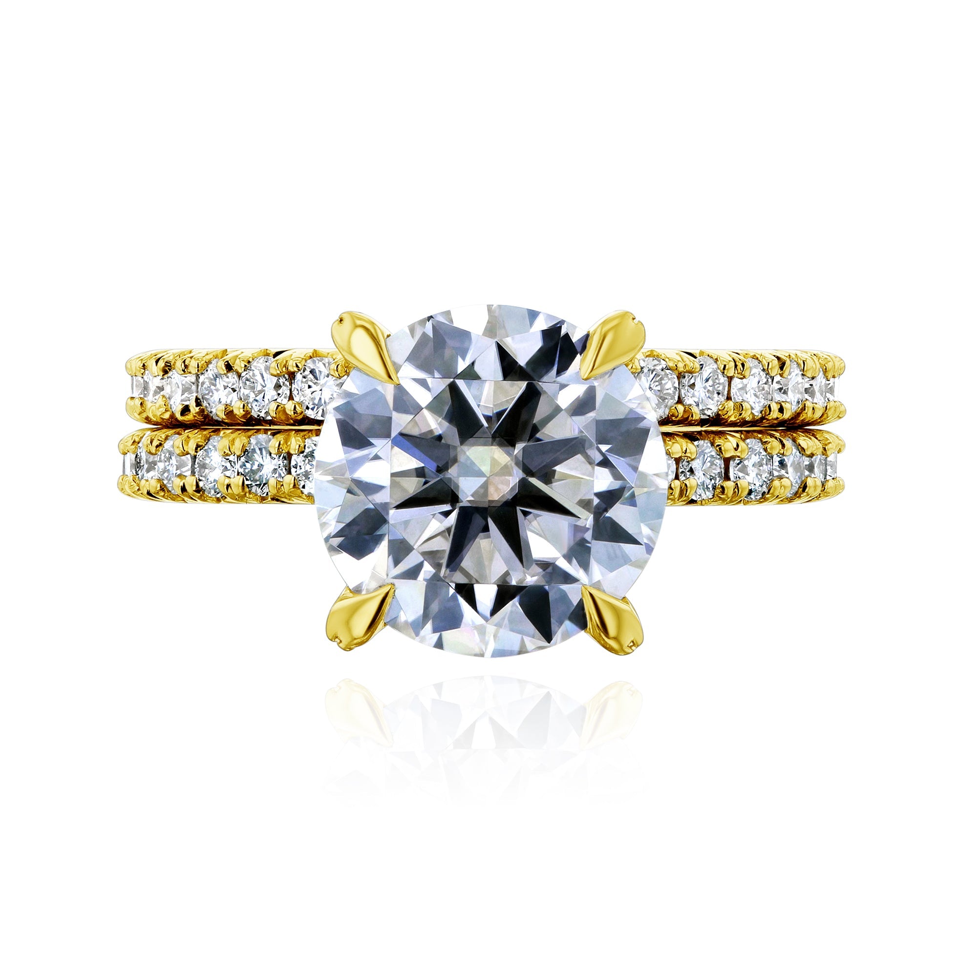 A gorgeous 3.1 carat round moissanite tops this slender diamond-lined engagement ring in 14k gold. The open claw-prong setting exhibits a graceful open design where the entirety of the the stone's depth can be seen from the crown to the pavilion. Completing the ensemble a diamond-lined wedding band, matching perfectly to the band of the engagement ring.