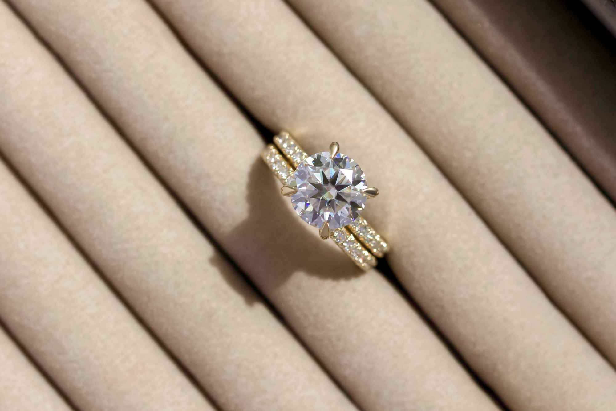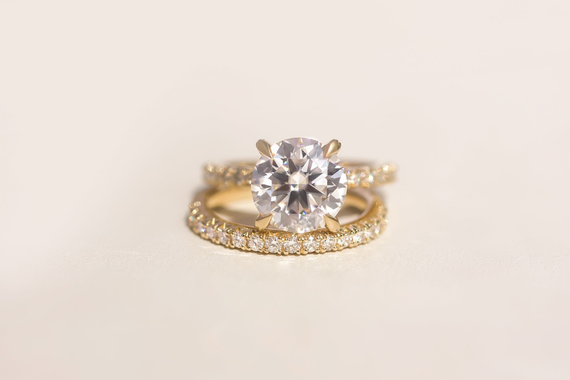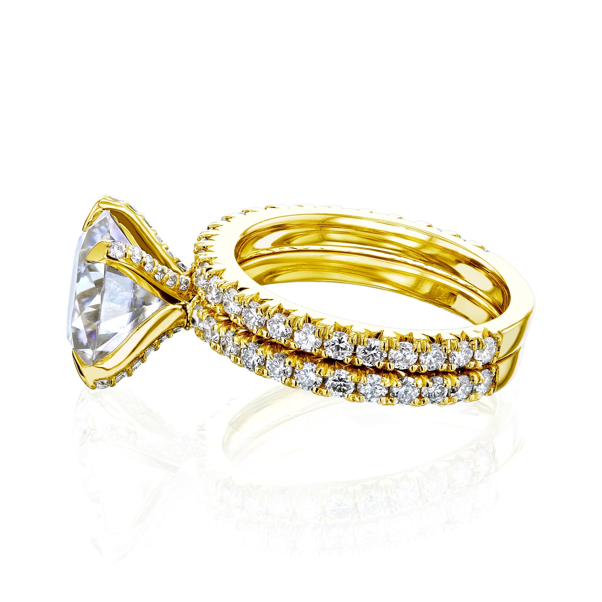 A gorgeous 3.1 carat round moissanite tops this slender diamond-lined engagement ring in 14k gold. The open claw-prong setting exhibits a graceful open design where the entirety of the the stone's depth can be seen from the crown to the pavilion. Completing the ensemble a diamond-lined wedding band, matching perfectly to the band of the engagement ring.