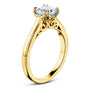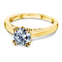• The bridge hoists the 6mm cushion moissanite in solid 14-karat gold. Four double prongs secure the stone in place with a W-shaped profile where the head joins on both sides of the engagement ring.