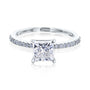 Our 0.9 Carat Princess Petite Engagement Ring is picture perfect. It has a gorgeous moissanite princess-cut center stone in a low basket setting for a low profile yet casts a spectacular level of brilliance like that of a round diamond. 22 round diamond side stones are carefully placed halfway down the shank adding an accent to the 14K solid gold band. This charming petite ring is a masterpiece every bride-to-be deserves to have.