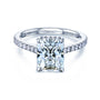 A large 2.7 carat (9x7mm) radiant-cut moissanite is carried to the top of this diamond-lined engagement ring. Pairing the lab-created center stone with the earth-mined side stones makes for ideal use of both these stone types. The moissanite is best displayed in large sizes to showcase its well-known trait of brilliance and fire. The diamonds line together for a glittering visual enhancing the ring in both sparkling beauty and luxurious rarity.
