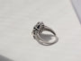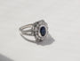 A blackish blue sapphire is bezel set in 10k white gold within a bountiful white diamond embellishment. Dual layered diamond petals are outlined in milgrain detailing over a diamond-lined split shank.
