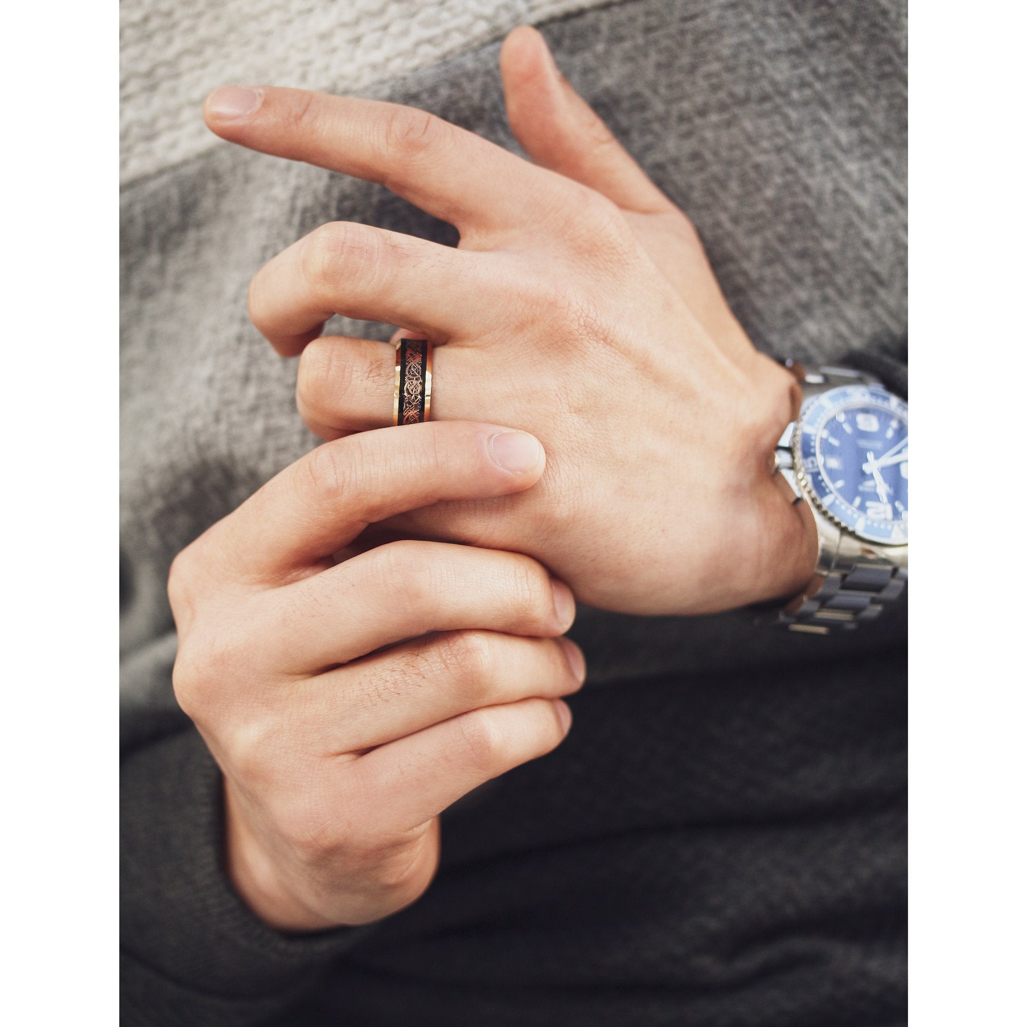 Black tungsten comfort fit men's wedding band or fashion ring with rose colored celtic dragon inlay. This scratch resistant ring is highly durable and made to last a lifetime.