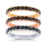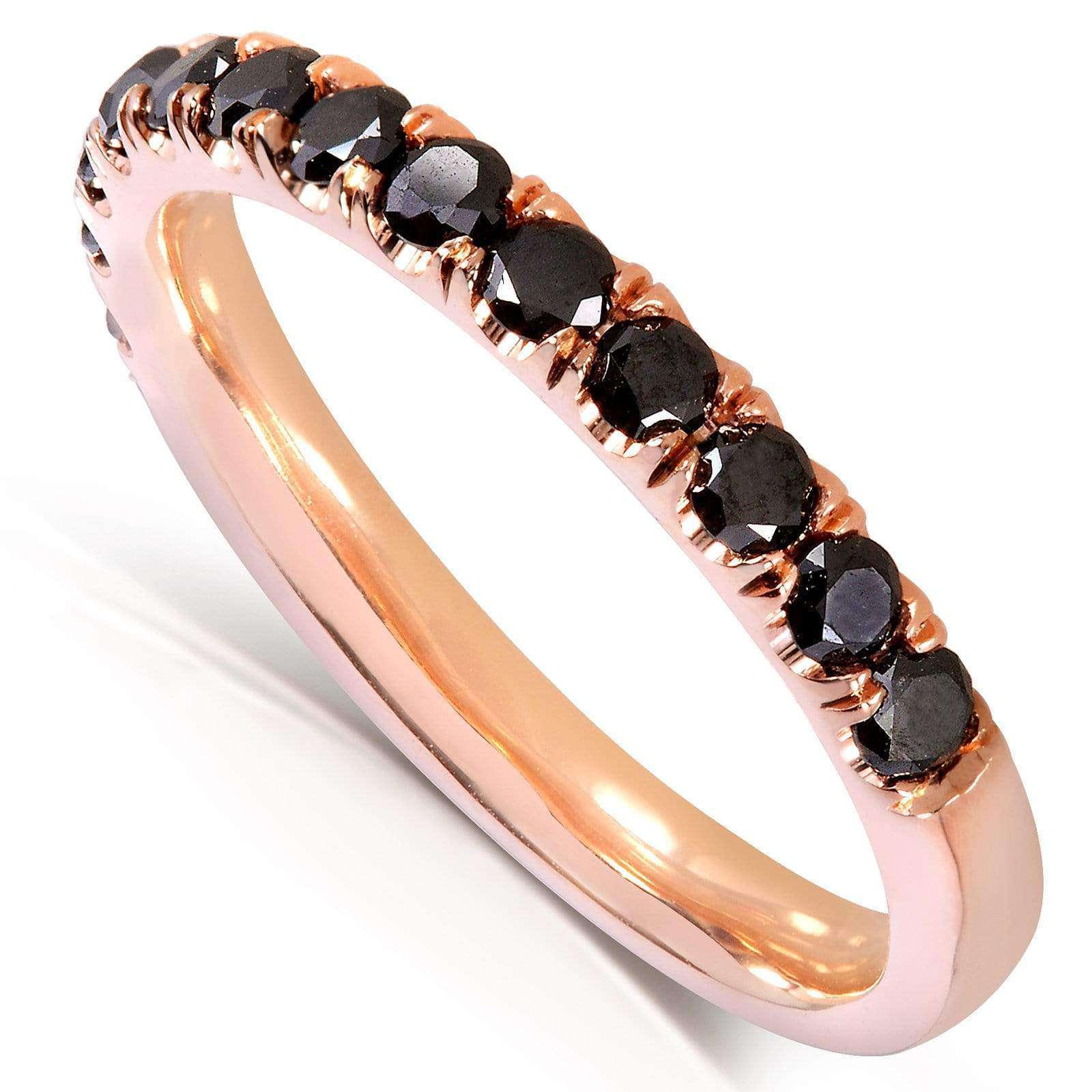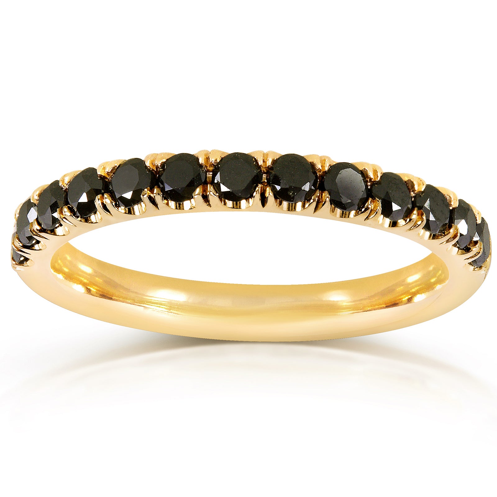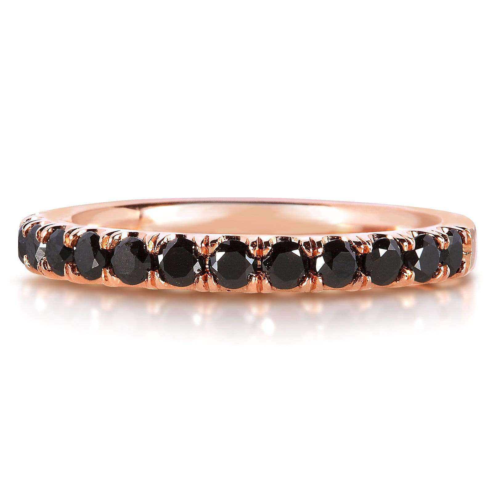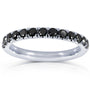 This comfort fit women's wedding band carries 13 black diamonds set in a French pave setting. The ring is made with solid 14k gold and is finished with a high polish.