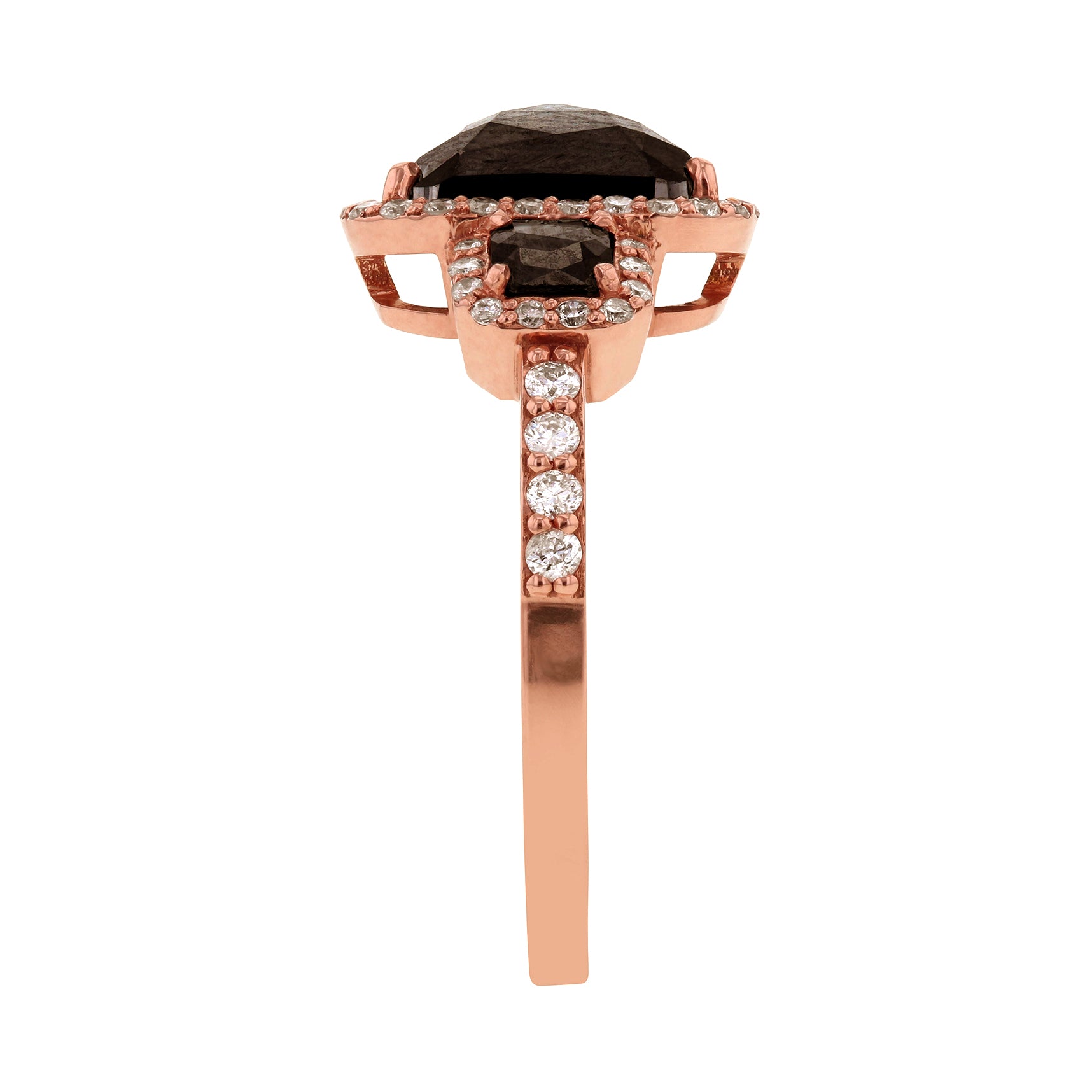 Three black diamonds take to the center of this rose gold ring. A white diamond trim decorates the piece for a beautiful contrast and bright finish.