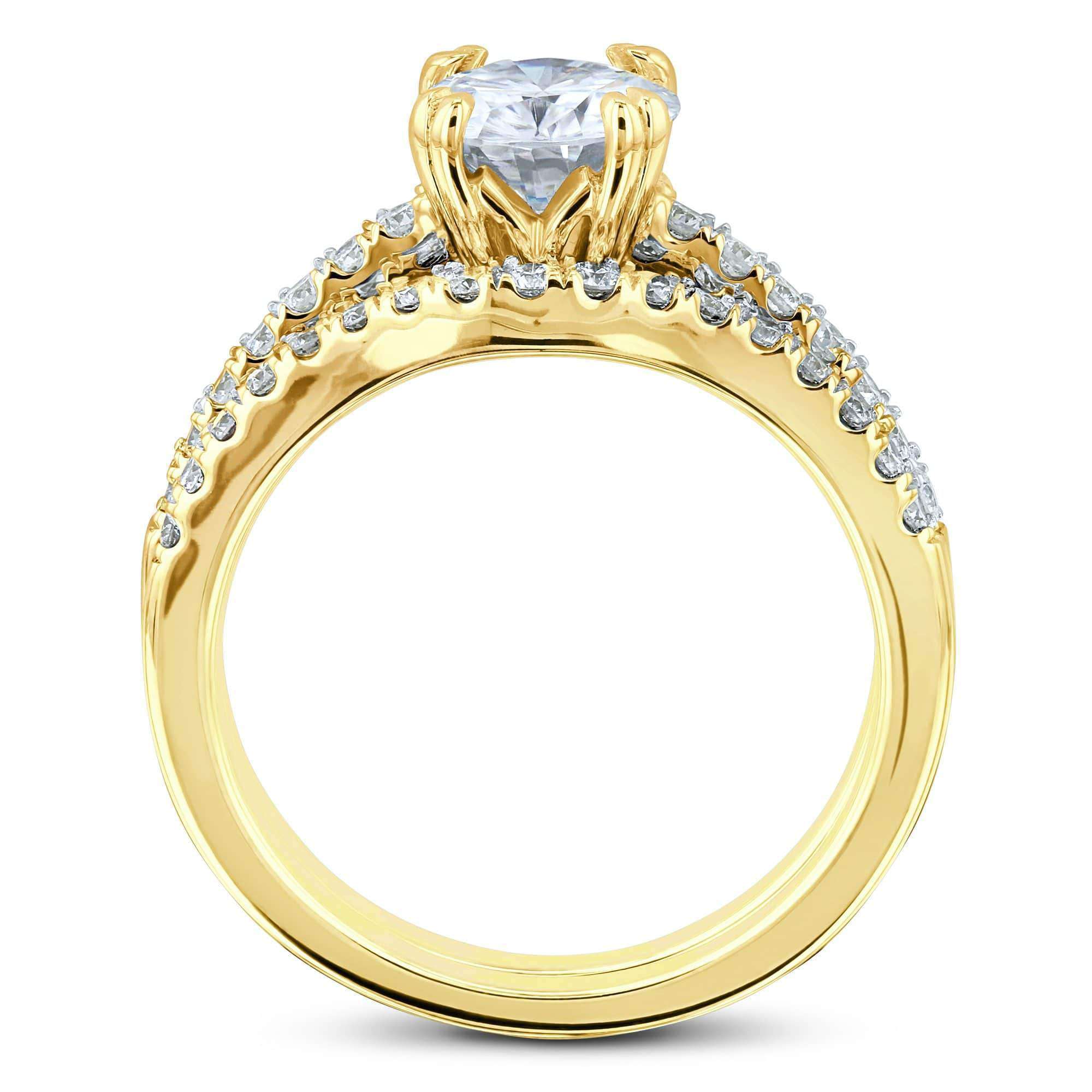 Four split prongs carry a round one carat moissanite over this classic diamond engagement ring mounting. A matching diamond wedding band fits snugly next to the engagement ring for the perfect set. The moissanite center stone is a man-made gemstone with highly remarkable qualities. All other stones adorning this bridal set are natural earth mined white diamonds giving you the best of both worlds. The rings are made with solid 14k gold and is finished with a high polish.