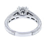 The textured edges are known as milgrain offering additional sparkle from the metal surrounding the channel-set natural diamonds. The profile features engraved decorations for fanciful detailing. The center moissanite gemstone is a one carat lab created colorless stone carrying brillant quality for a center stone. It is held securely in place using four traditional claw prongs.