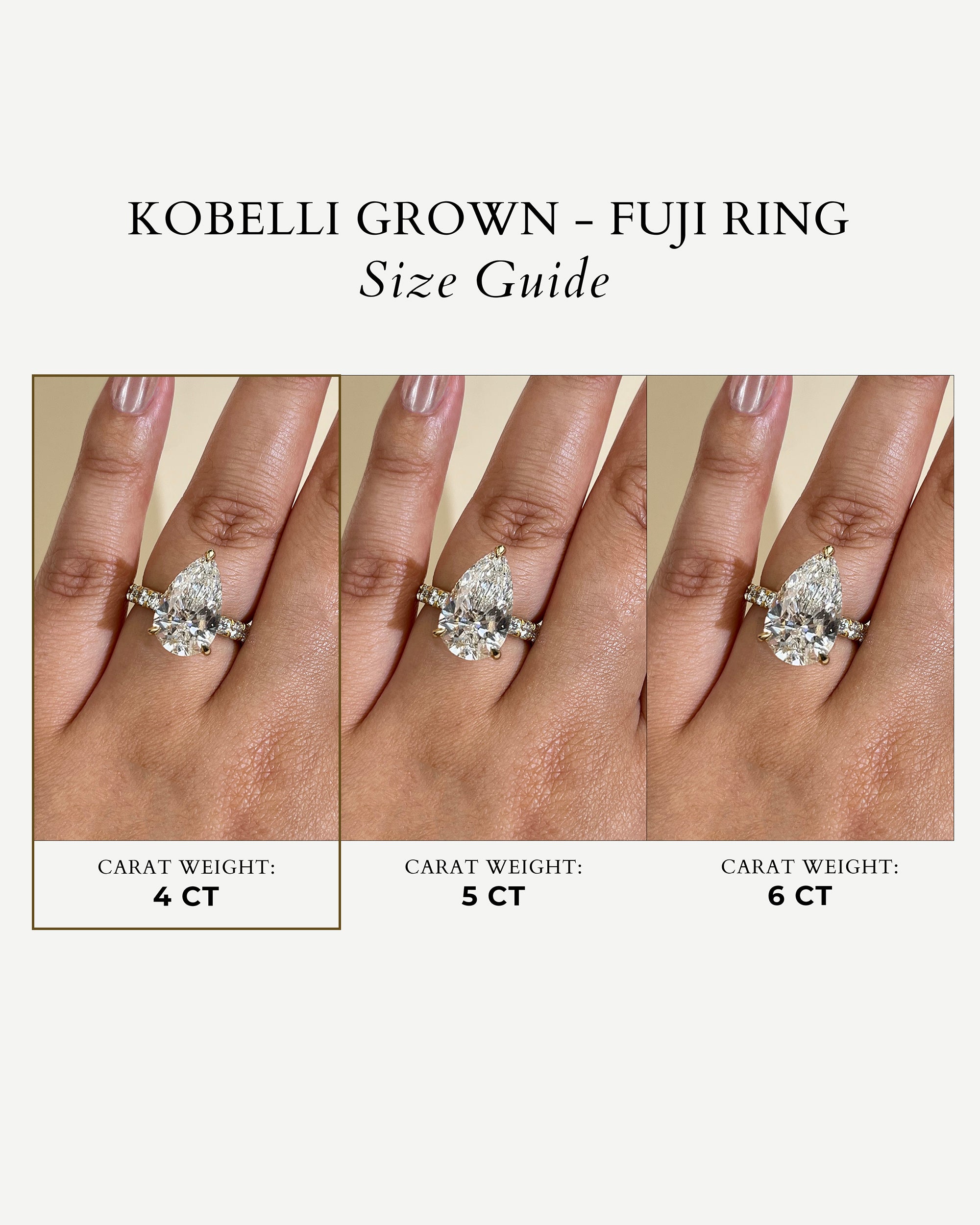 The Fuji Engagement Ring features a pear brilliant diamond center stone with a simple floating basket setting.