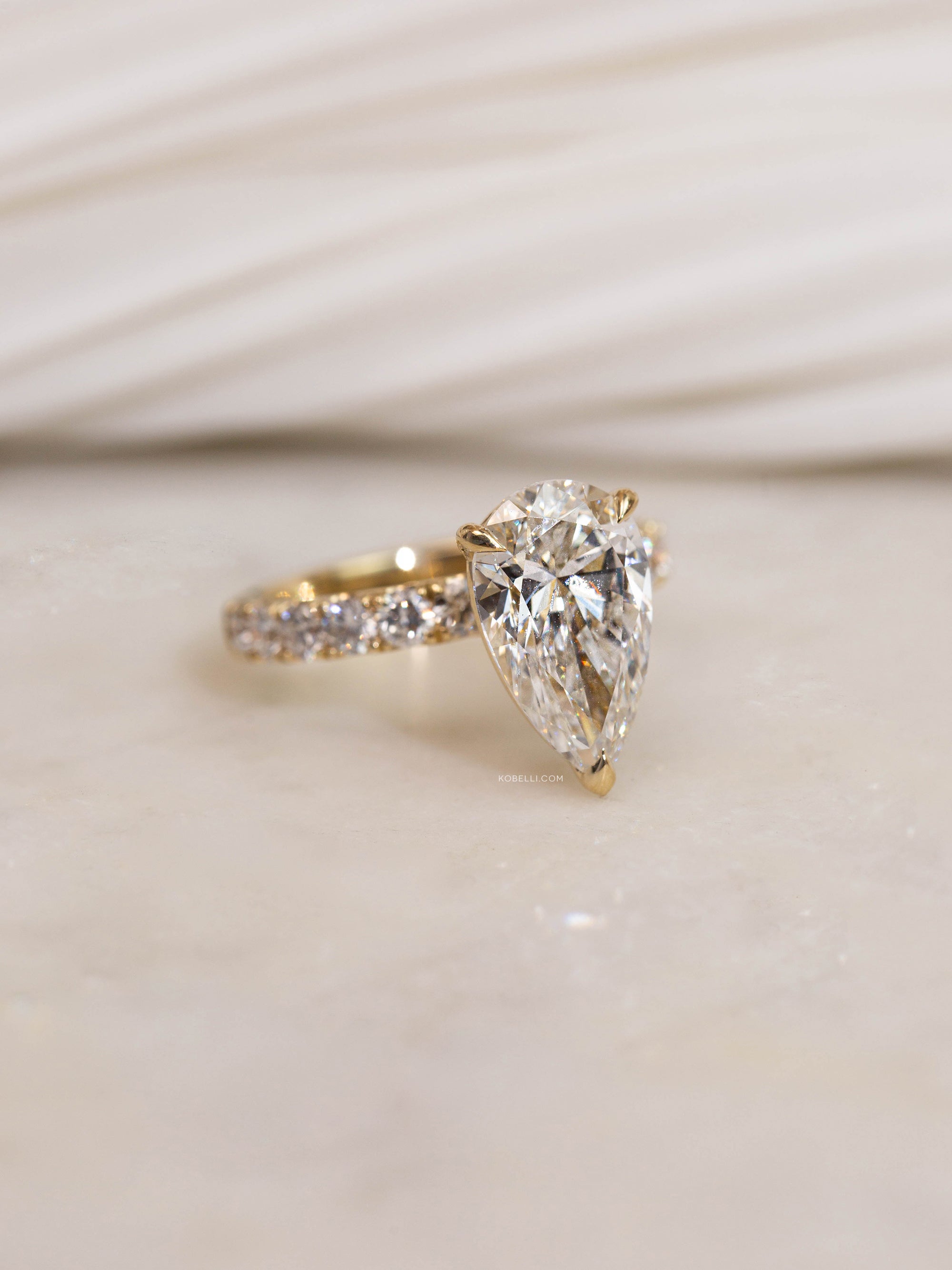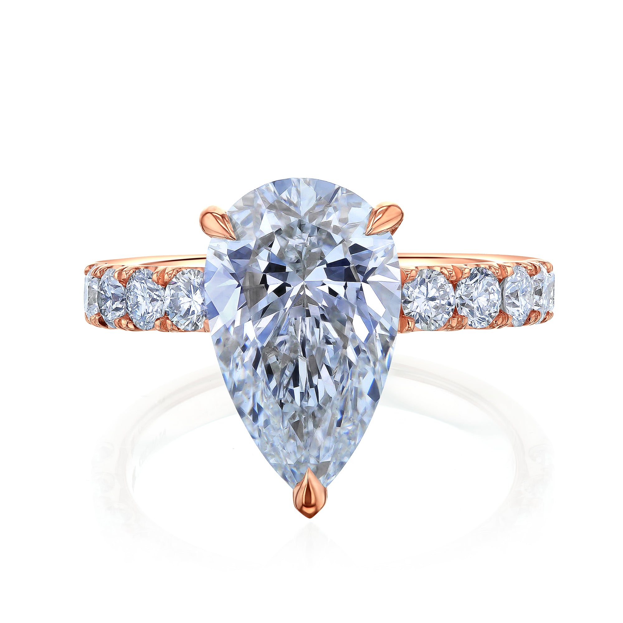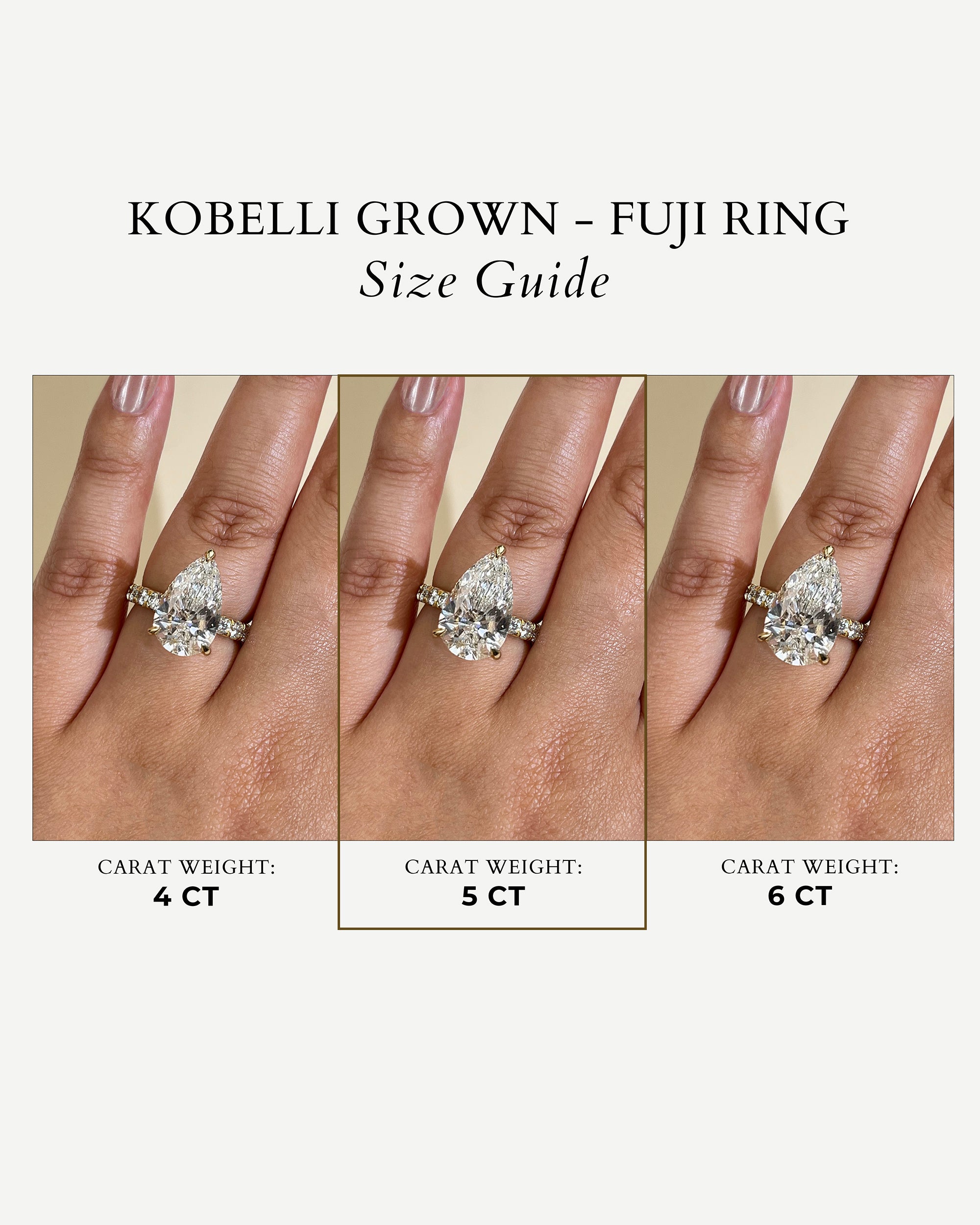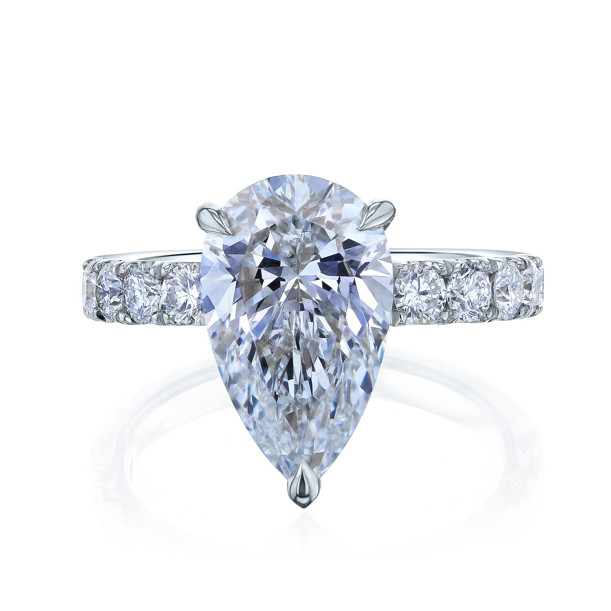 The Fuji Engagement Ring features a pear brilliant diamond center stone with a simple floating basket setting.