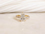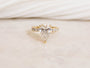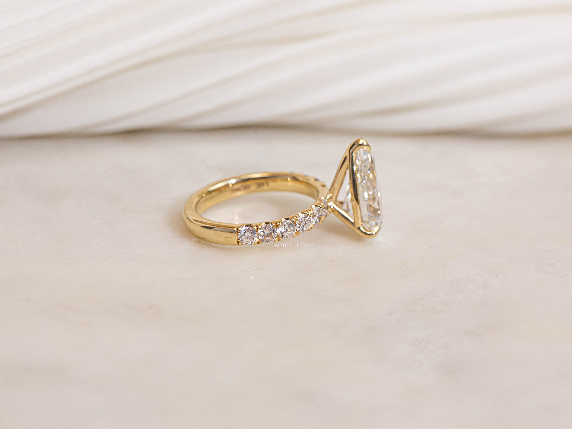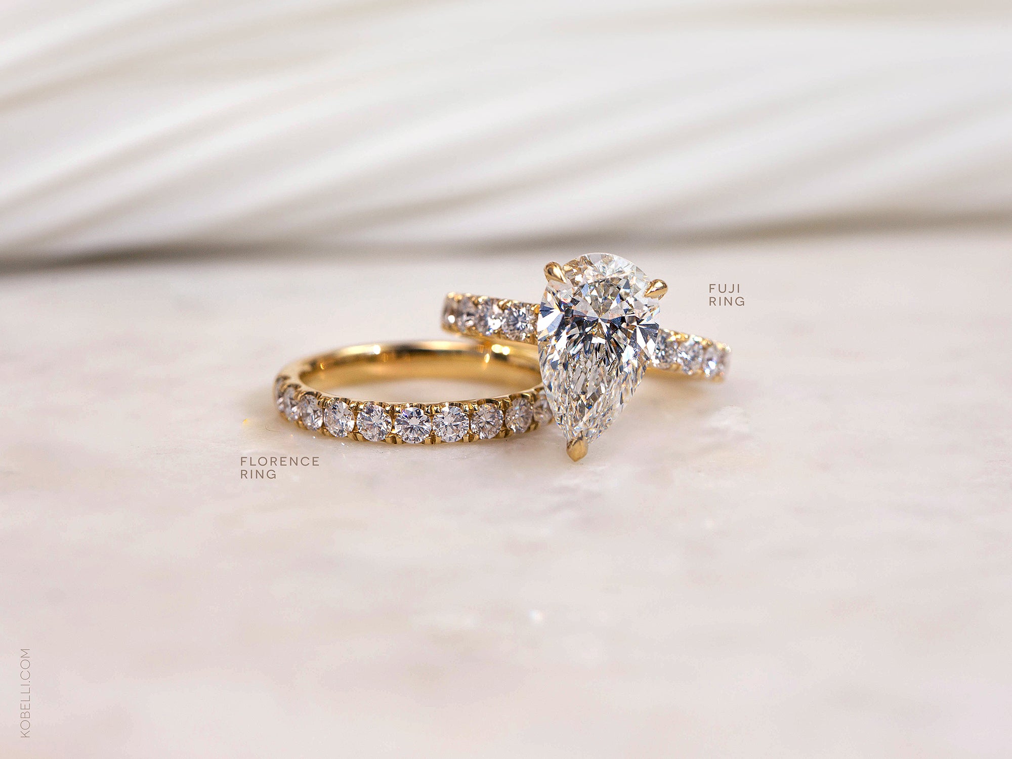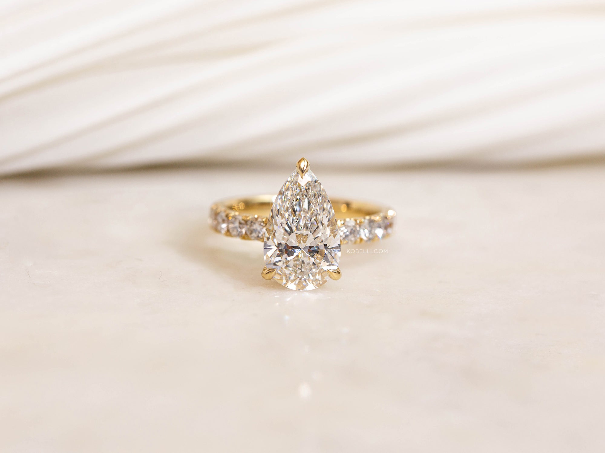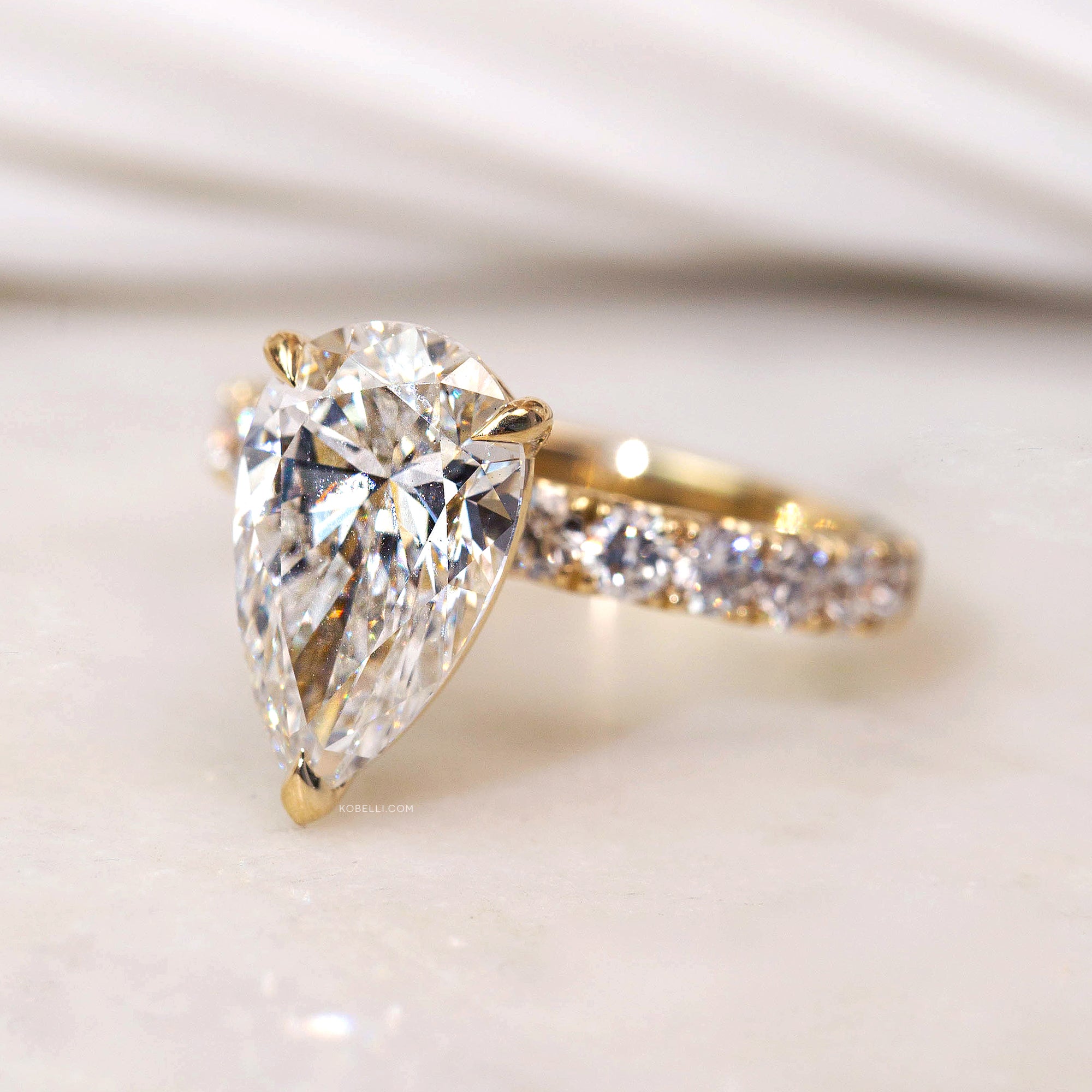 The Fuji Engagement Ring features a pear brilliant diamond center stone with a simple floating basket setting.