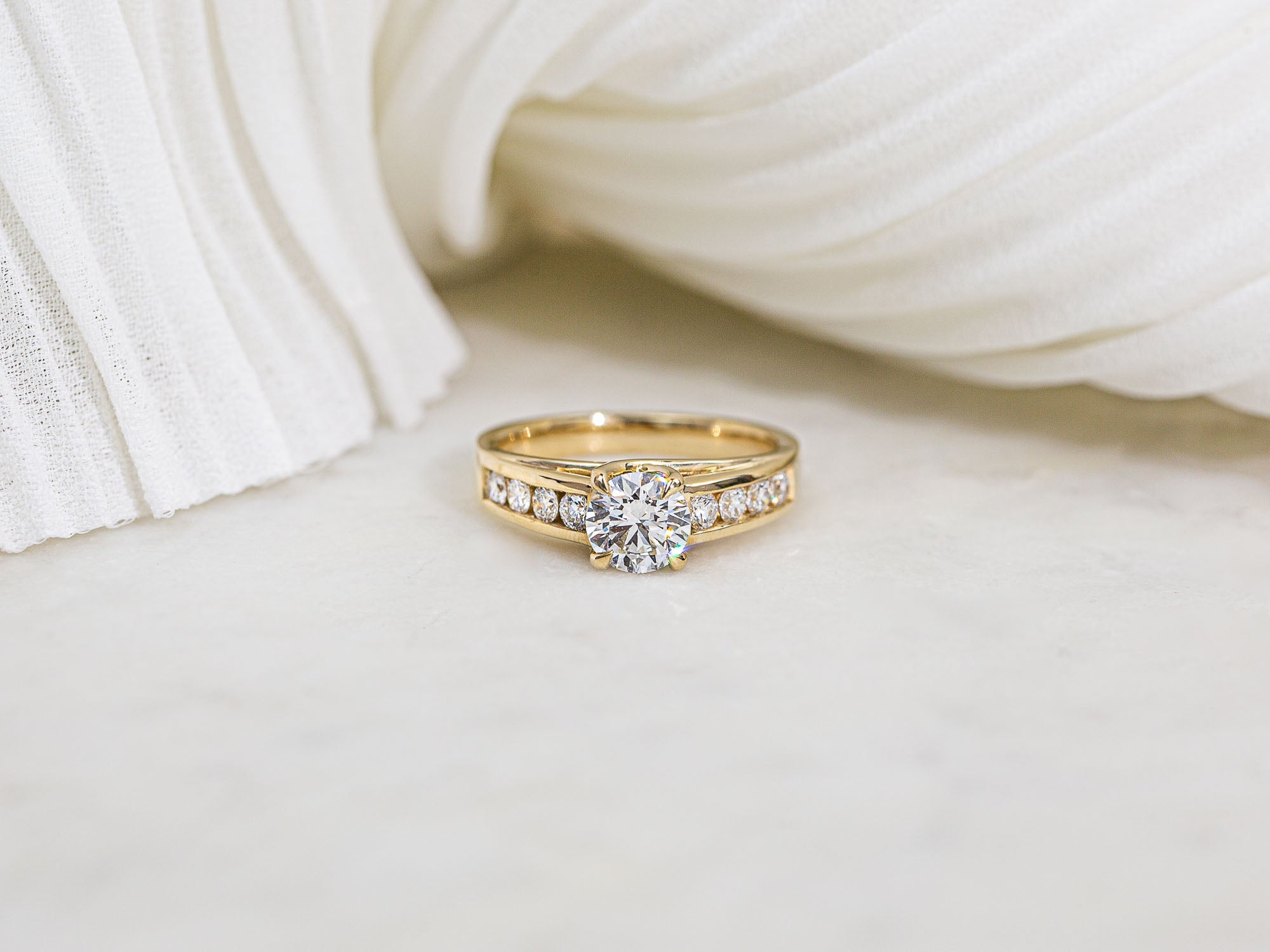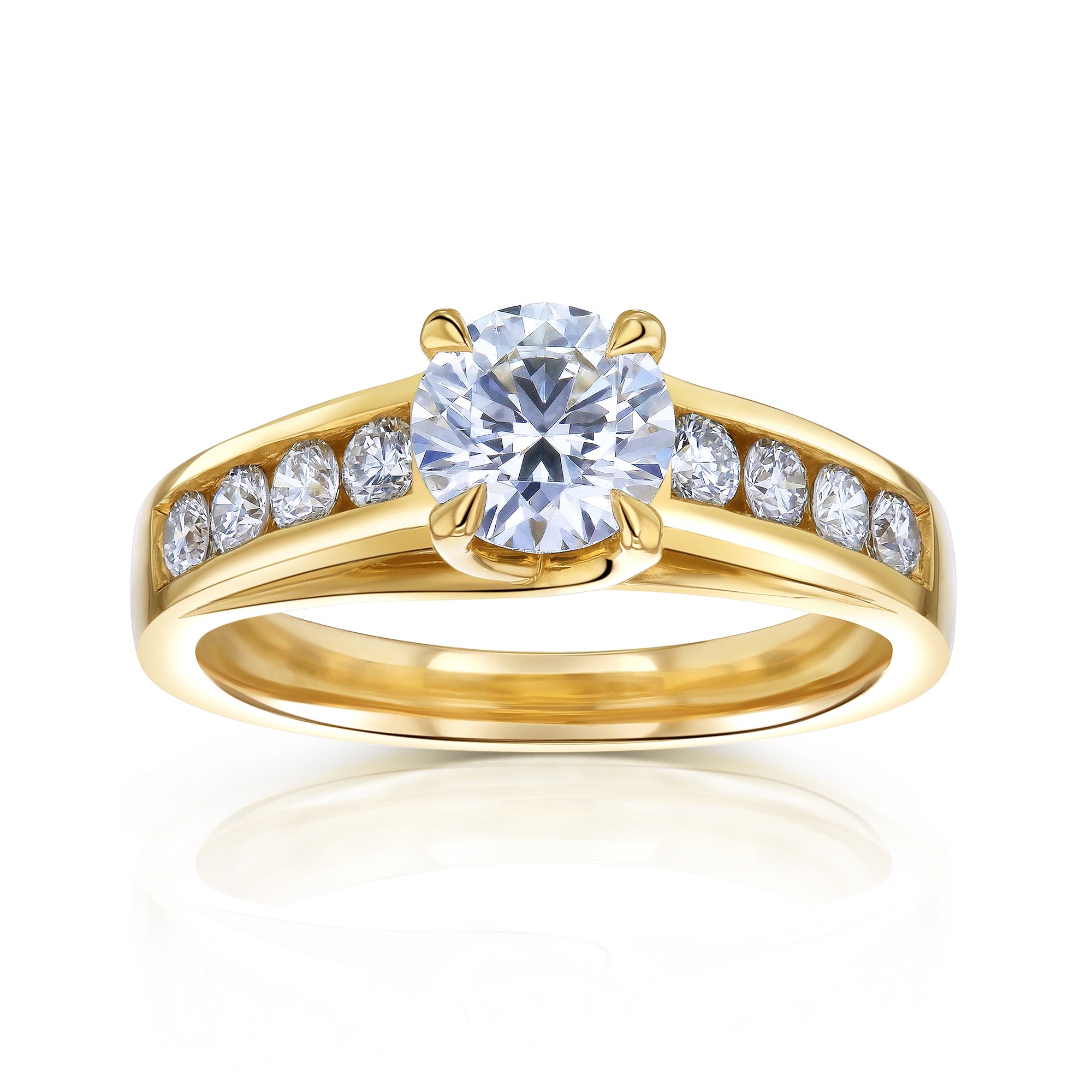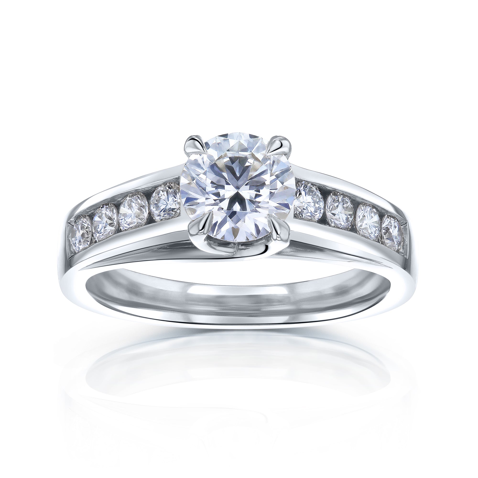 Gorgeous round brilliant-cut diamonds line this ring in a channel setting with a classic 1 carat diamond centered on the top. The Kobelli Grown quality center stone comes with a certificate indicating EF color and VS clarity. The smaller diamonds are similarly DEF color and VS clarity to match.