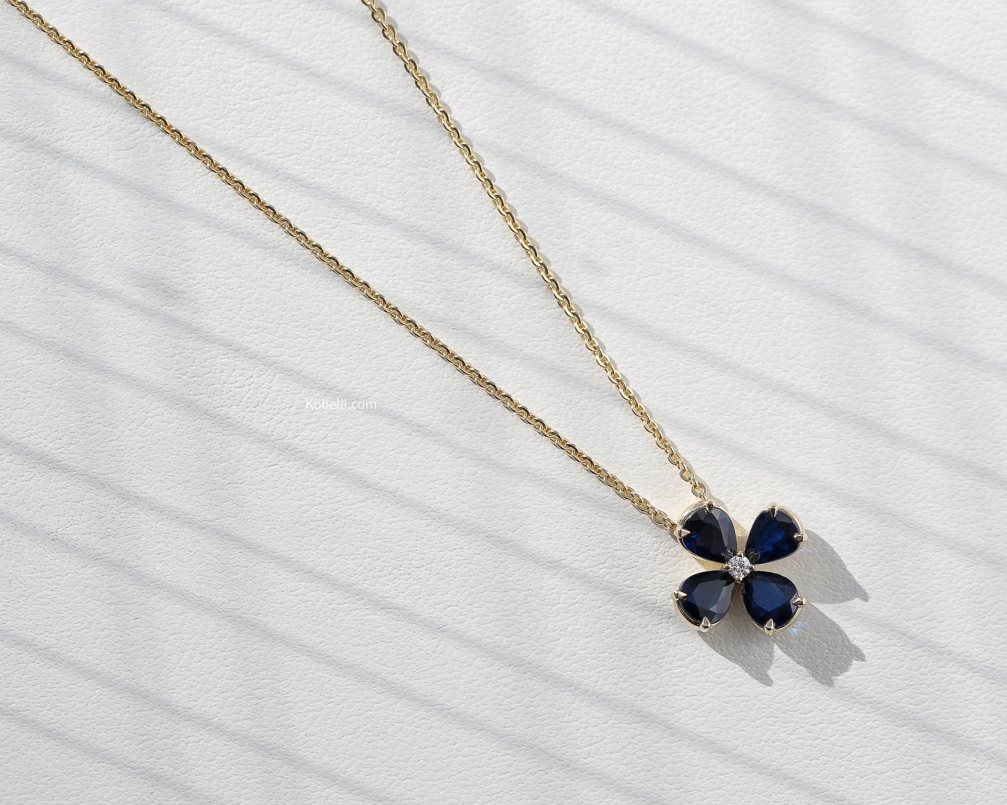 Four beautiful pear shaped deep blue sapphires are set in a blooming design on this gorgeous pendant. A 0.02 carat diamond is situated in the very center. The pendant and chain are crafted with 14-karat yellow gold.