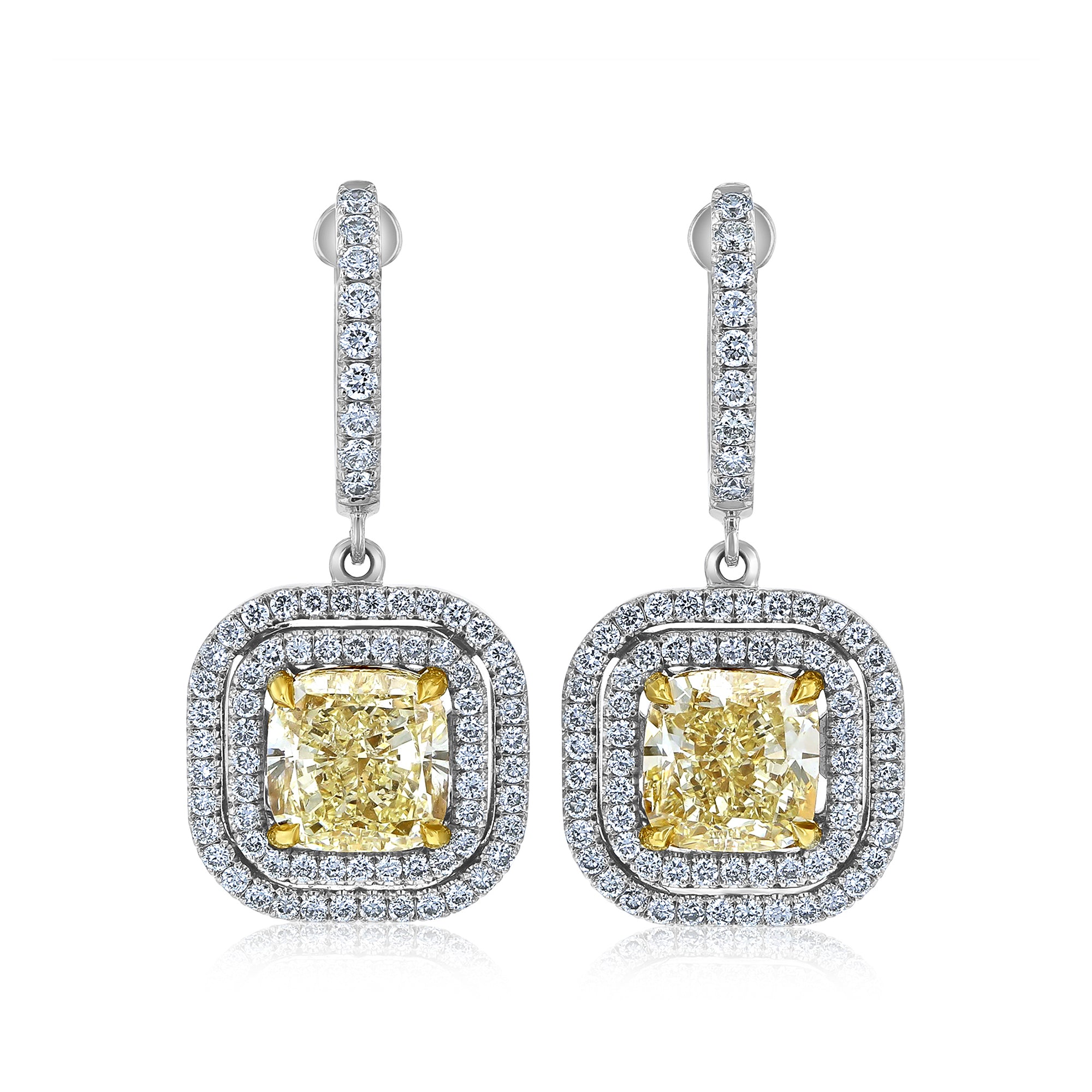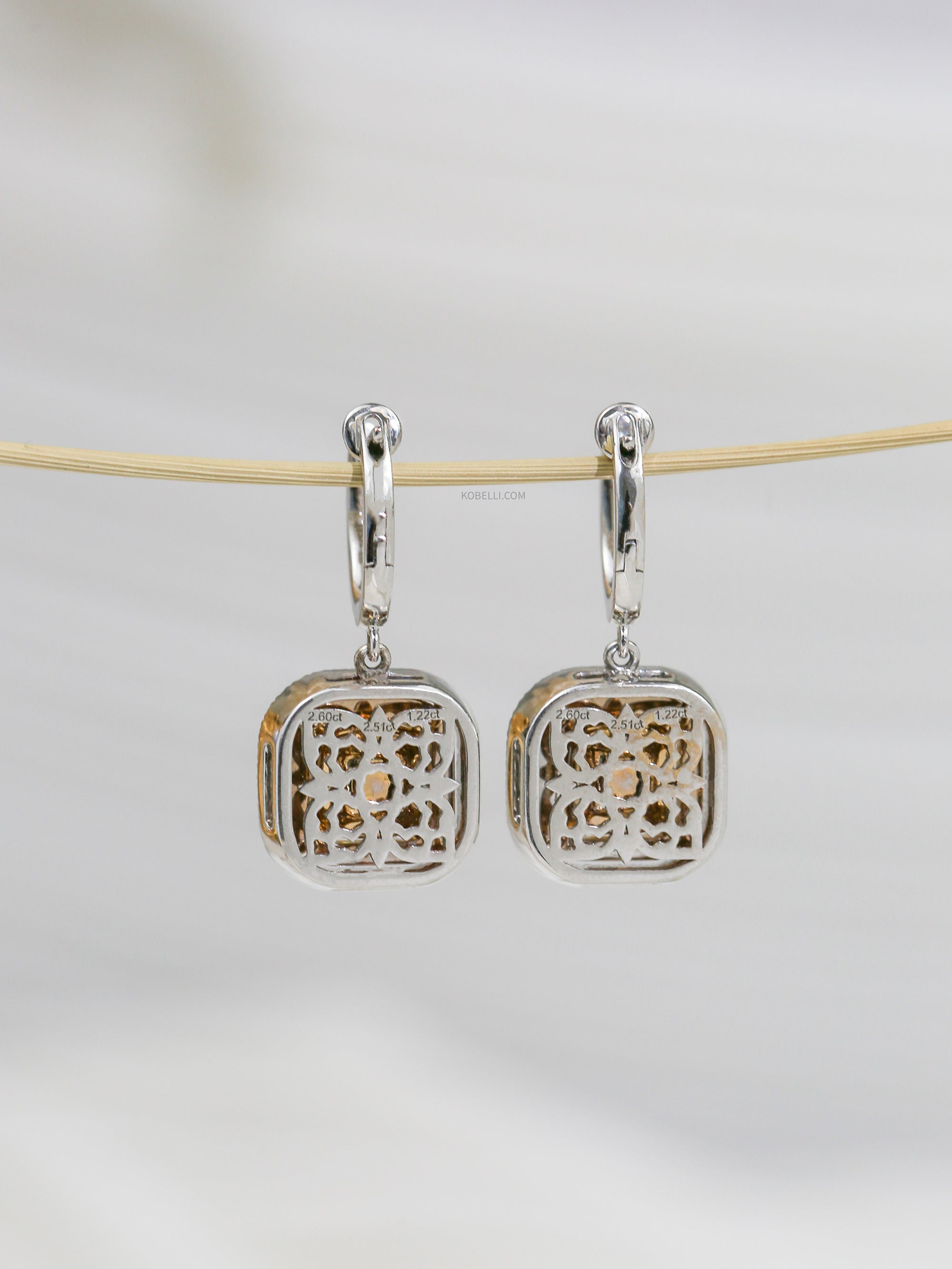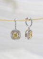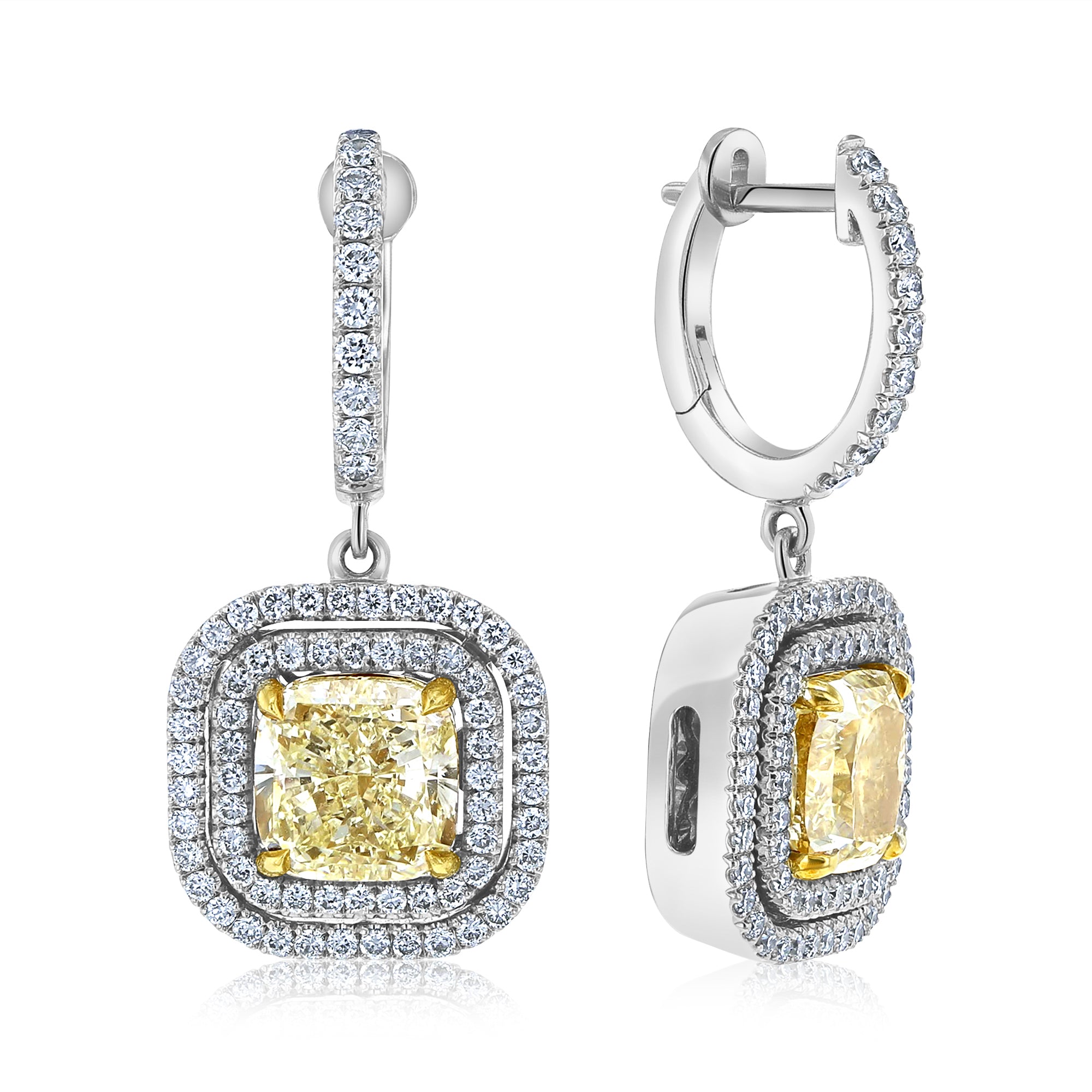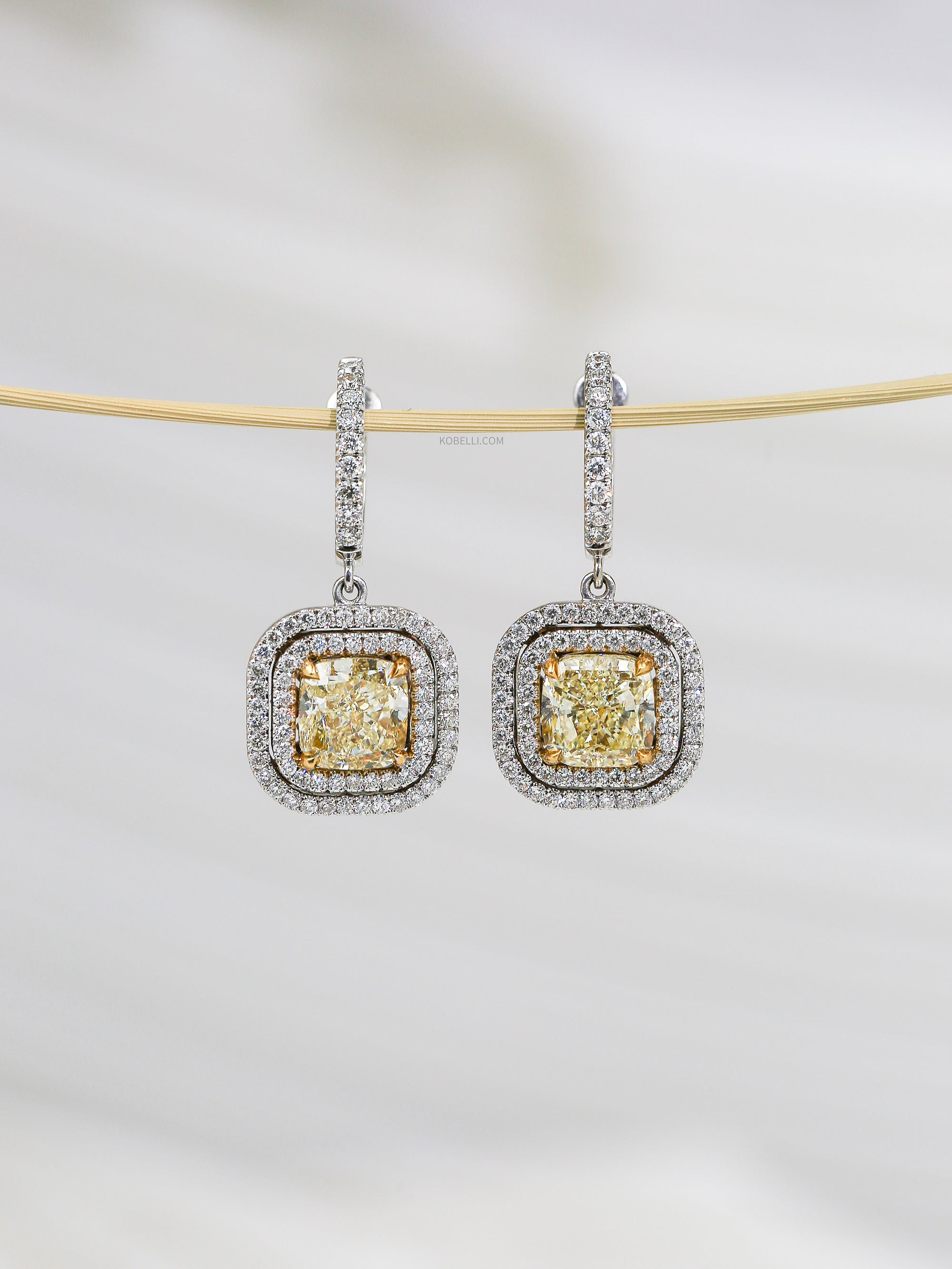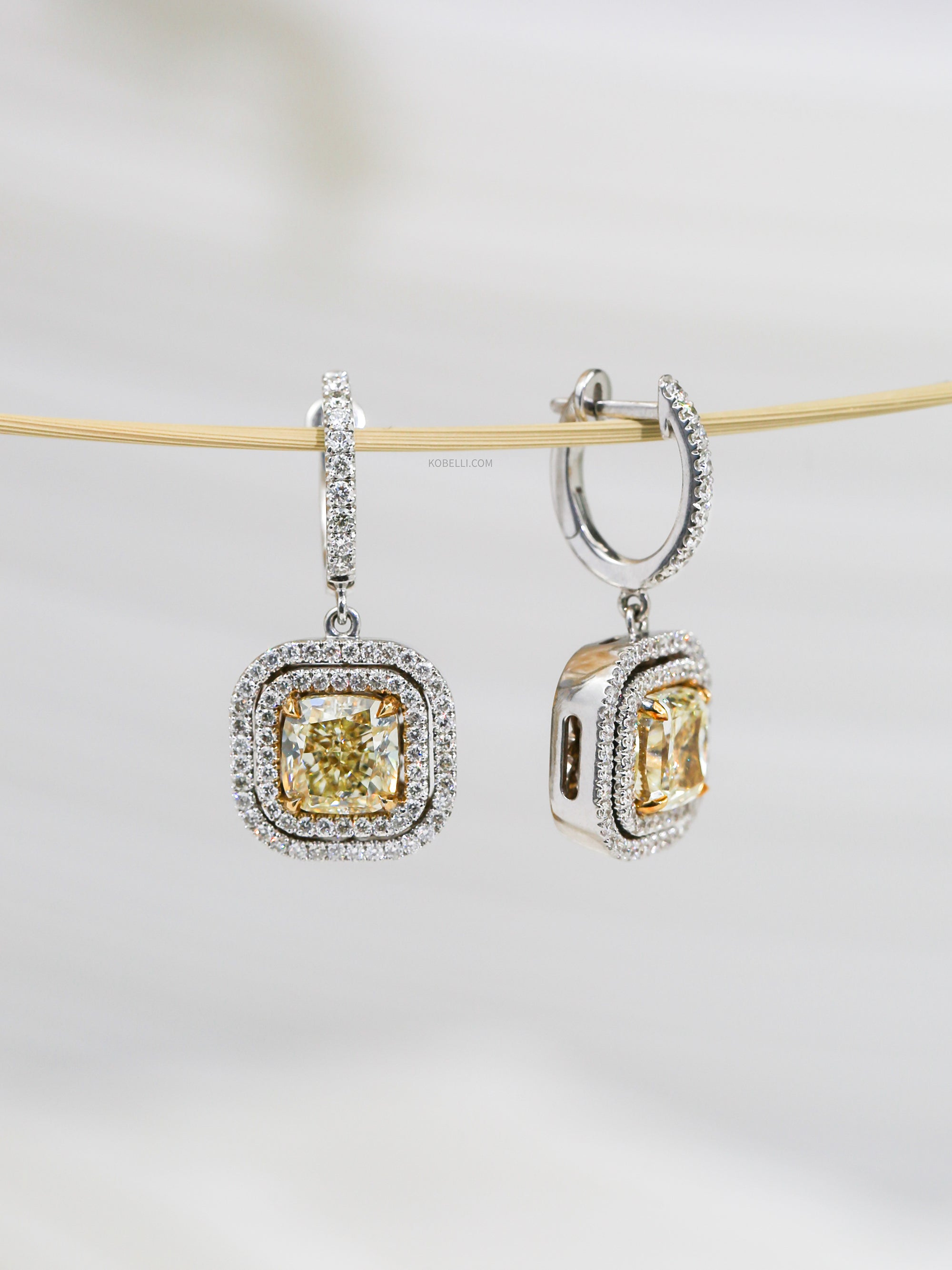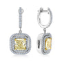 These square retro dangles carry luxurious yellow diamond centers in double halos. The earring pendants hang from diamond hoops with secure backings.