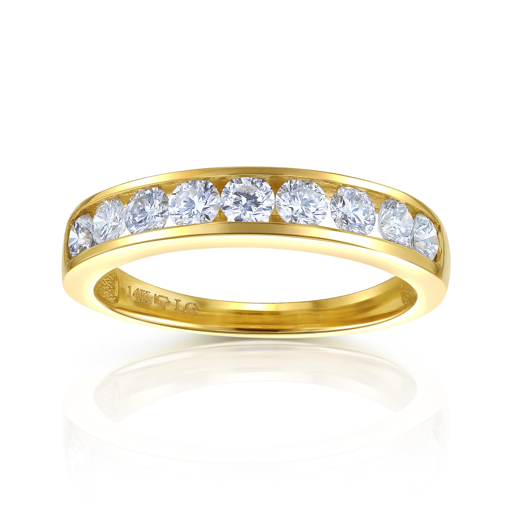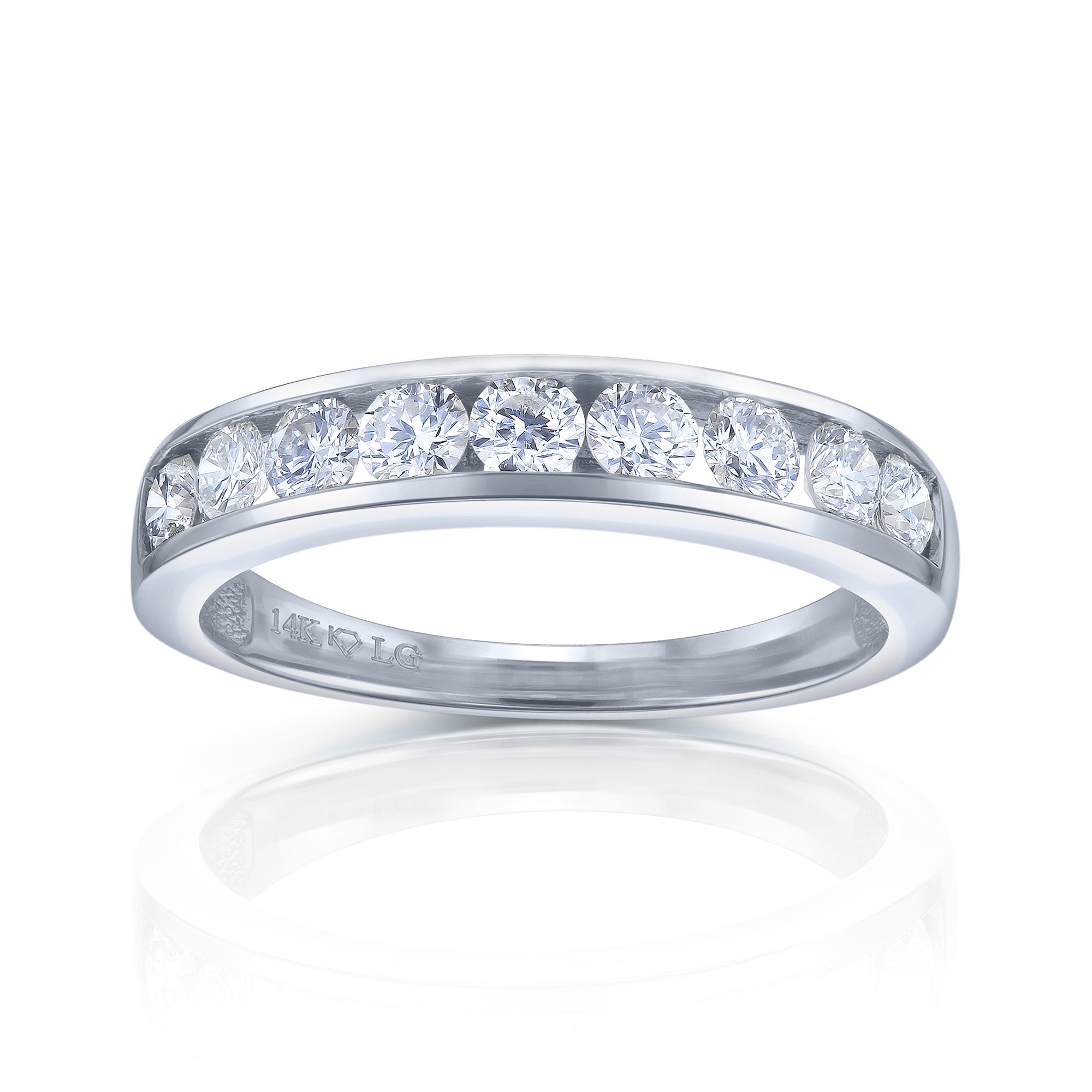 Gorgeous round brilliant-cut diamonds line this ring in a channel setting. Each diamond is graded at DEF color and VS clarity.