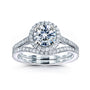 Clamping just under the rim of your diamond halo is a wide curved wedding band. From a top view, the combination draws its connecting points from the very center setting and the ends of the two bands. Your bands stack fully together about three-quarters of the way around with the middle setting area showcasing a gentle split to wrap the halo.