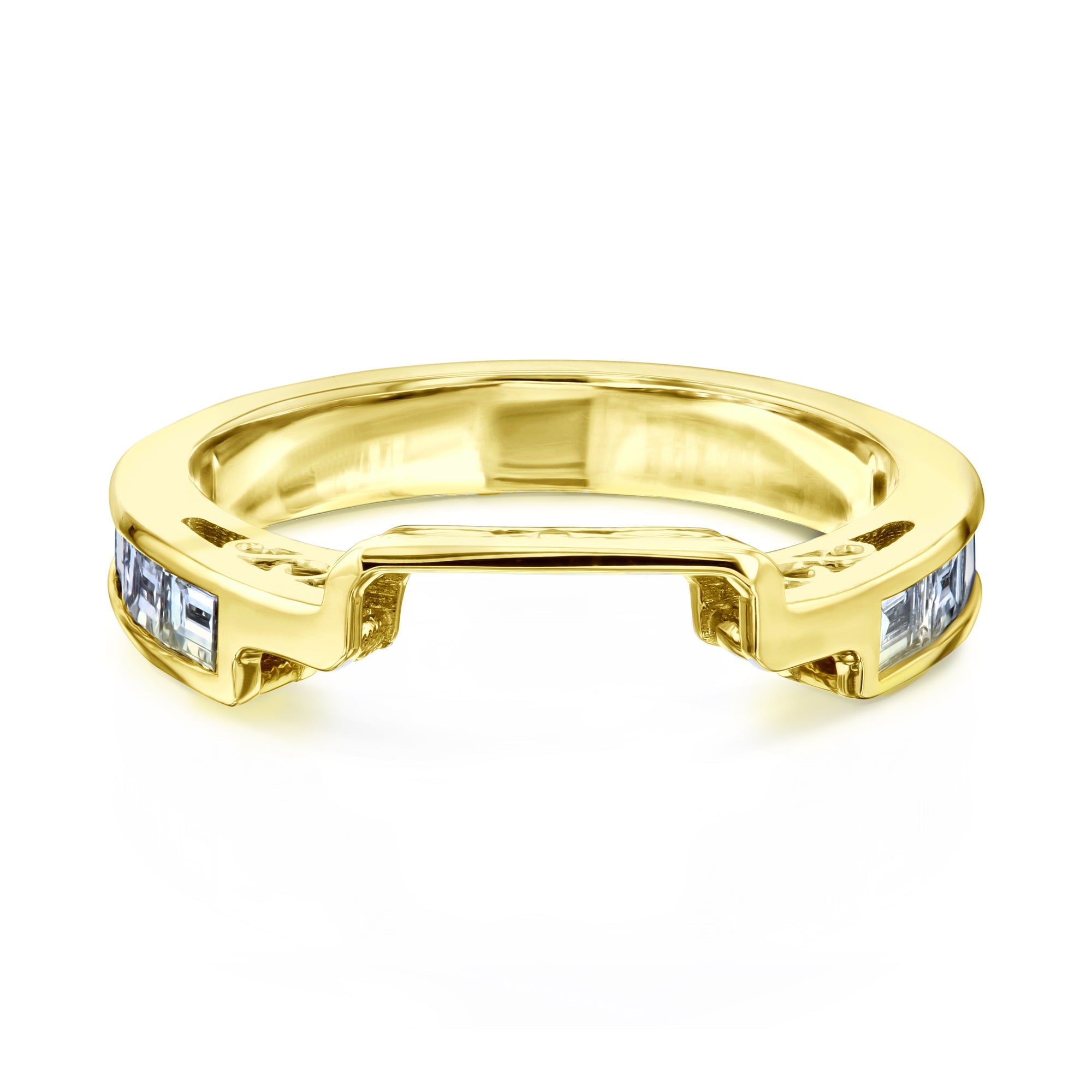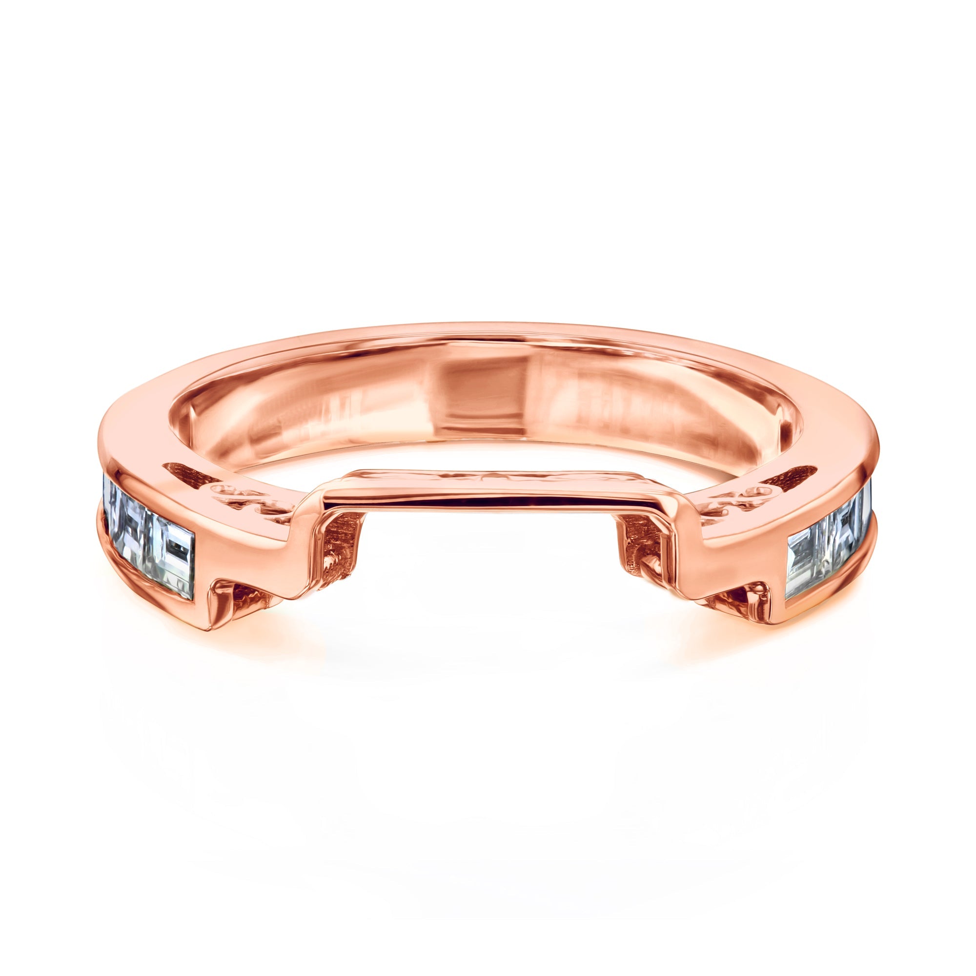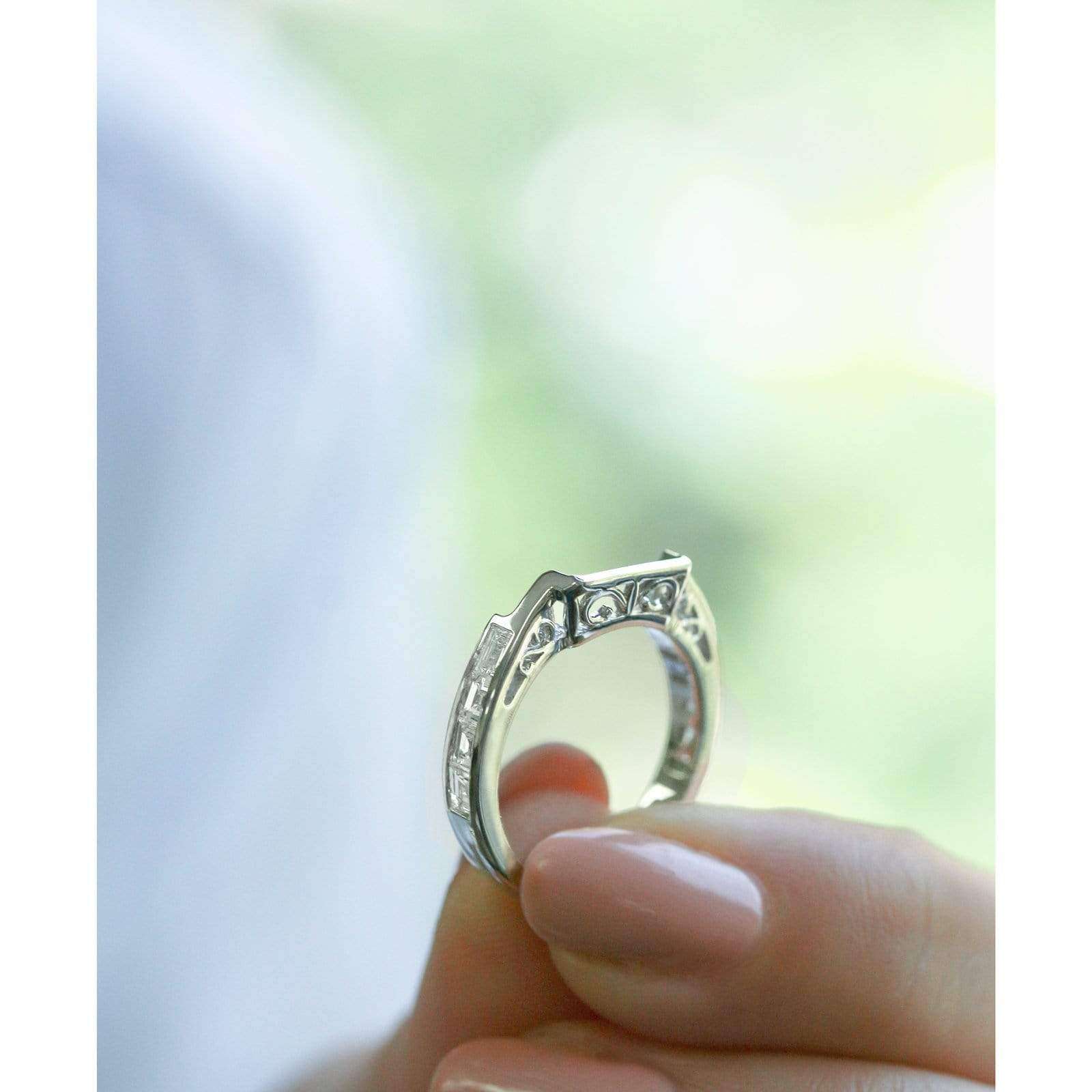 Designed to fit specifically with the 62340 Series, this wedding band displays a vintage swirling design with step faceted baguette-cut diamonds. The diamonds line to the band of the 62340 engagement ring for a continuity from the center emerald-cut stones.