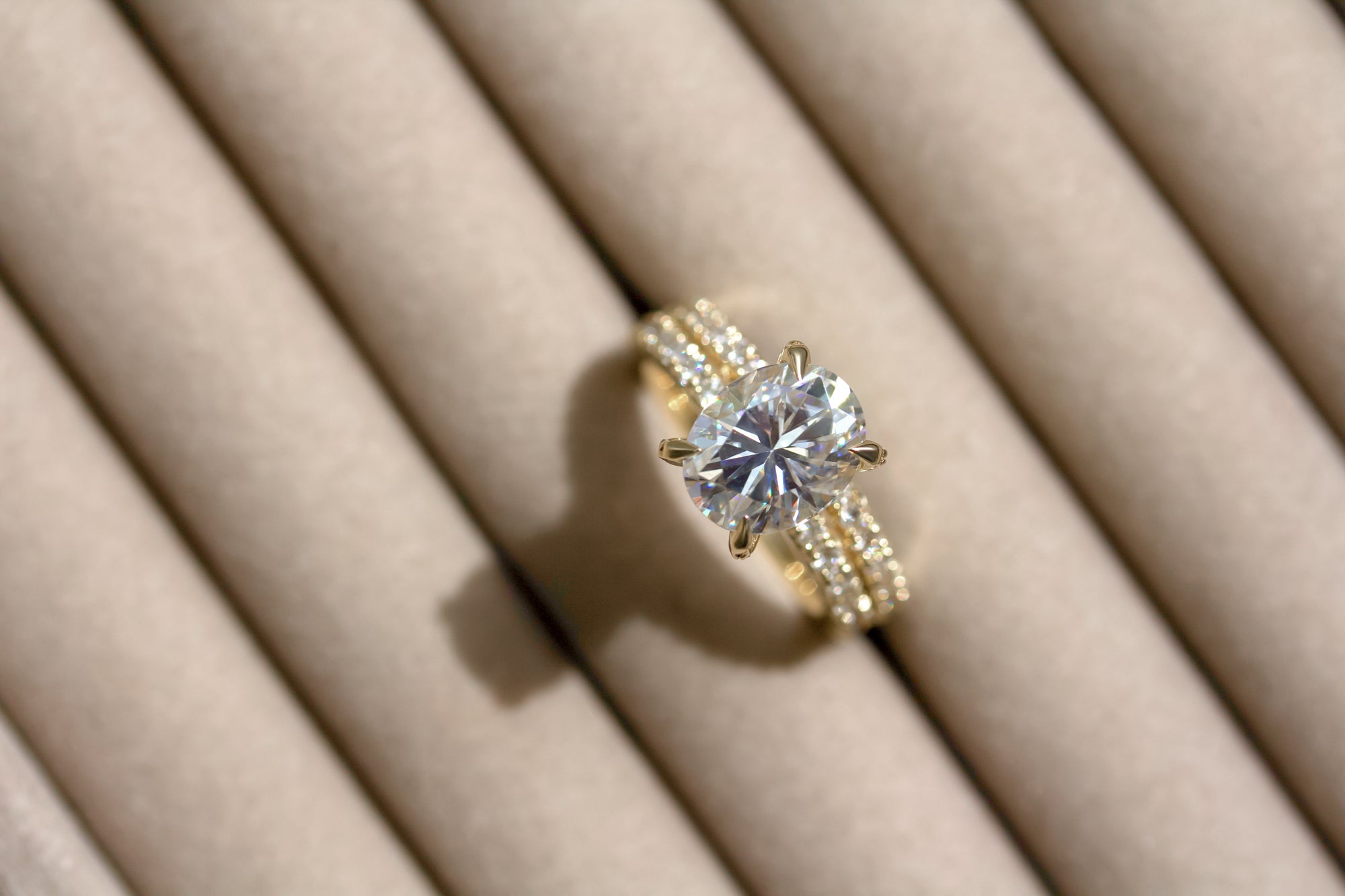 A gorgeous 3 carat oval moissanite tops this slender diamond-lined engagement ring in 14k gold. The open claw-prong setting exhibits a graceful open design where the entirety of the the stone's depth can be seen from the crown to the pavilion. Completing the ensemble a diamond-lined wedding band, matching perfectly to the band of the engagement ring.