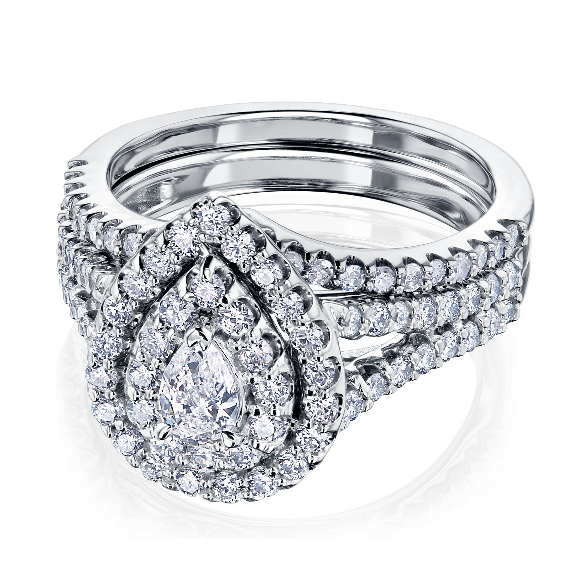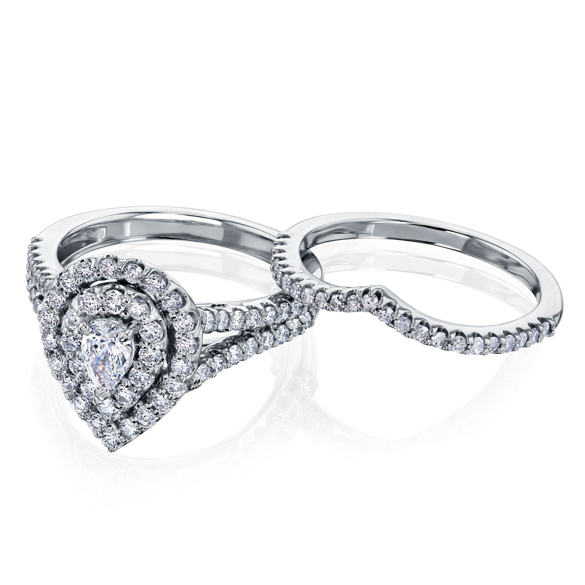 A double halo of round natural diamonds surround a 1/5 carat pear-shaped natural diamond to complete the cluster focal point of this brilliant two-piece bridal set. The engagement ring's diamond-encrusted split shank design is a great addition to its grandeur. The set comes with a chevron style matching band adorned with 23 round natural diamonds for that extra sparkle. Diamond cluster styles are a great way to achieve a bolder and sparklier look without breaking the bank! Because the diamonds are set so closely together, these clusters resemble exceptionally larger and brighter centers. With the various shapes and sizes, the rings illuminate with every movement.
