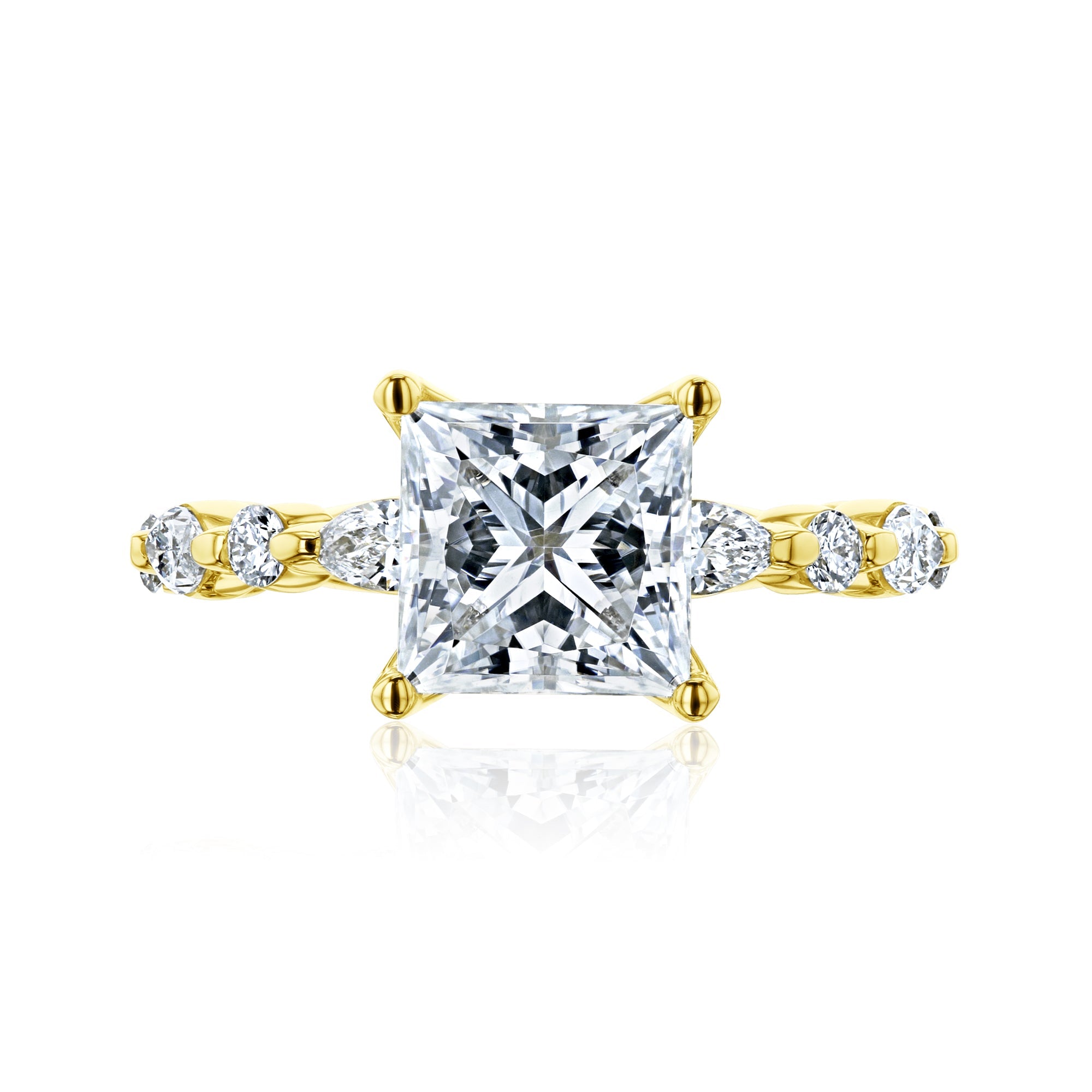The sisters of our Bare Collection. Daringly bold center stones top these slender bead prong bands with twinkling blossom tops in an open design. The diverging widths from center to shank brings a delectable appeal of youthfulness and grace.