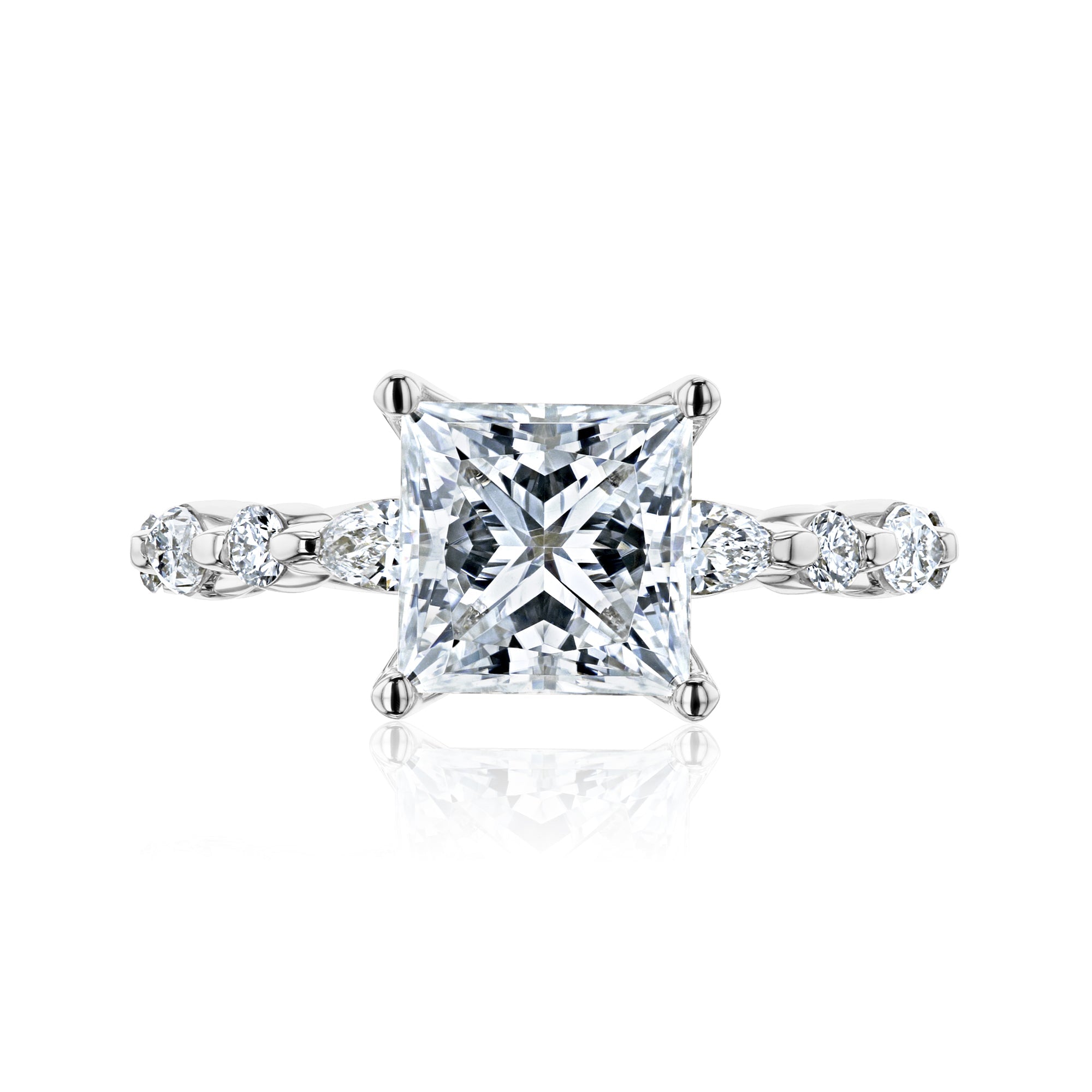 Bringing multiple design elements together from what we do best, this bubble band engagement ring carries a large 1.75 carat moissanite center stone, and a series of lab-grown white diamonds of alternating shapes for an additional 3/5 carats gemstone weight. Topping the ring is a series of petal shaped blossom prongs with an open girdle.