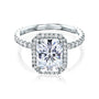 The Renee 9x7 engagement ring features a 9x7 mm (2.7 carats diamond equivalent weight) radiant moissanite center stone surrounded by a halo of lab-grown diamonds in a slim basket setting. The shank is illuminated with pavé lab-grown diamonds in a semi-eternity fashion.
