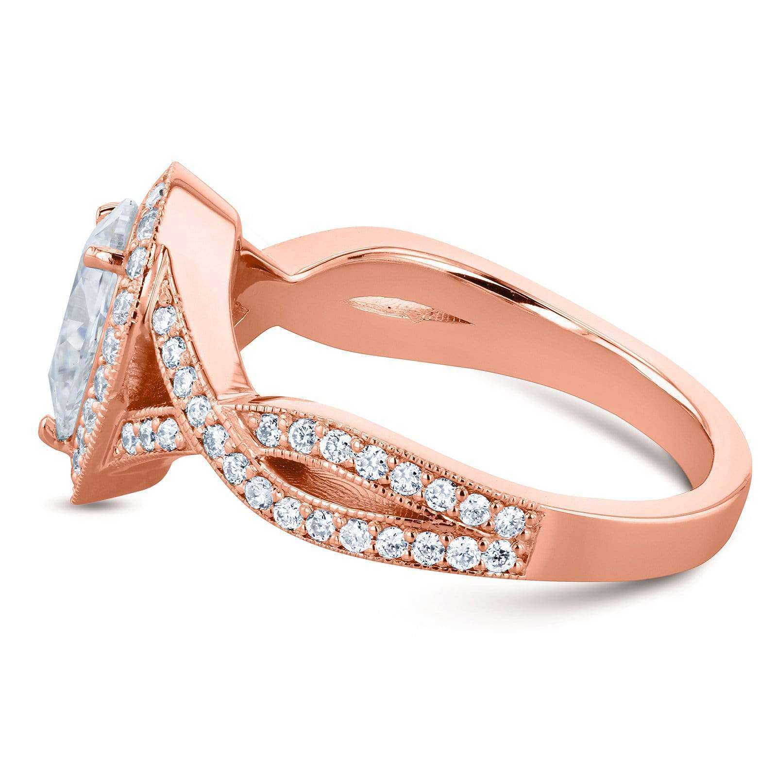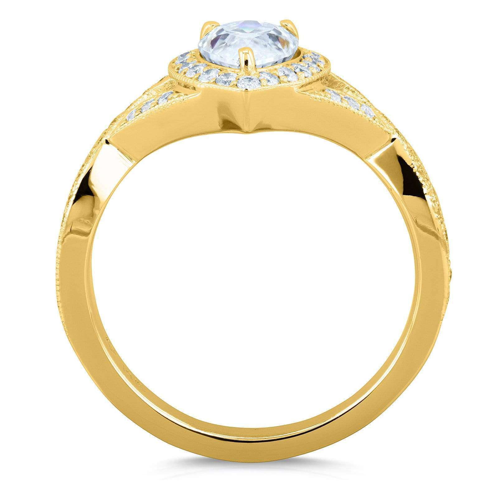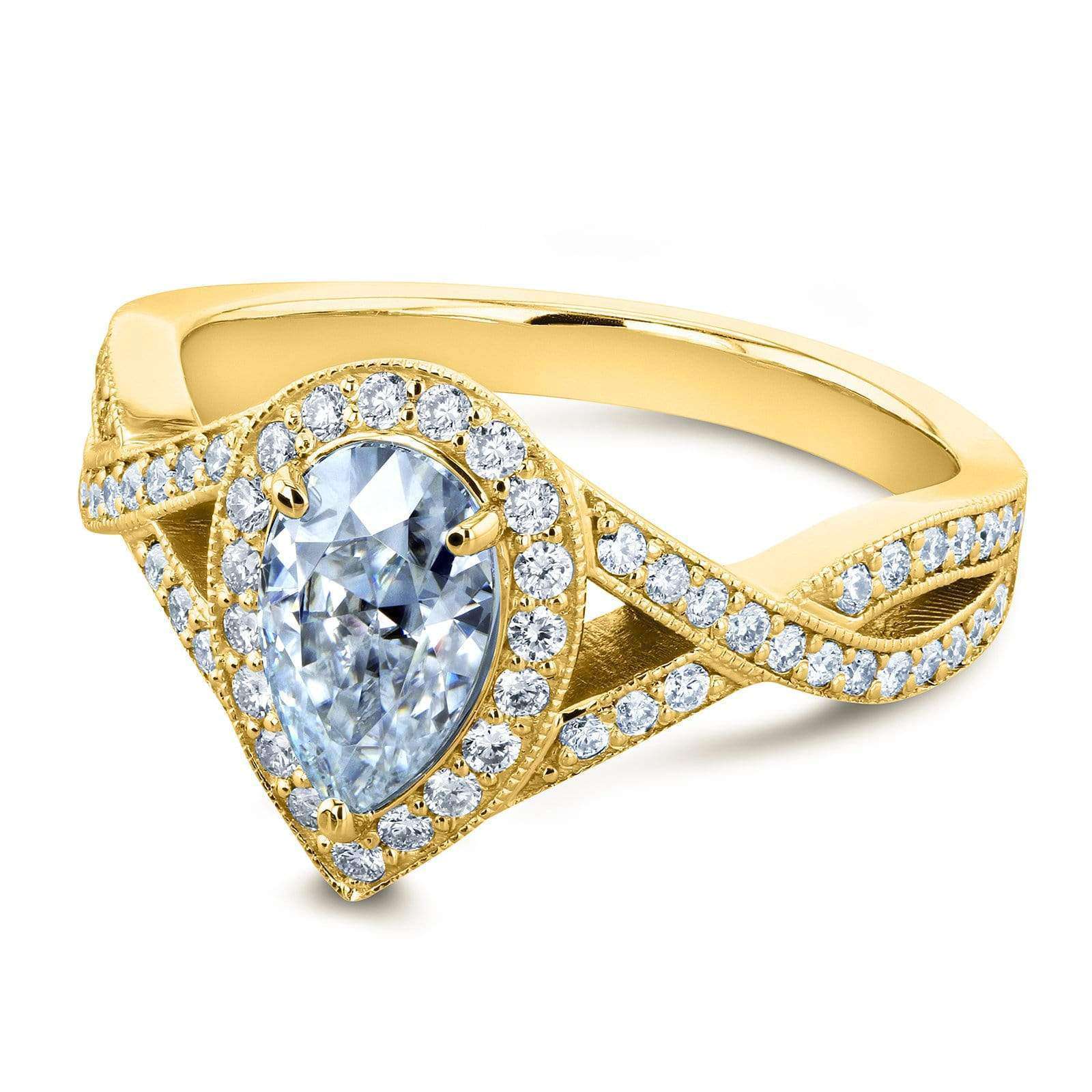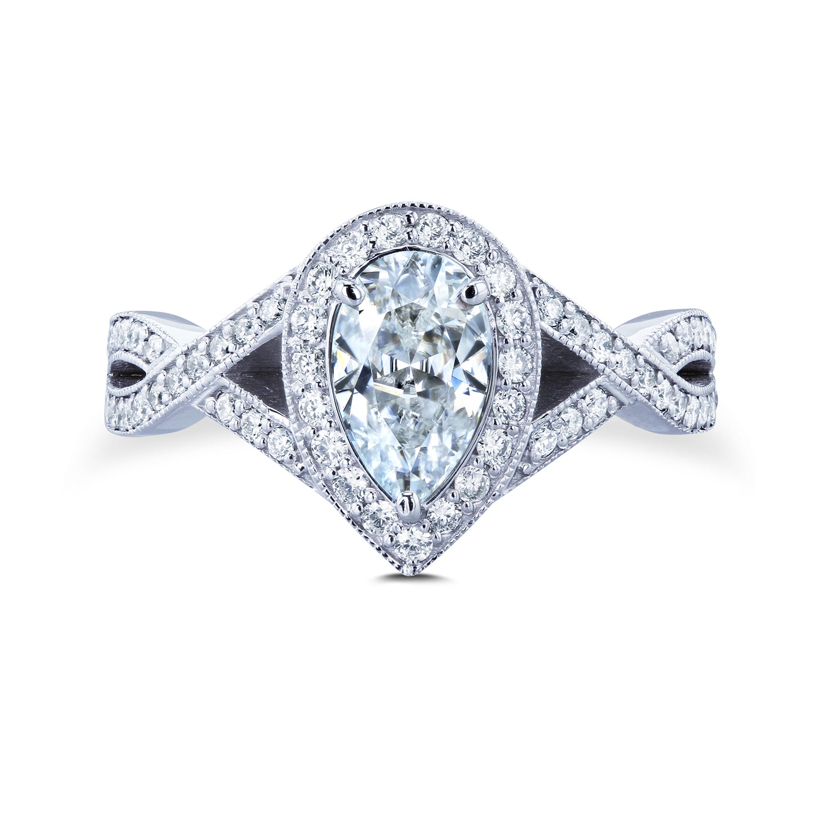 A sparkly pear shaped center is set within a diamond halo on this cross-over twist style diamond band. The ring carries 70 diamonds running halfway down the band. The ring is finished with a bright polish in 14-karat gold bringing a luscious shine to best compliment the shining stones.