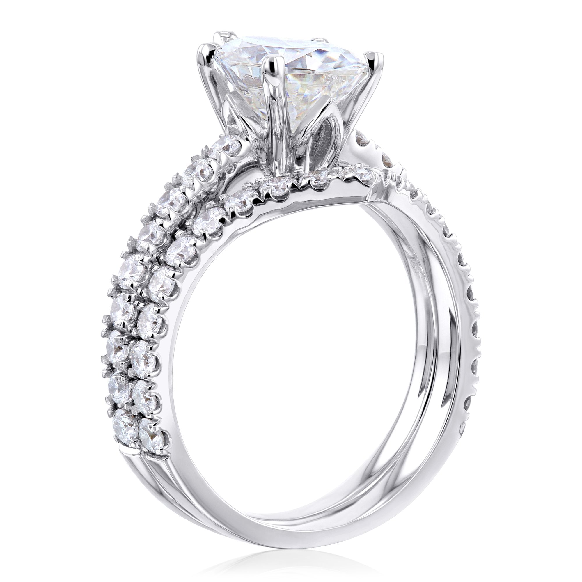 A 2.10 carat pear shaped moissanite tops this diamond band in solid 14-karat gold. Five prongs grip your center stone ensuring that beautiful big rock is going nowhere. All smaller stones on both the engagement ring and wedding band are natural grown white diamonds mined from Earth's finest sources (1 carat total). The conflict-free diamonds pair to the moissanite center stone in synchronized harmony.