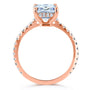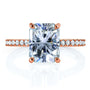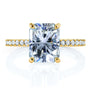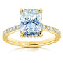 Proudly flaunt your wifey status with this crowd-pleasing engagement ring that sparkles in all the right places. A large 9x7mm radiant-cut moissanite is carried to the top of this diamond-lined engagement ring. Mixing the lab-created center stone with the earth-mined side stones makes for ideal use of both these stone types. The moissanite is best displayed in large sizes to showcase its well-known trait of brilliance and fire. The diamonds string together for a glittering visual to enhance the ring in both beauty and luxurious rarity. The stones are set into 14-karat gold which is finished with a high polish to offer the ideal shine of wedding jewelry.