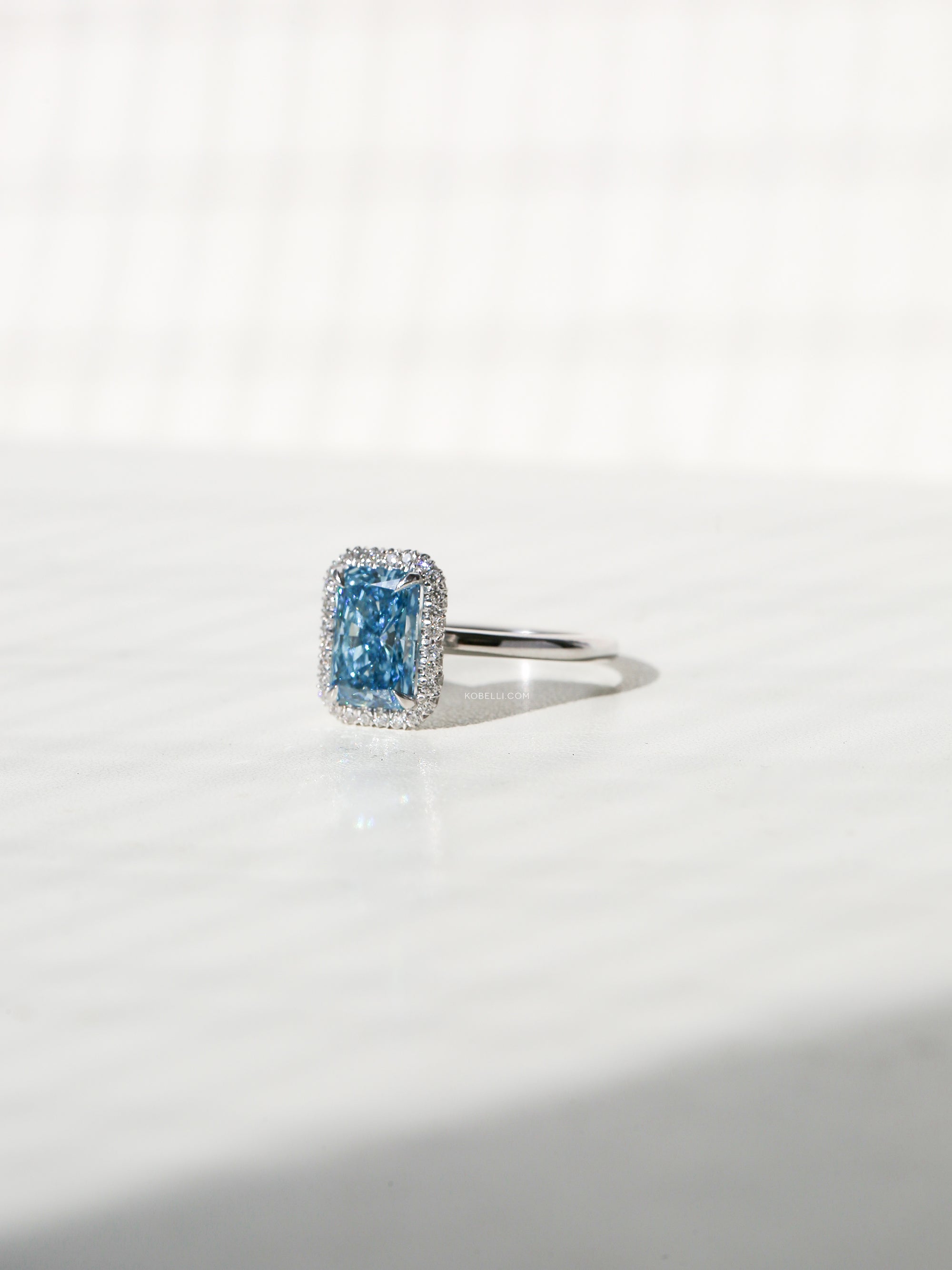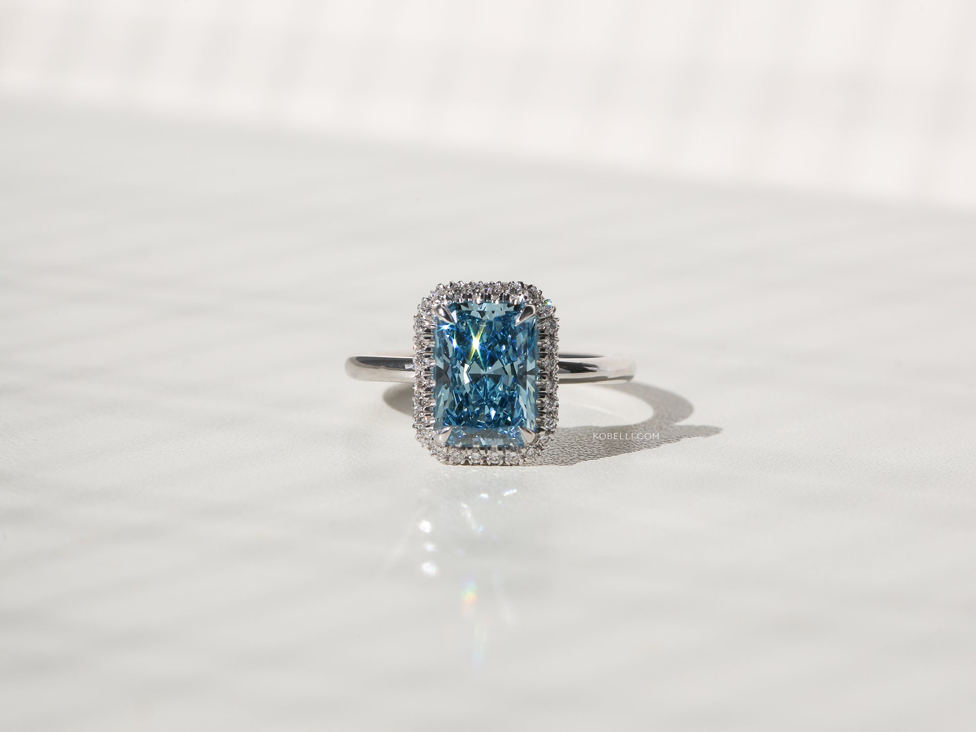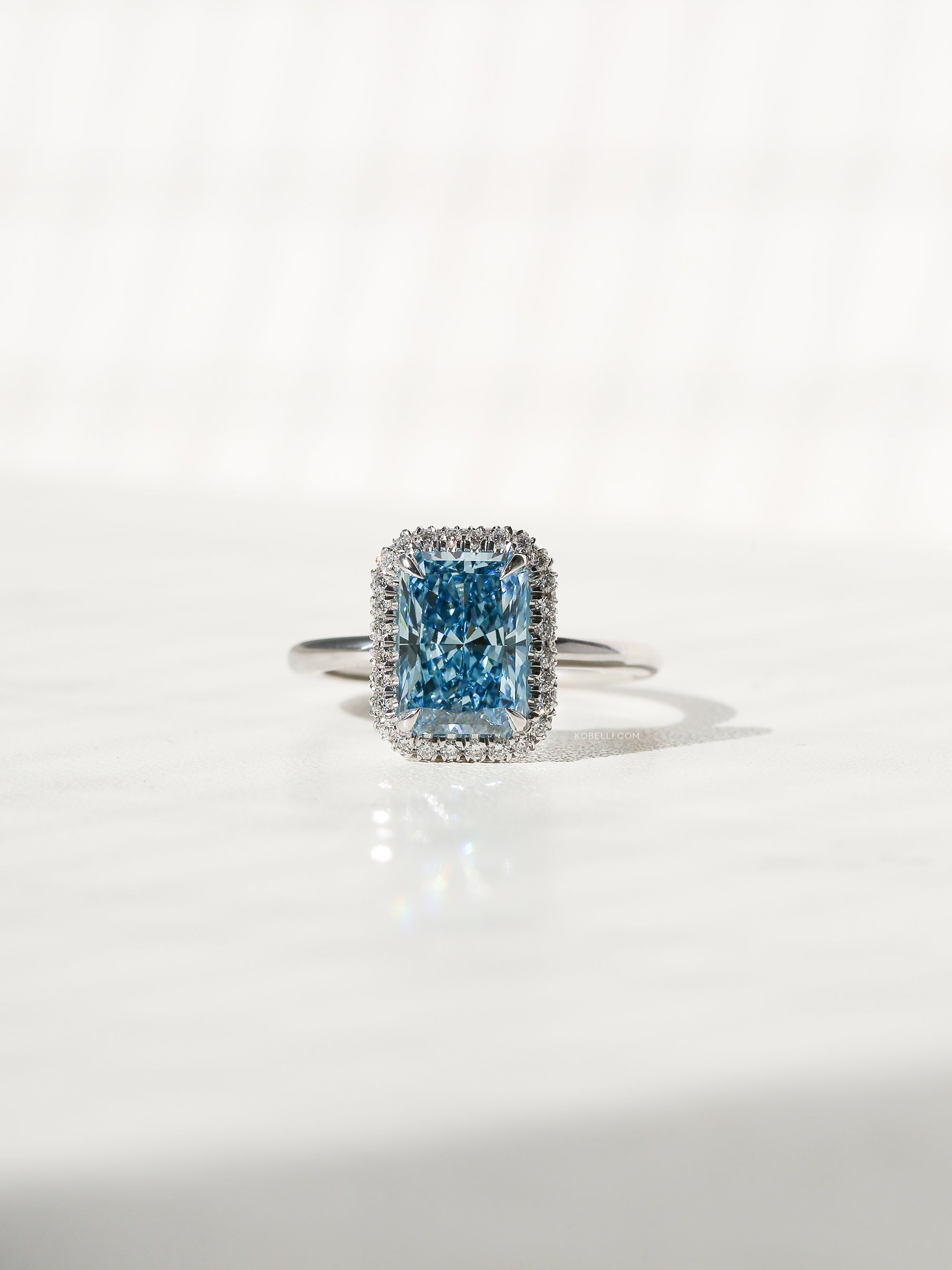 The Aomori Engagement Ring features a radiant-cut Fancy Vivid Blue Diamond center stone with a floating basket setting, and double white diamond halos. All stones on this ring are reliably lab grown.