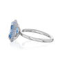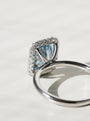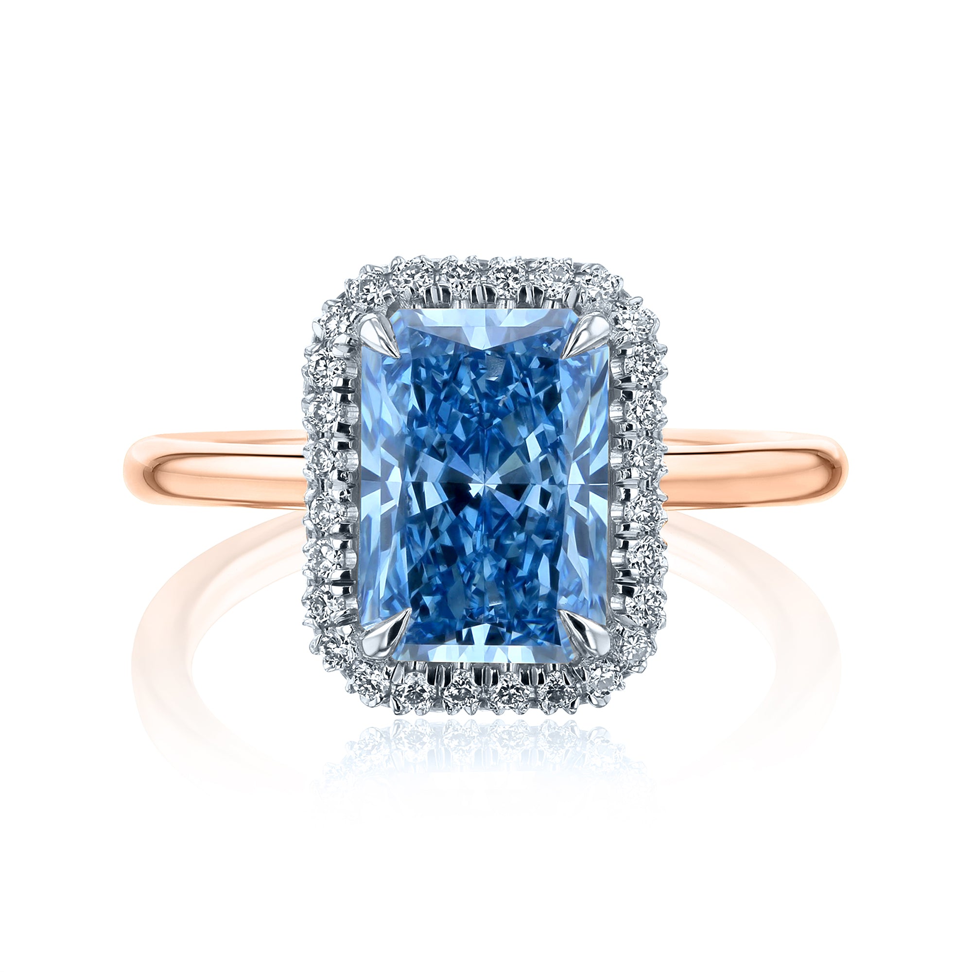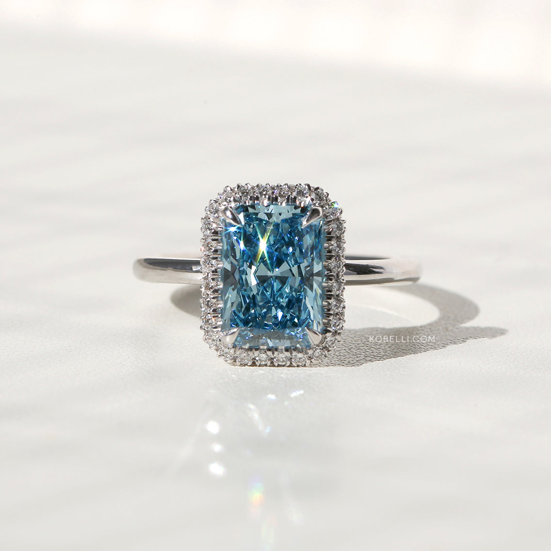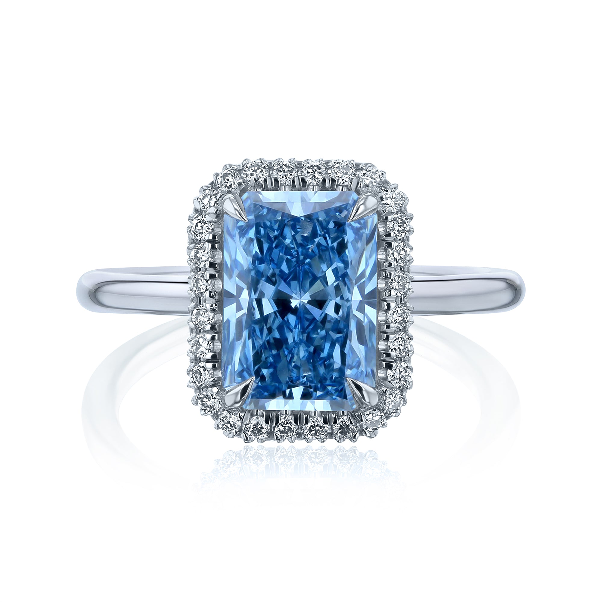 The Aomori Engagement Ring features a radiant-cut Fancy Vivid Blue Diamond center stone with a floating basket setting, and double white diamond halos. All stones on this ring are reliably lab grown.