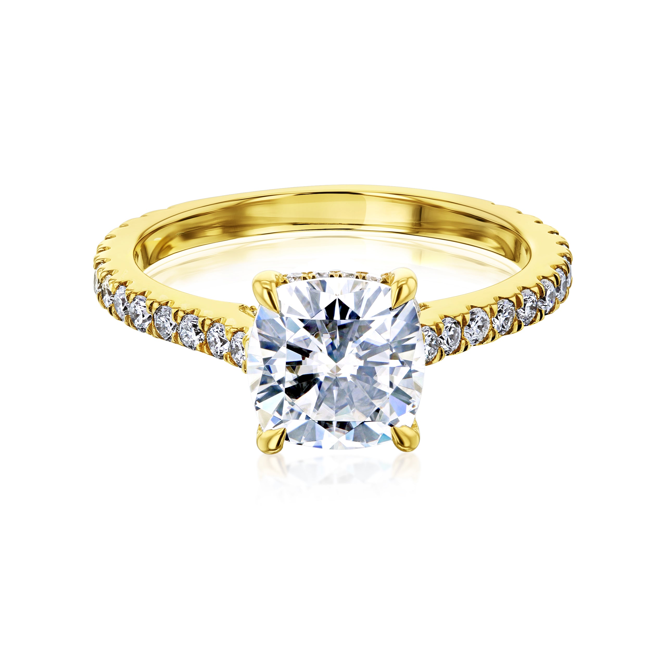 Celebrate your special moment with Kobelli as we push the limits to bring you one of our best cushion moissanite engagement rings. Our Camilla 2-carat cushion-cut cathedral engagement ring is a beauty to behold. The center stone is combined with a hidden halo and 56 diamond side stones that extend half-way to the shank. This ring is bound to give you a unique experience that lasts a lifetime.