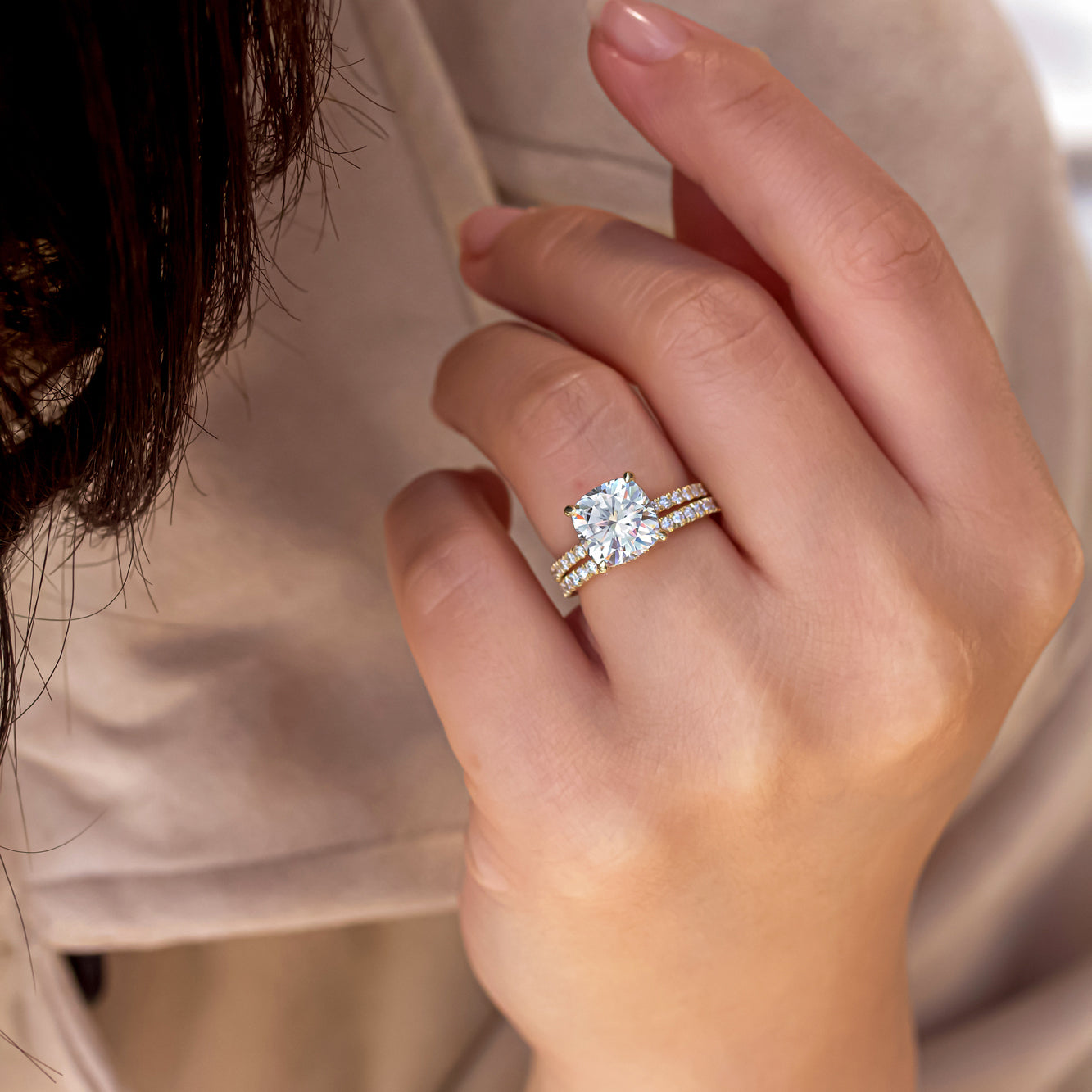 Featuring sleek and timeless pieces that transcend generations, these styles embody slim and feminine silhouettes with large show-stopping moissanite centers.