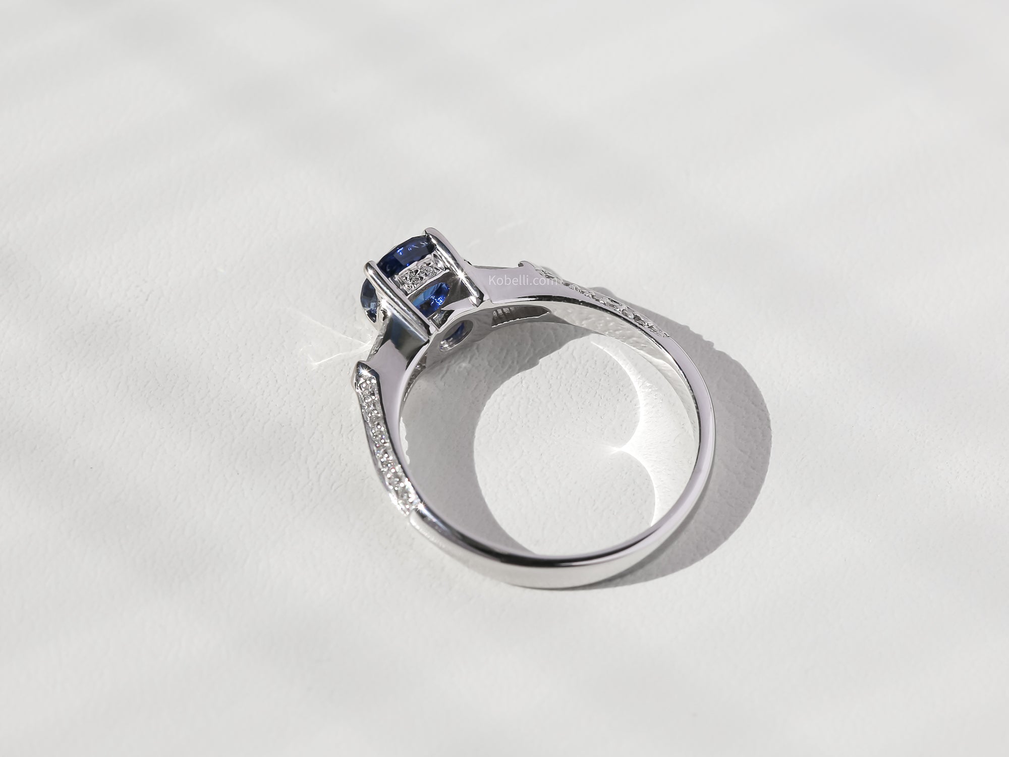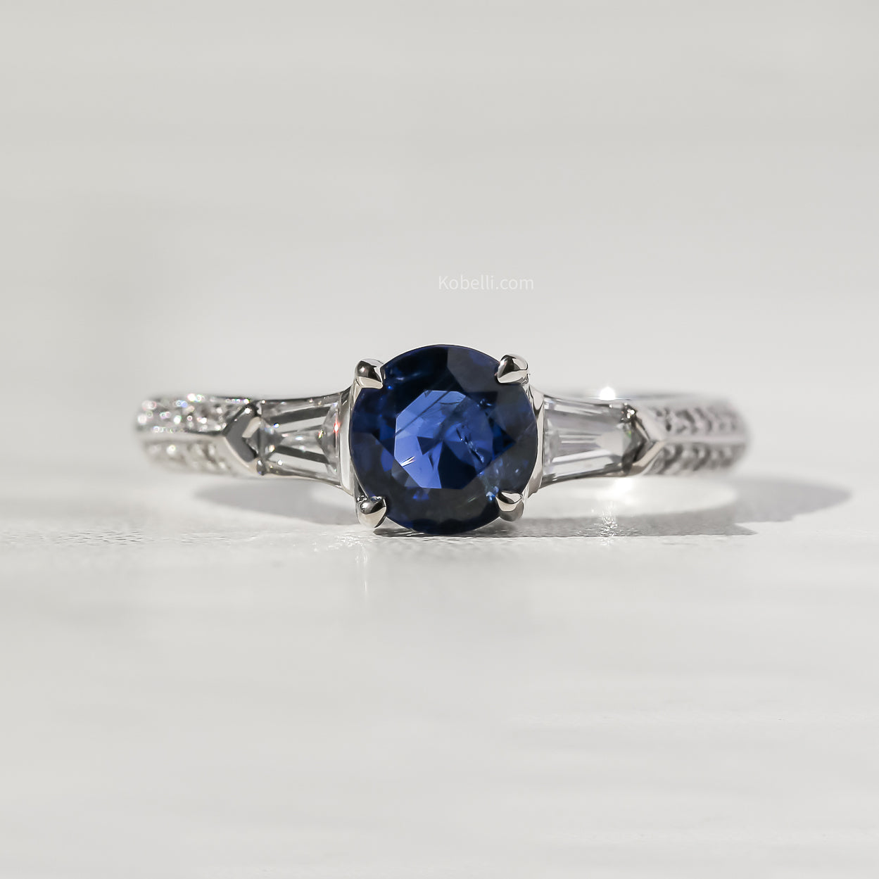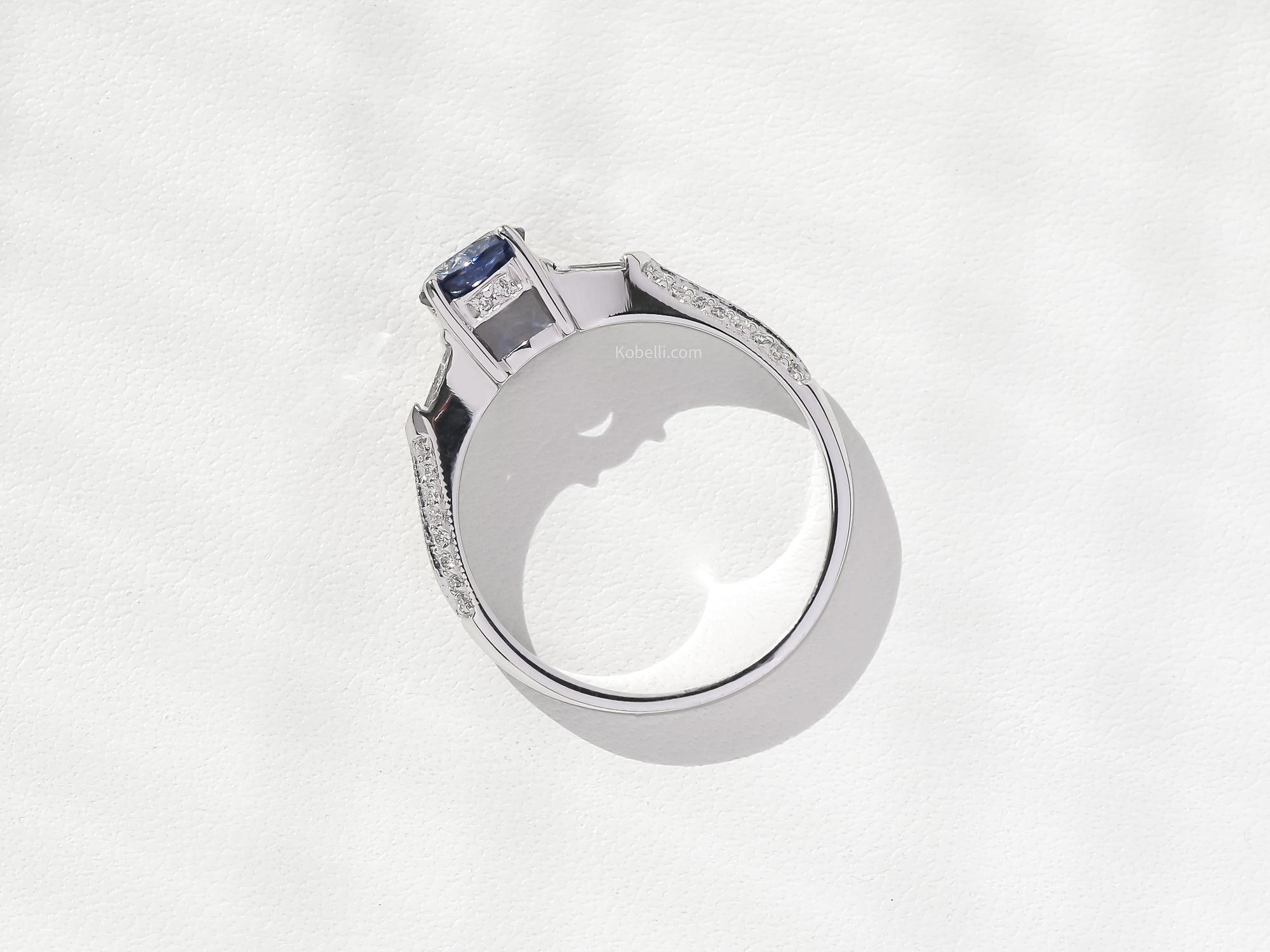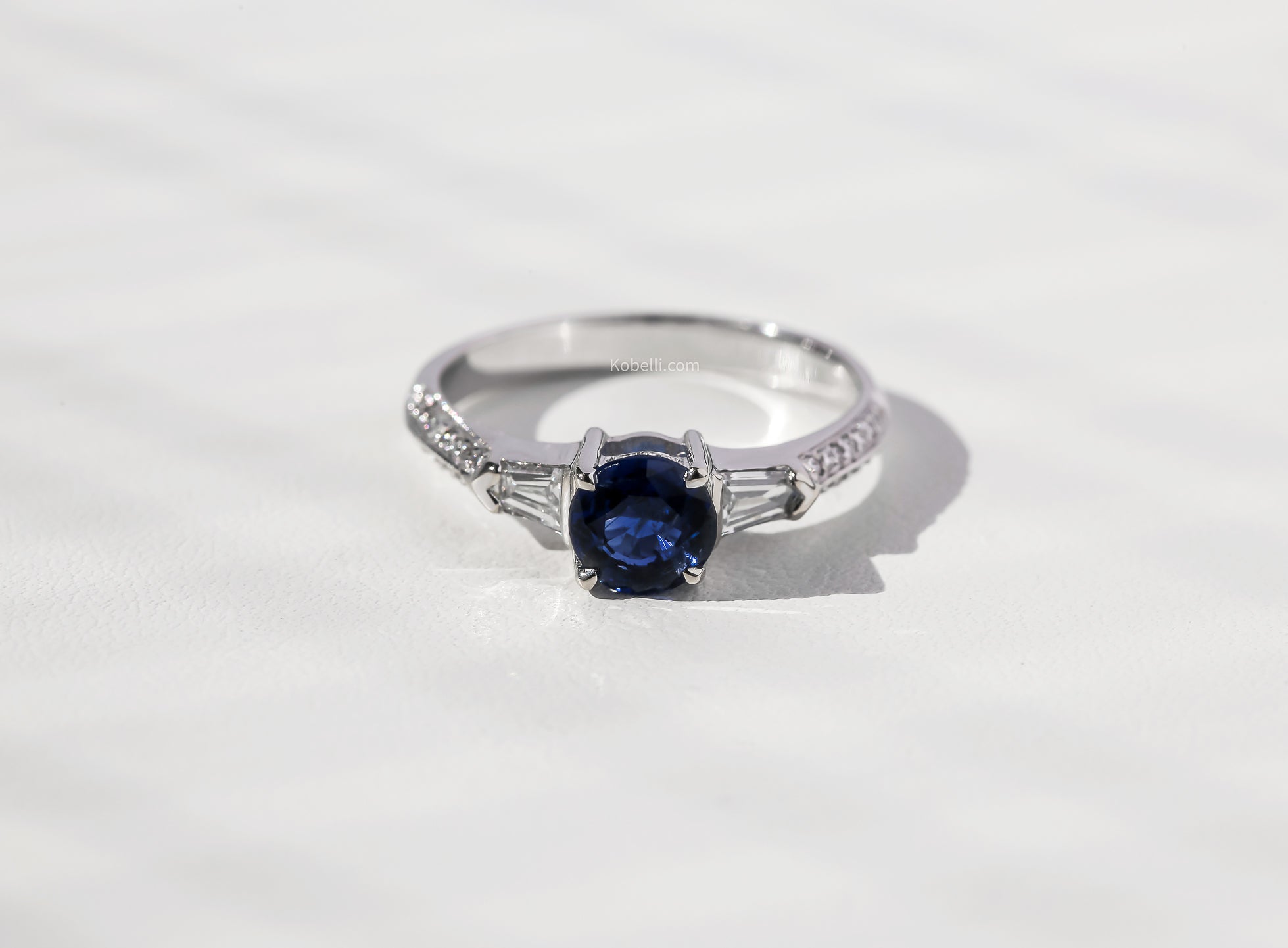 A 0.90 carat bright blue sapphire sits atop this diamond ring in solid 18k white gold. To the left and right of the center are beautiful bullet shaped diamonds. Two rows of pave-set accent diamonds line the knife-edged band.