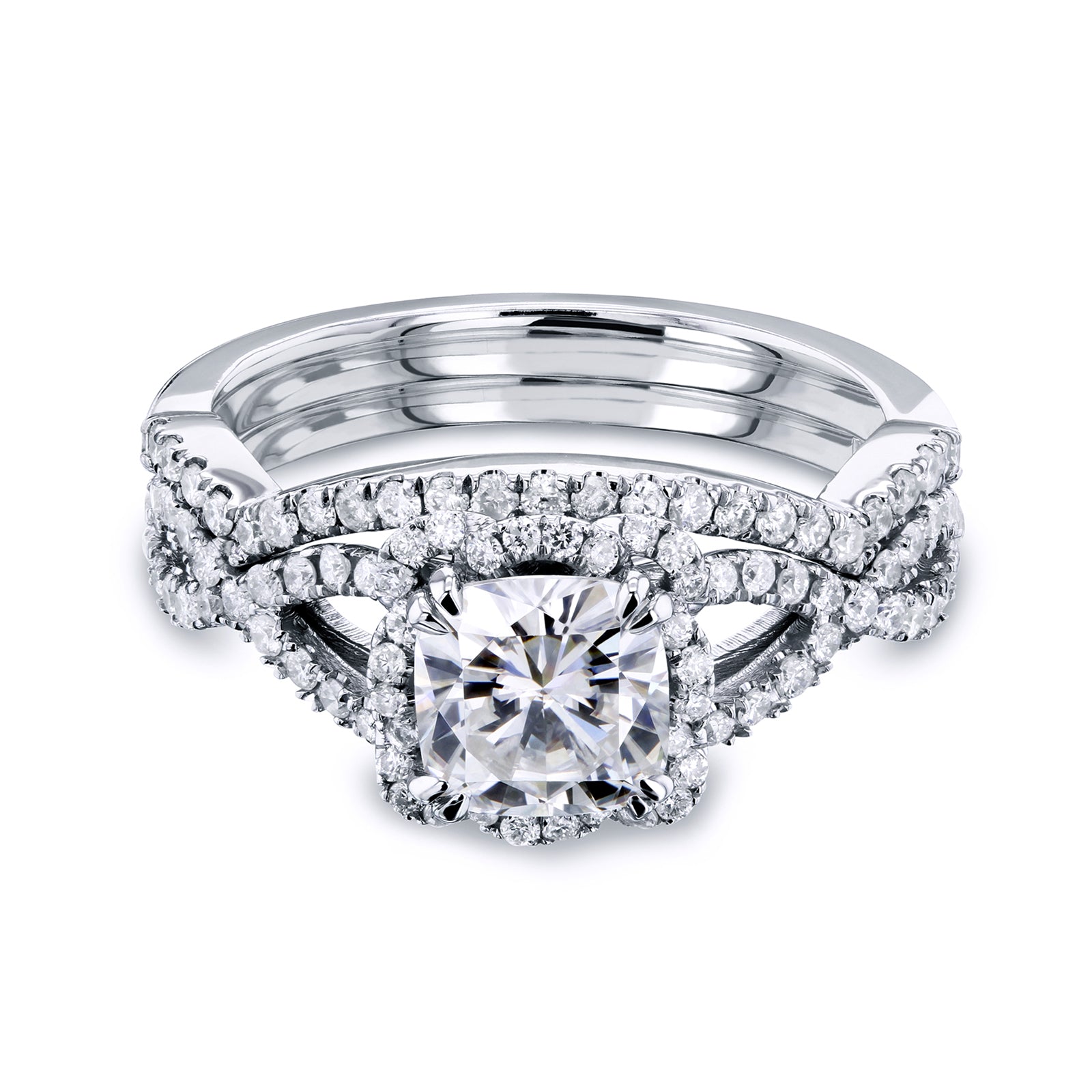 Real white diamonds wrap around a lab-grown moissanite center stone on this 14k gold bridal set. The ring twists into an open cross shank. Four loops along the bridge of the ring lead into the halo for a fancy halo setting.