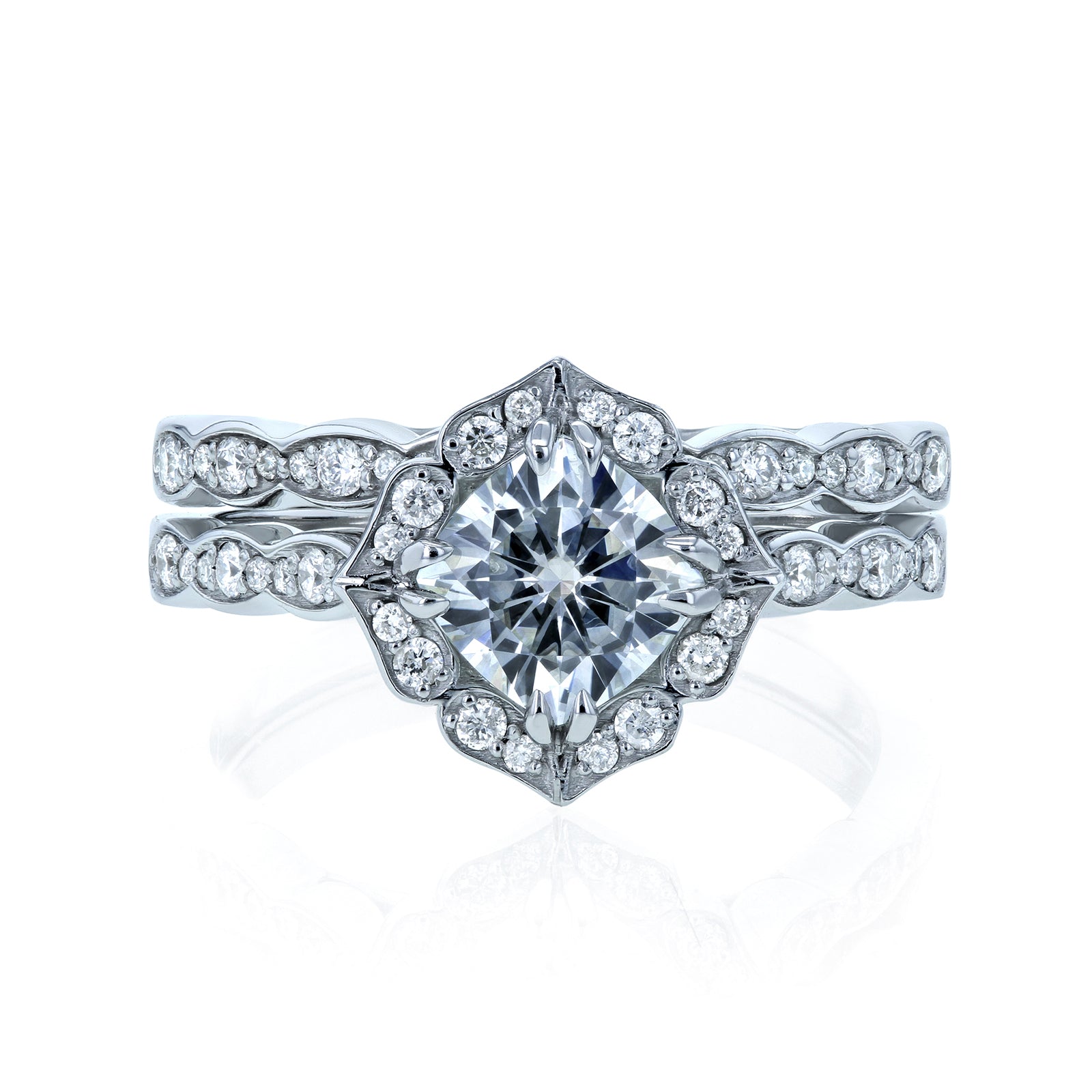 A 6 millimeter cushion cut moissanite is prong set on this 14-karat white gold one-of-a-kind bridal set. A series of natural diamonds are placed alongside the created moissanite gemstone center for a mix of colorless stone brilliance of ideal qualities.