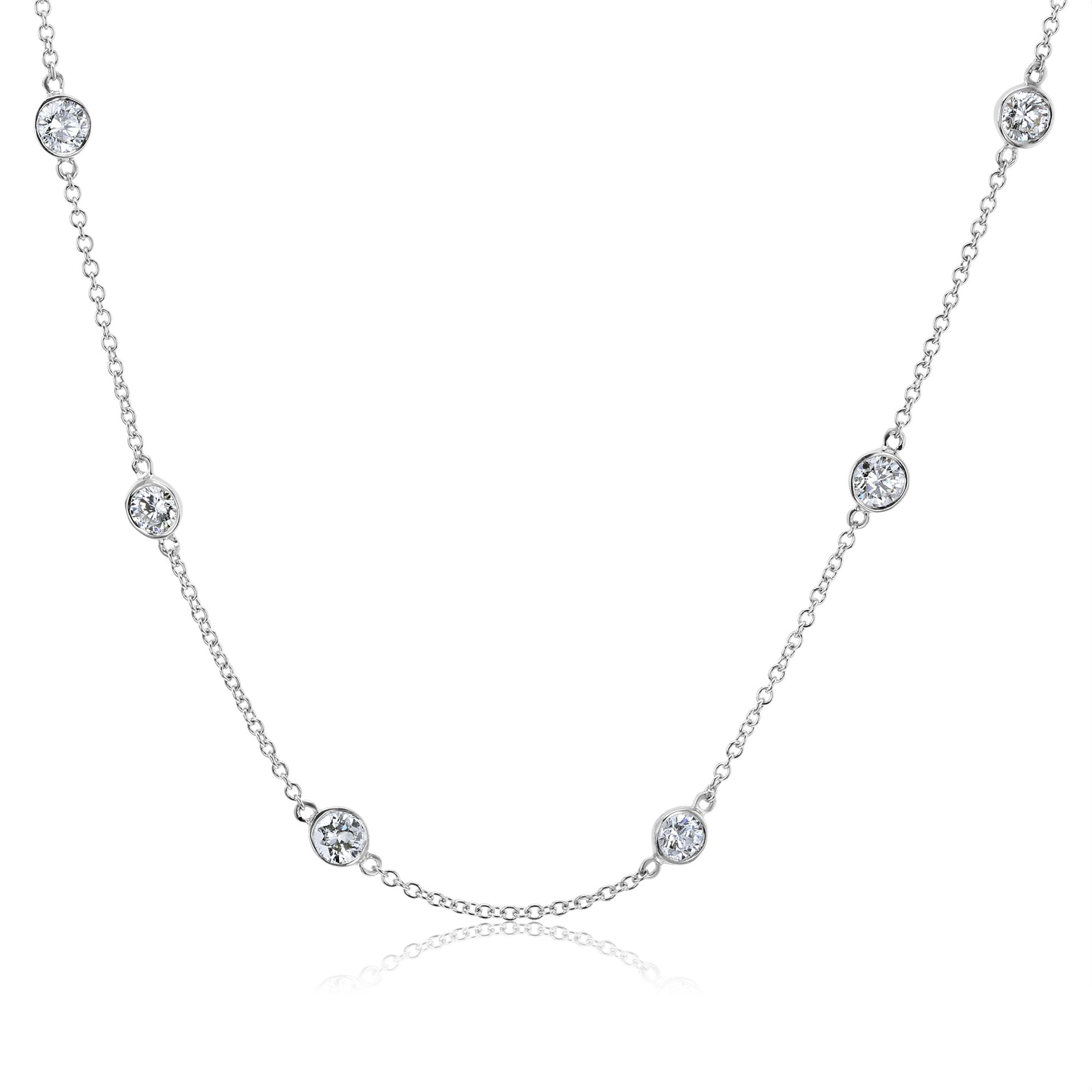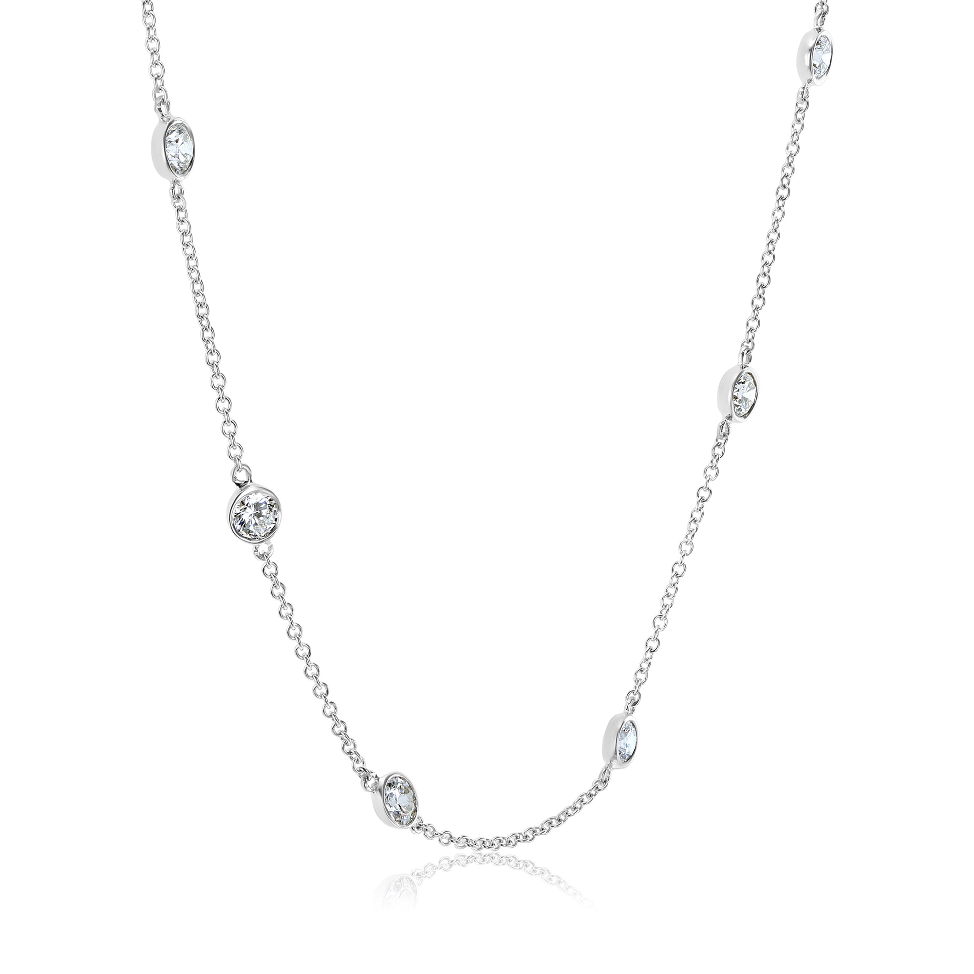 A modern and shorter take on the classic station necklace style. This choker features 8 round-cut bezel-set diamonds for a total of 2 3/10 CTW cascading down a 16-inch chain made in 14k white gold.