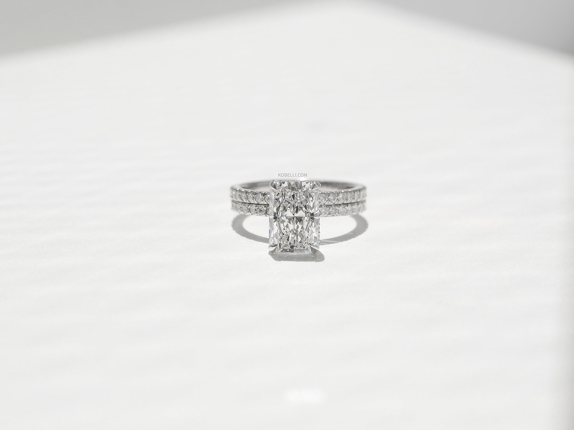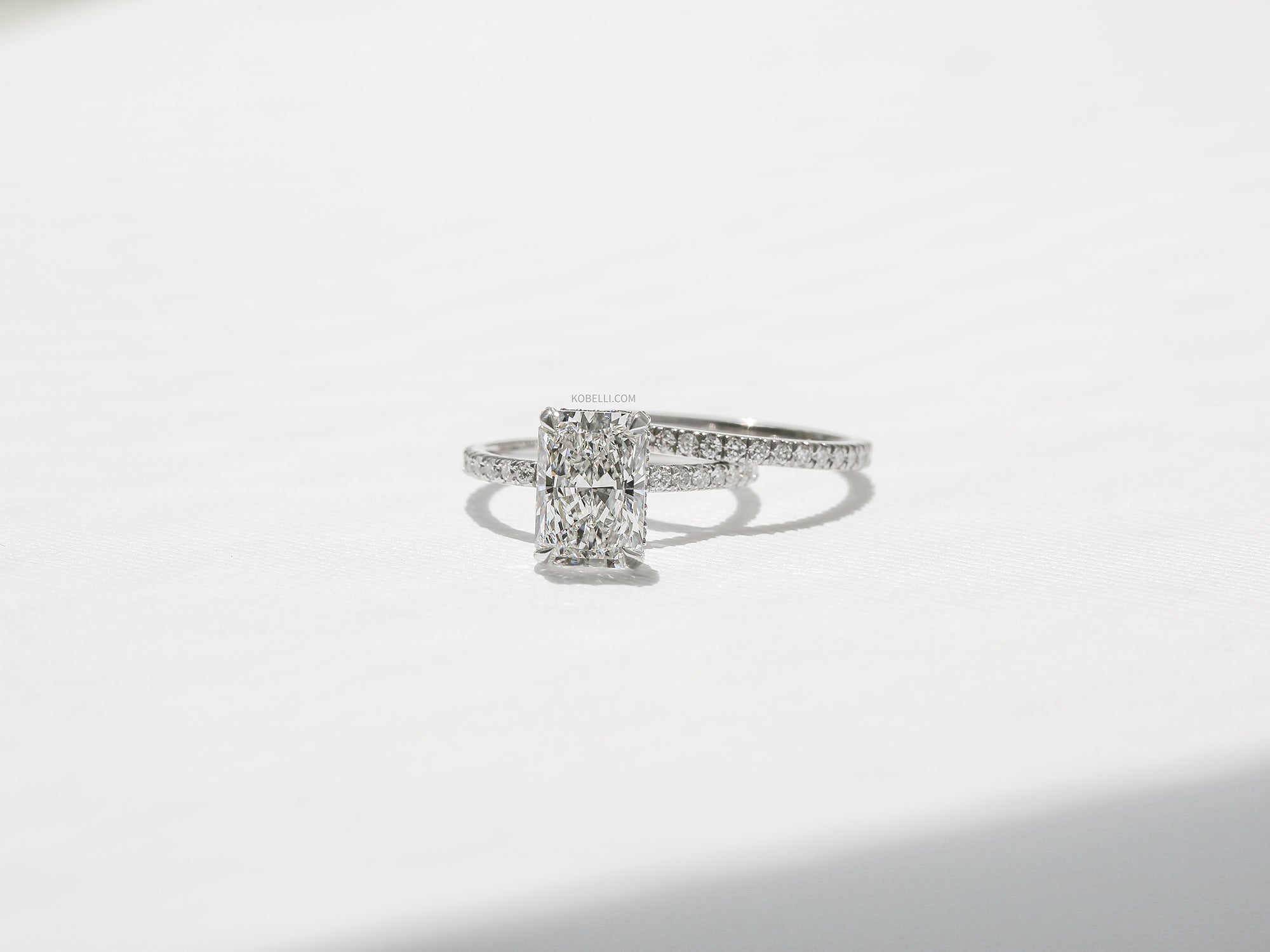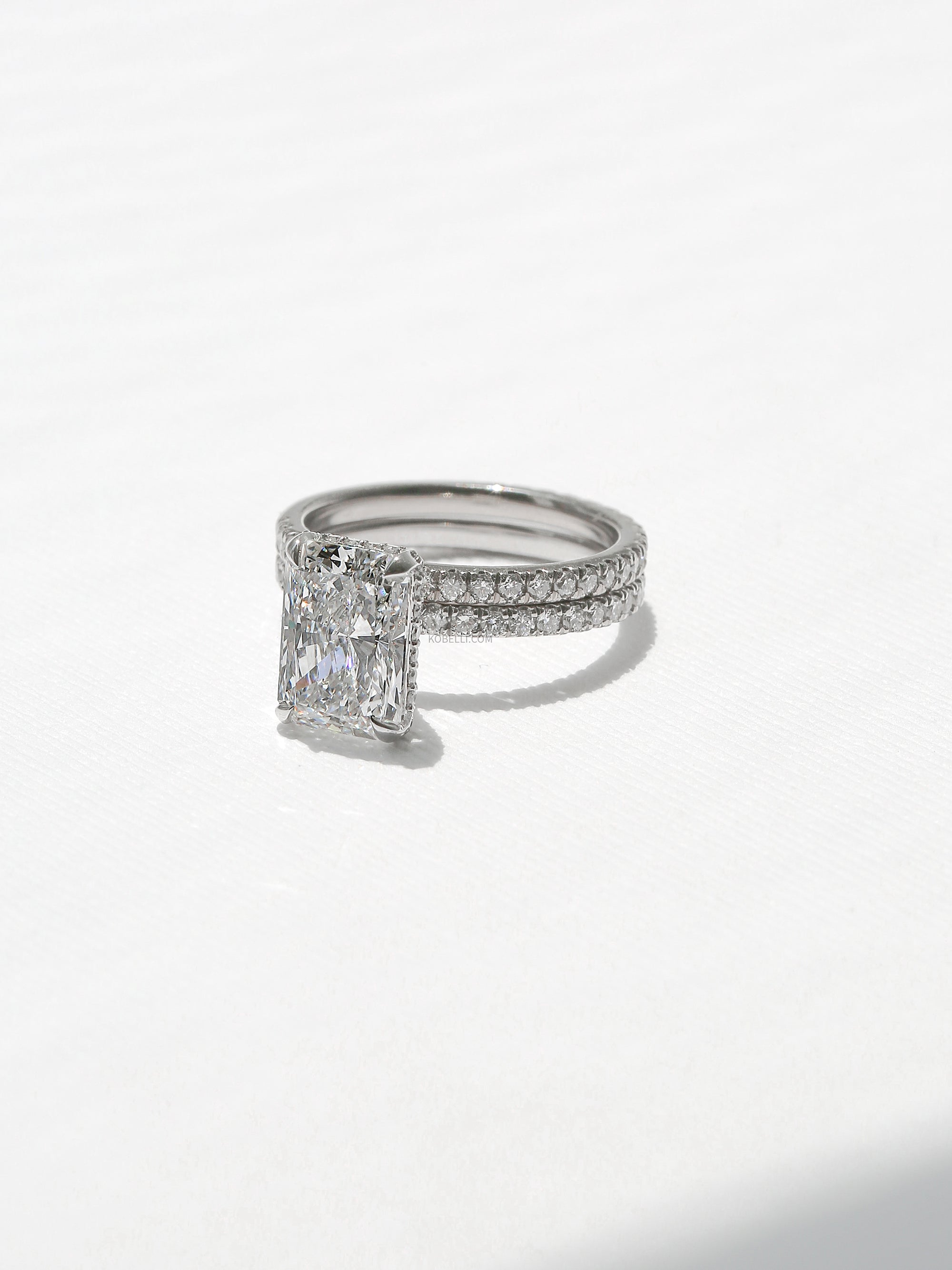 The Elongated Riri engagement ring features a breathtakingly crisp radiant brilliant-cut diamond center stone with a hidden halo of additional diamonds in a slim basket setting. The basket and shank are illuminated with pavé lab-grown diamonds in a design we call, a hidden wrap halo. The diamonds along the band are set in a semi-eternity fashion ensuring a diamond sparkle in every movement under the sun.