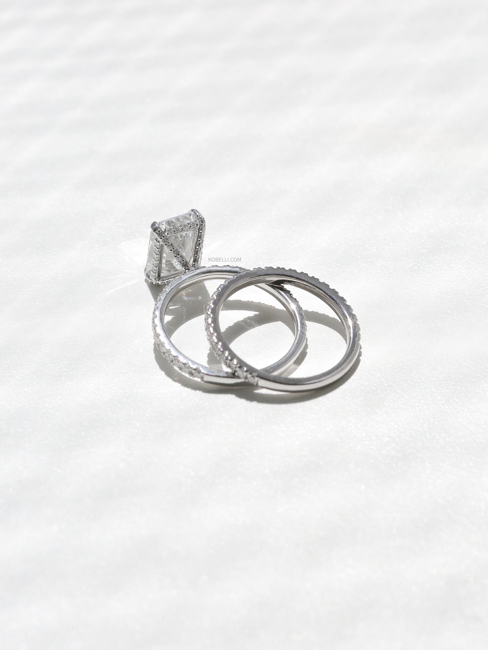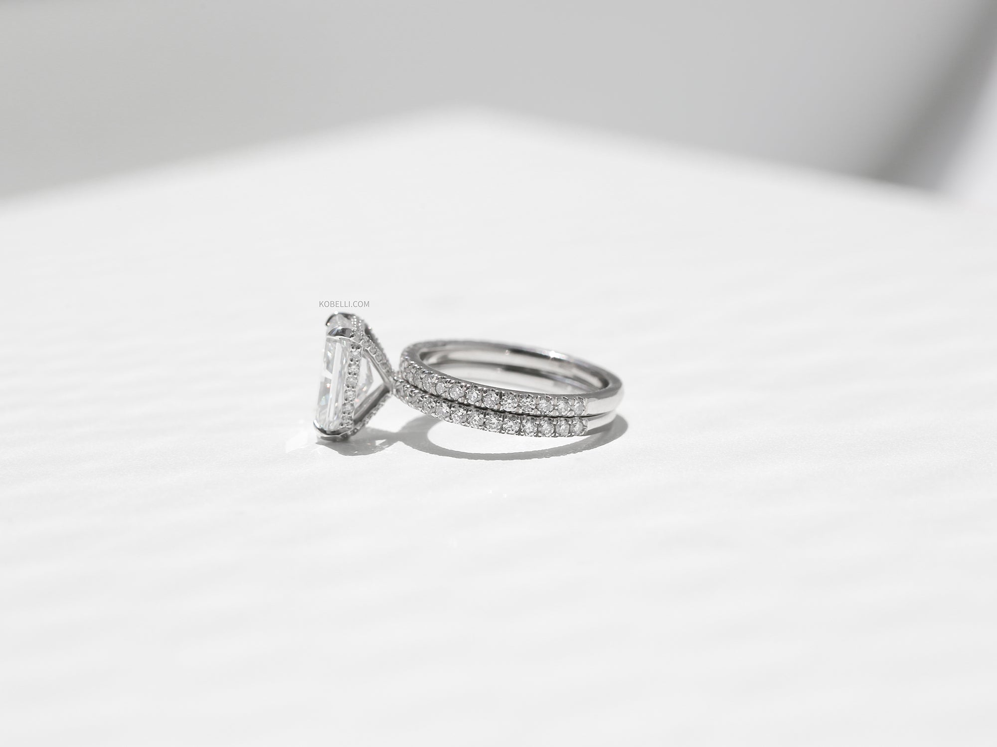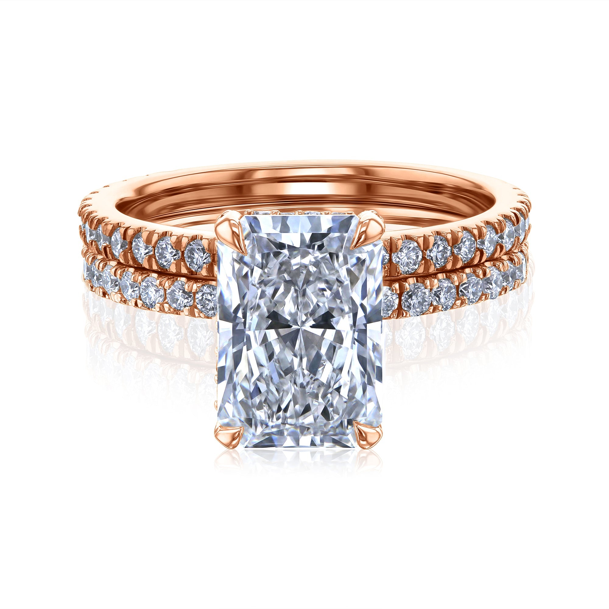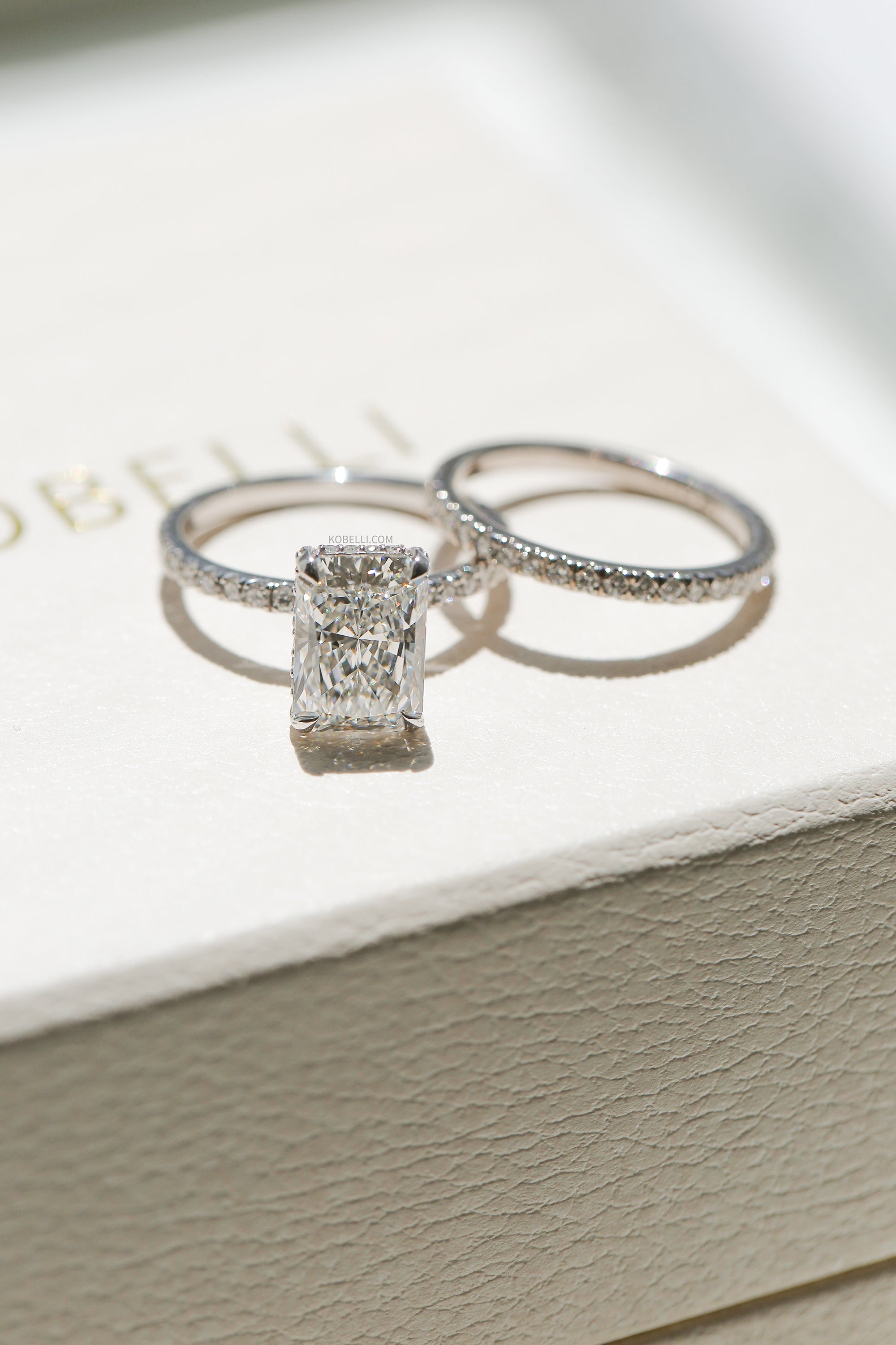 The Elongated Riri engagement ring features a breathtakingly crisp radiant brilliant-cut diamond center stone with a hidden halo of additional diamonds in a slim basket setting. The basket and shank are illuminated with pavé lab-grown diamonds in a design we call, a hidden wrap halo. The diamonds along the band are set in a semi-eternity fashion ensuring a diamond sparkle in every movement under the sun.