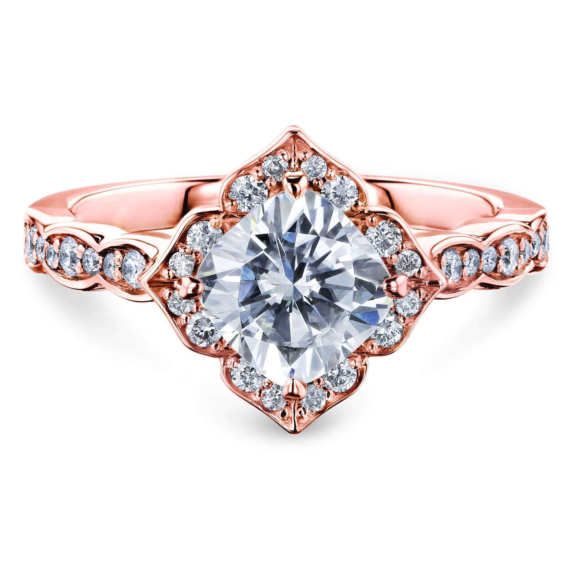 Four pointed petal formations draw a halo around the center cushion-cut gemstone on this regal solid gold engagement ring. The cushion shaped center stone is a lab created moissanite, whereas, all the smaller surrounding stones are entirely natural earth mined diamonds. Opting for a moissanite at the center allows for the ultimate sparkle and clarity with respects to the highly controlled environment the stone was created in. Decorating the ring with an abundance of real natural earth mined diamonds brings a traditional sense of foreverness and rarity one would most often search to associate with her chosen wedding rings.