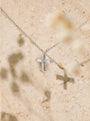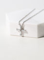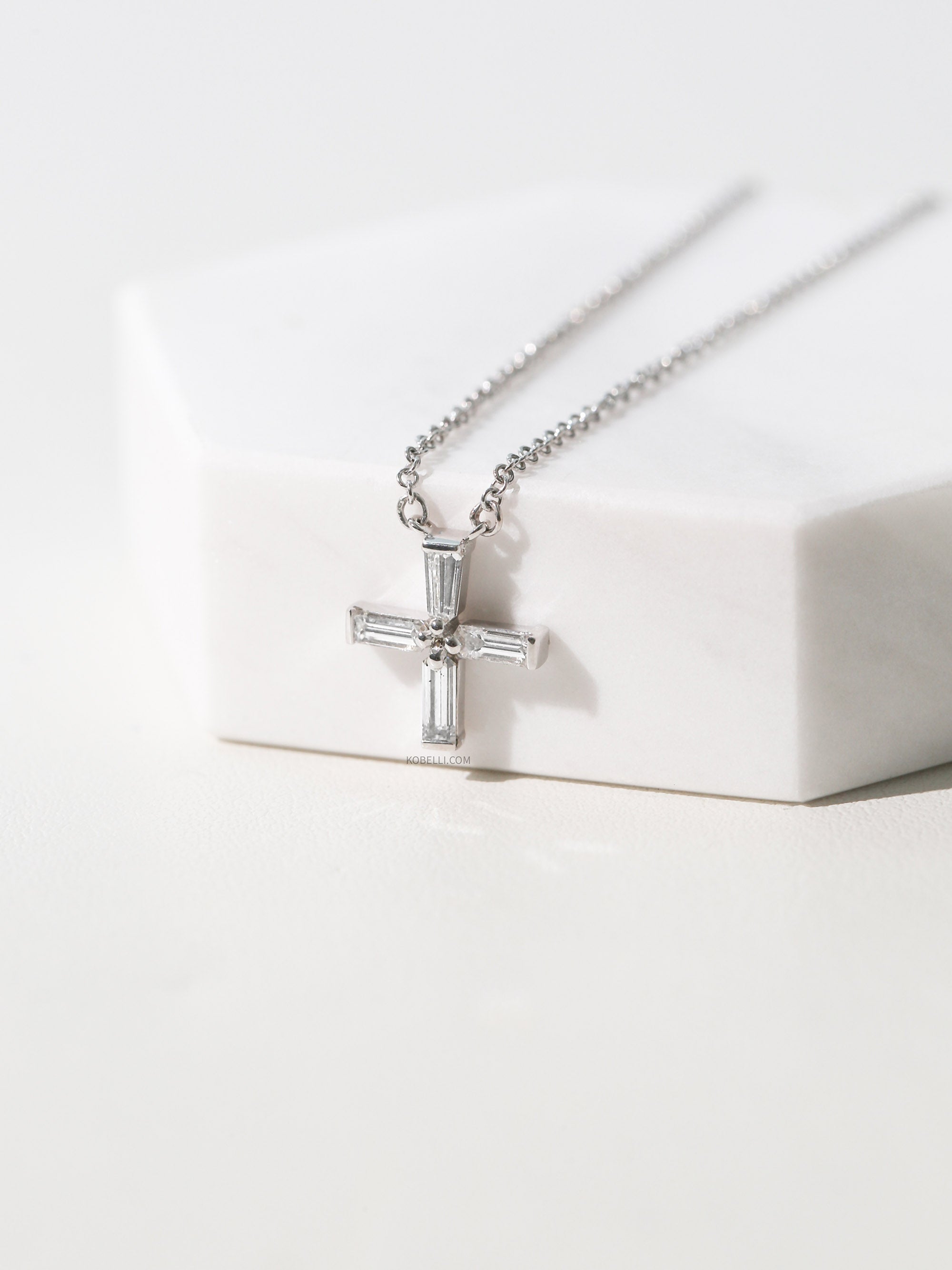 Four tapered baguette diamonds join together forming a windmill cross design in solid 14k white gold metal. This simple yet alluring piece showcases elegant design in stylish luxury jewelry.