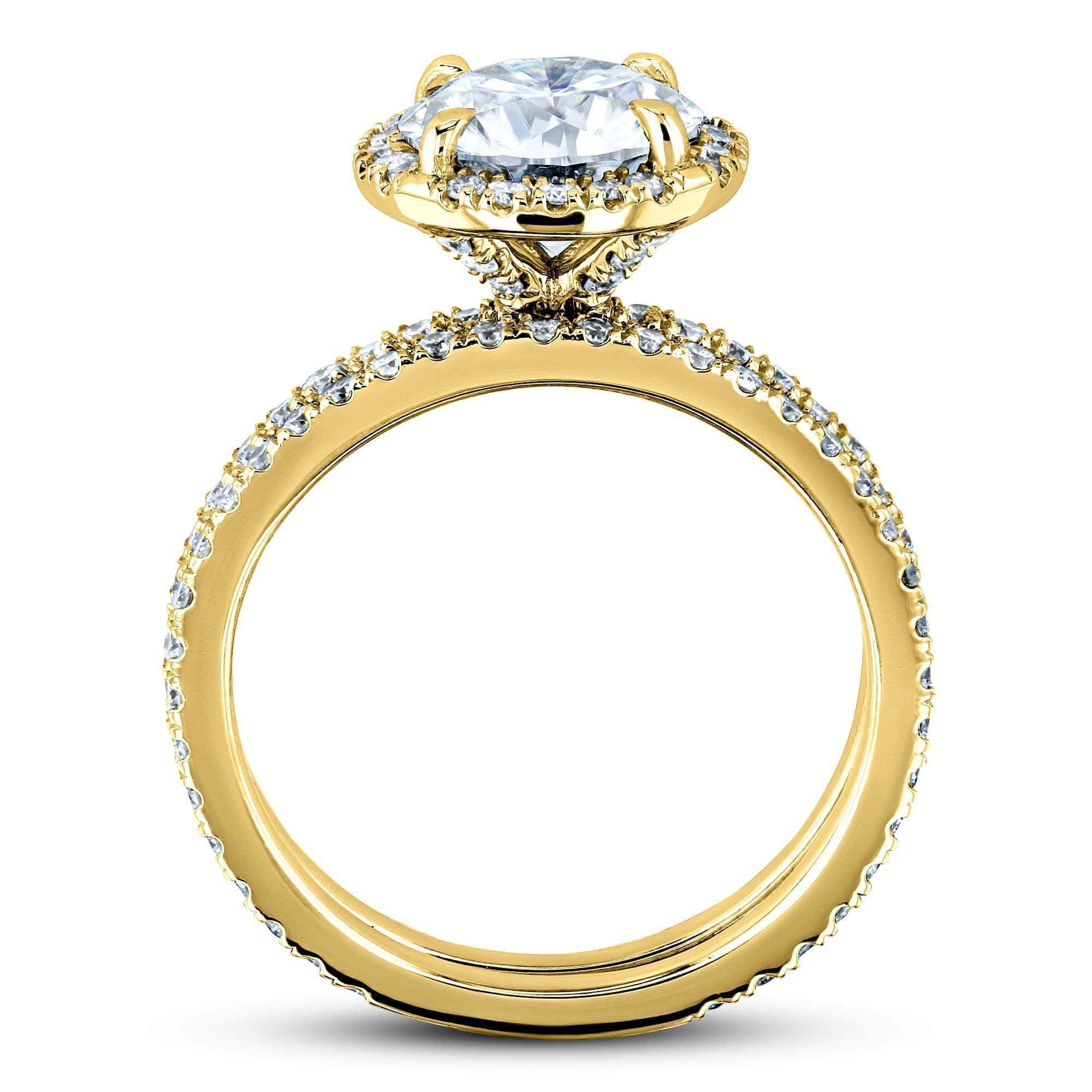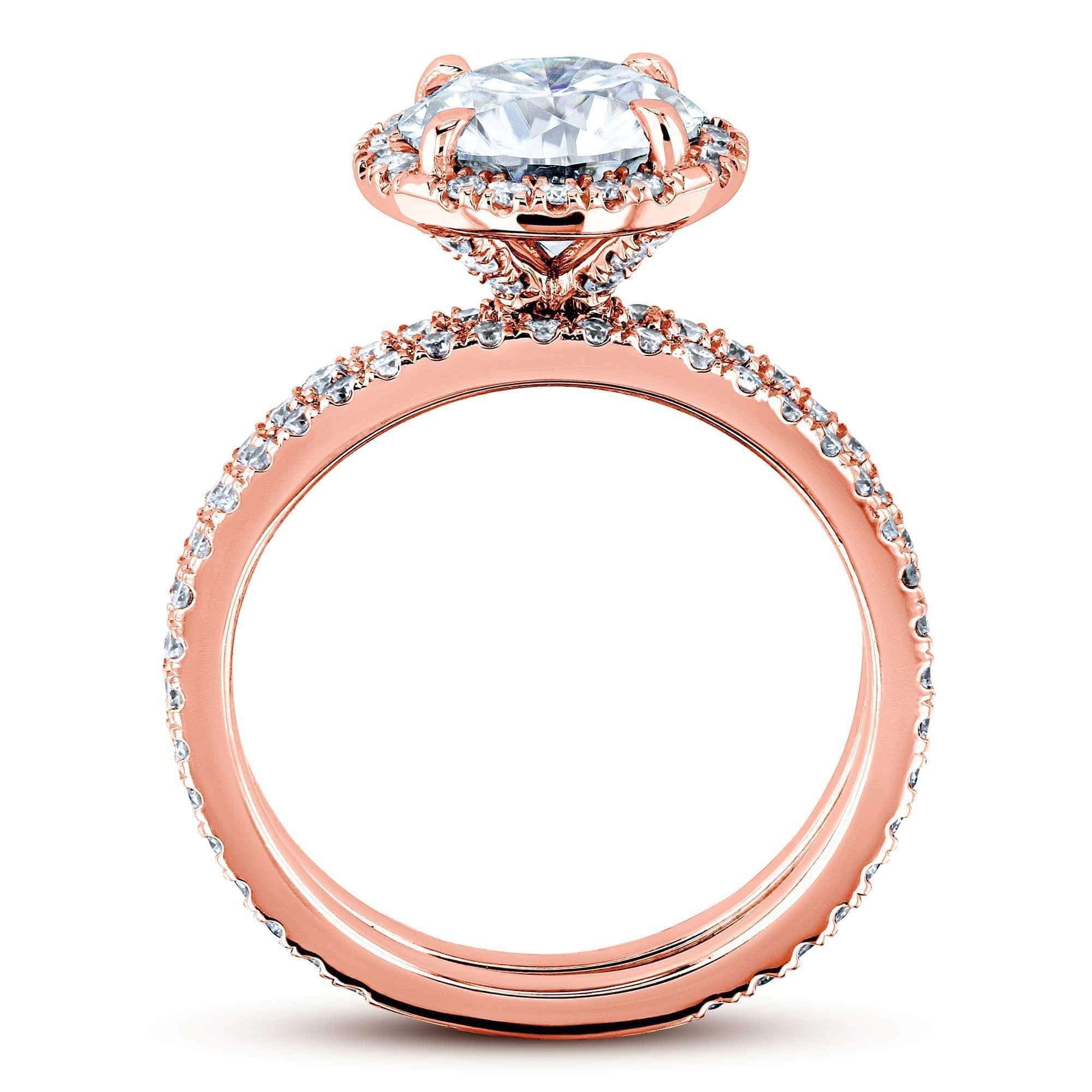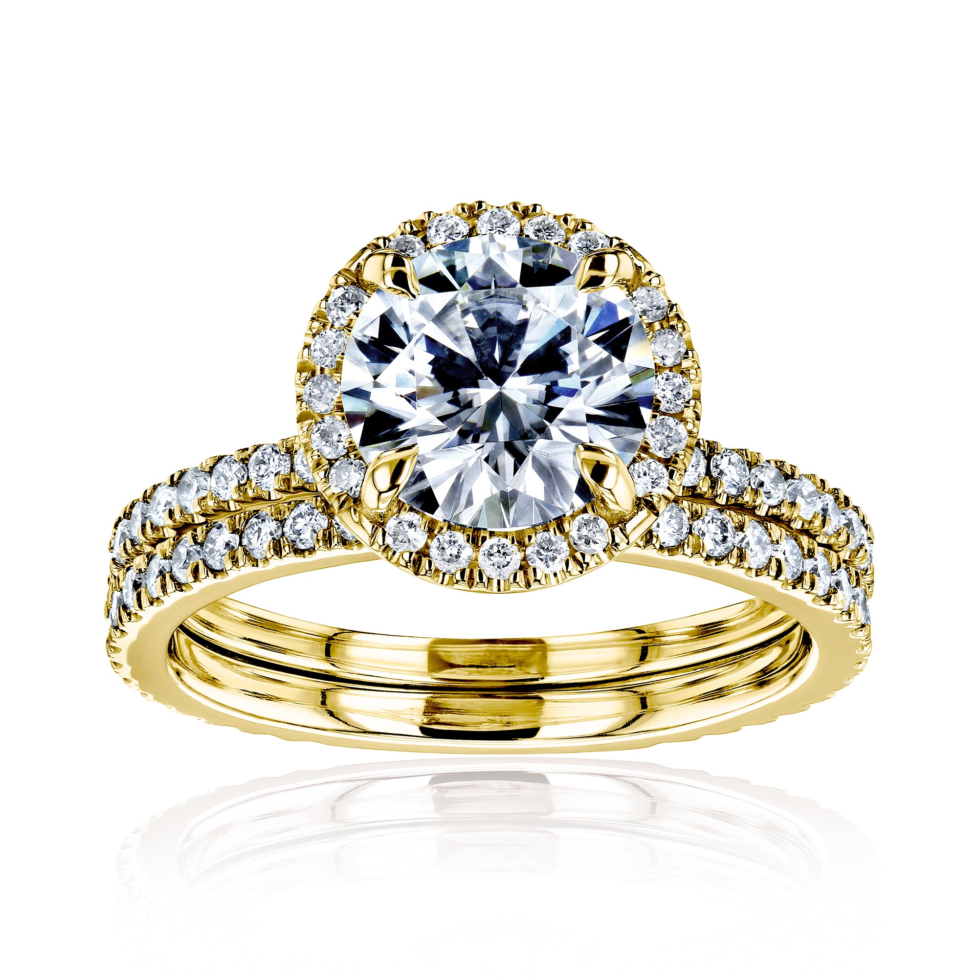 Diamond lined prongs carry the floating center halo matching the center stone in their lab-grown origins. The one-and-a-half carat diamond tops the engagement ring in a glory of sparkles with its pristine core. Sixty-eight round white diamonds comprise the rest of the engagement ring while thirty-eight diamonds line the wedding band. The diamonds create a magnificent halo and wrap both bands from top to bottom in a near-eternity design. A small solid gold space along the bottom of the rings allows room for any necessary resizing in the future. The rings are made with solid 14-karat gold and are finished with a shining high polish for the iconic bridal look.