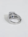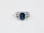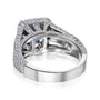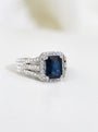 An emerald-cut blue sapphire centers this white diamond setting in 14-karat white gold. The antique framework showcases rows of diamonds on every face of the ring and a double split shank design.